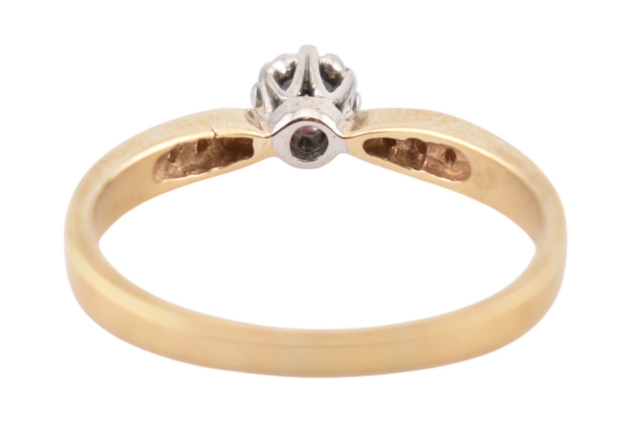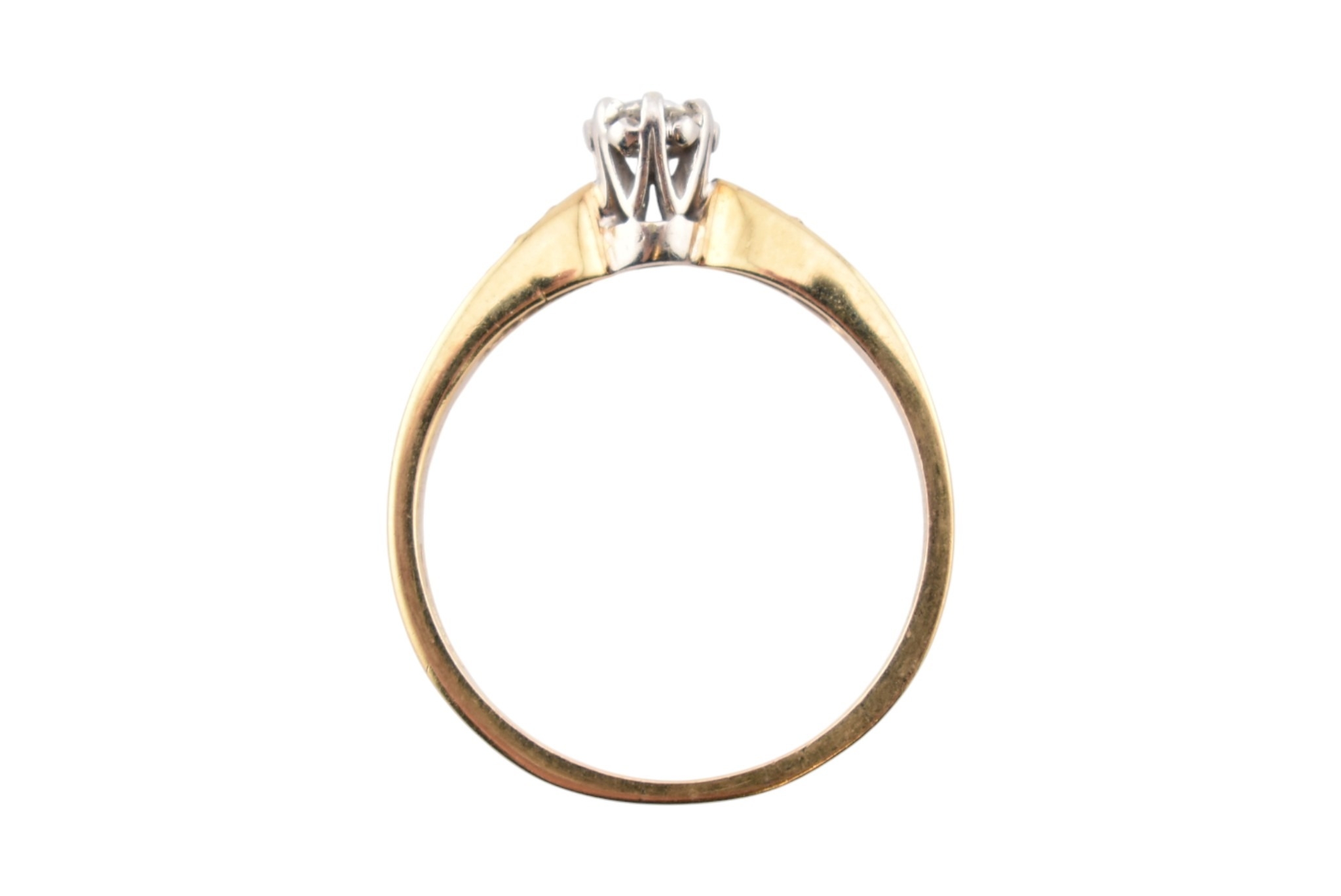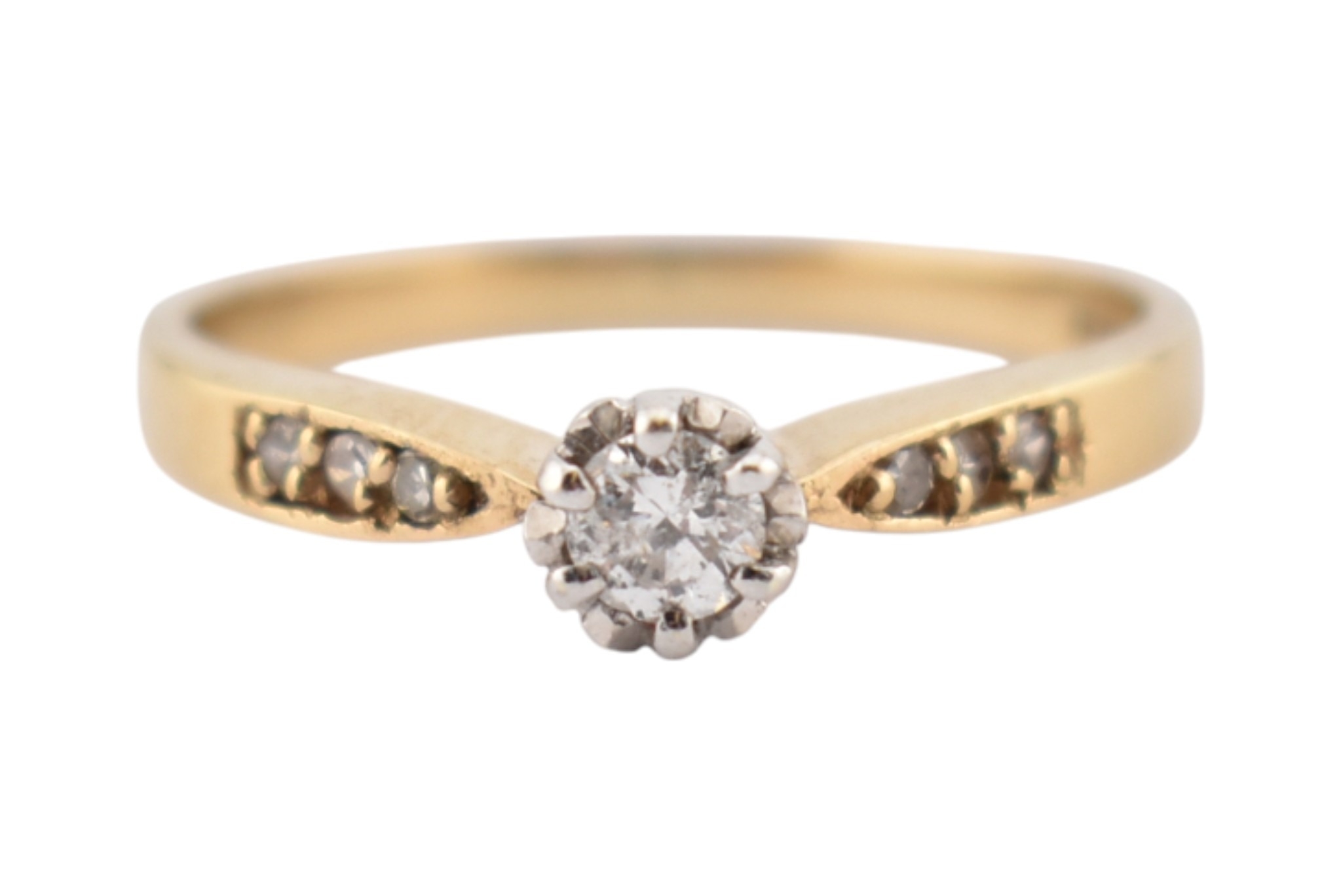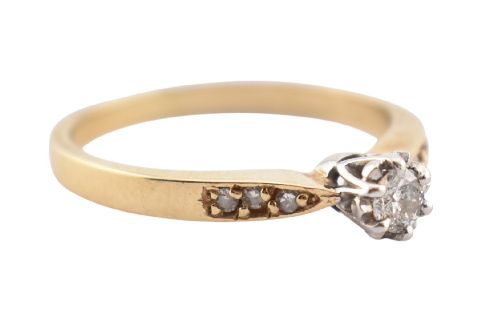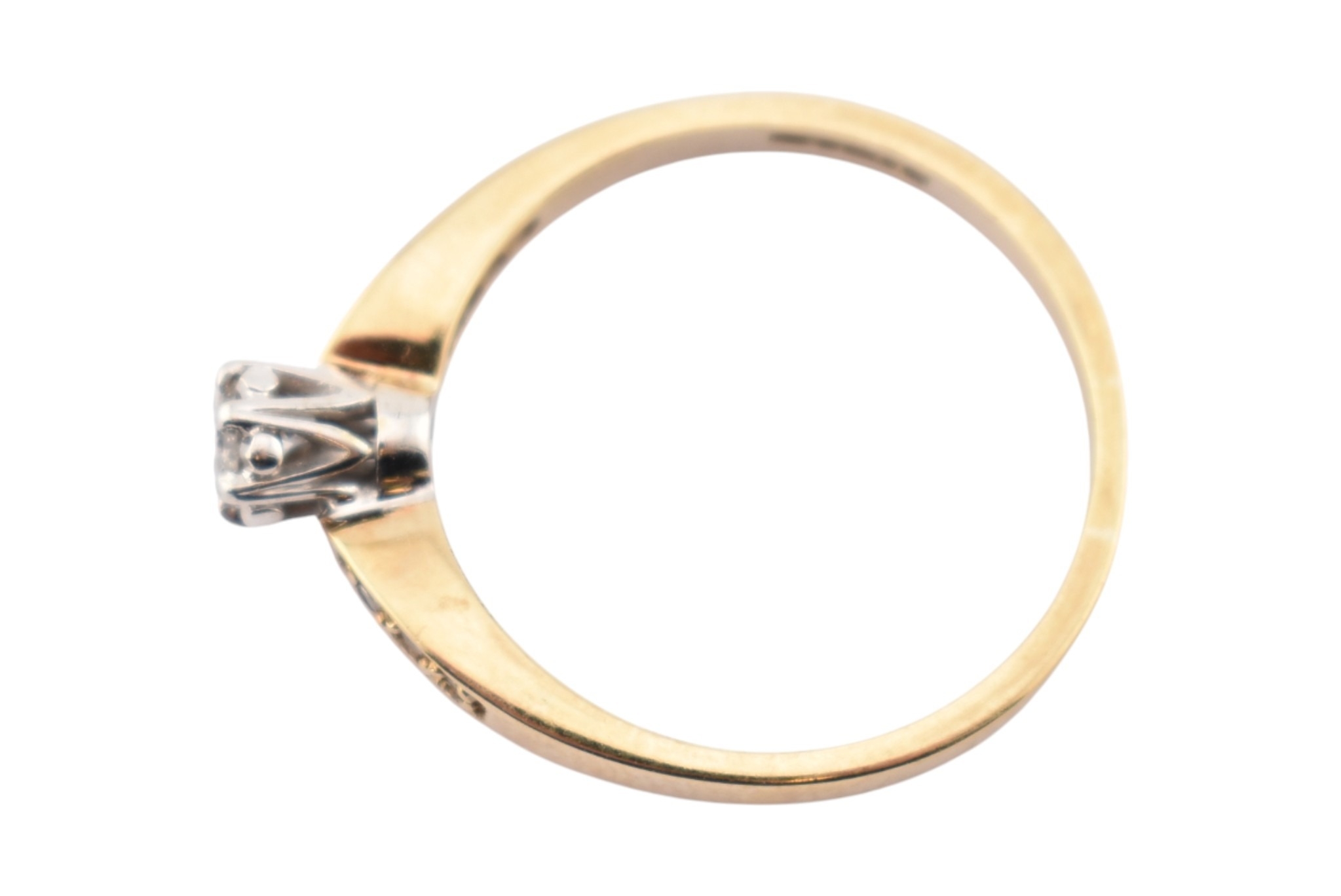 A hallmarked 9ct gold and diamond solitaire ring. The ring having diamond set shoulders. Weight 2.7g. Size S