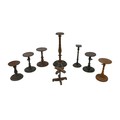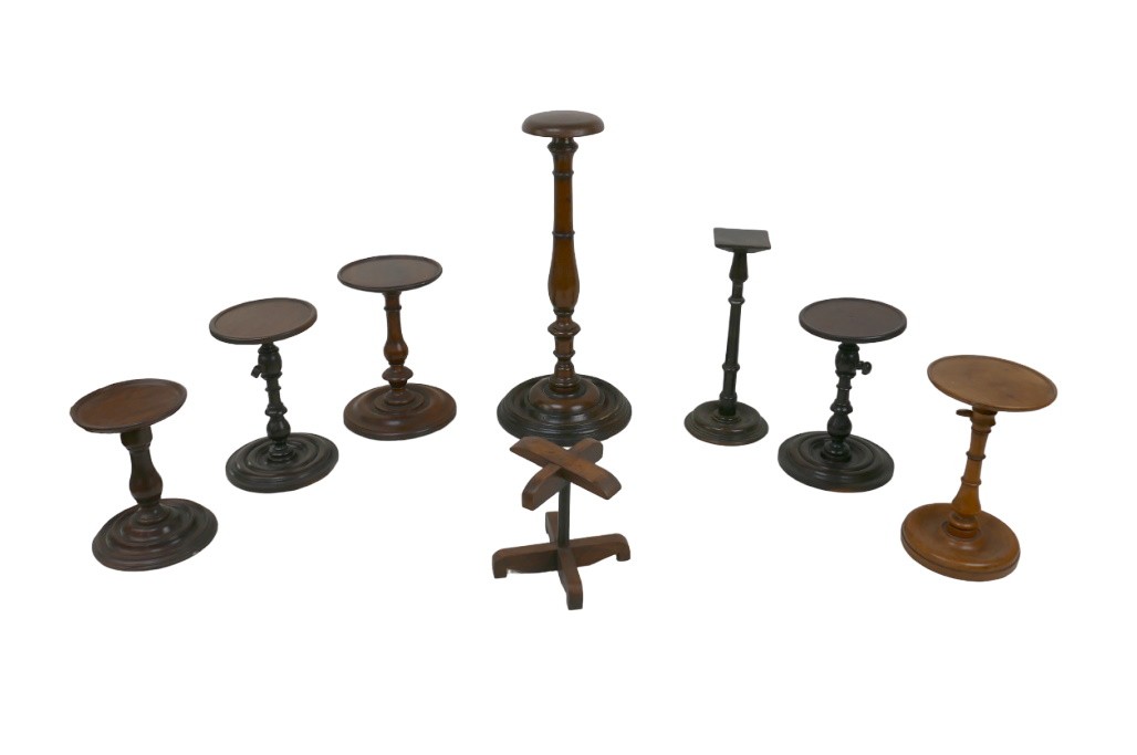 A collection of wooden wig stands and candlestick holders, including a 19th century mahogany wig stand with turned column and circular base, 21 by 46.5cm high. (8)