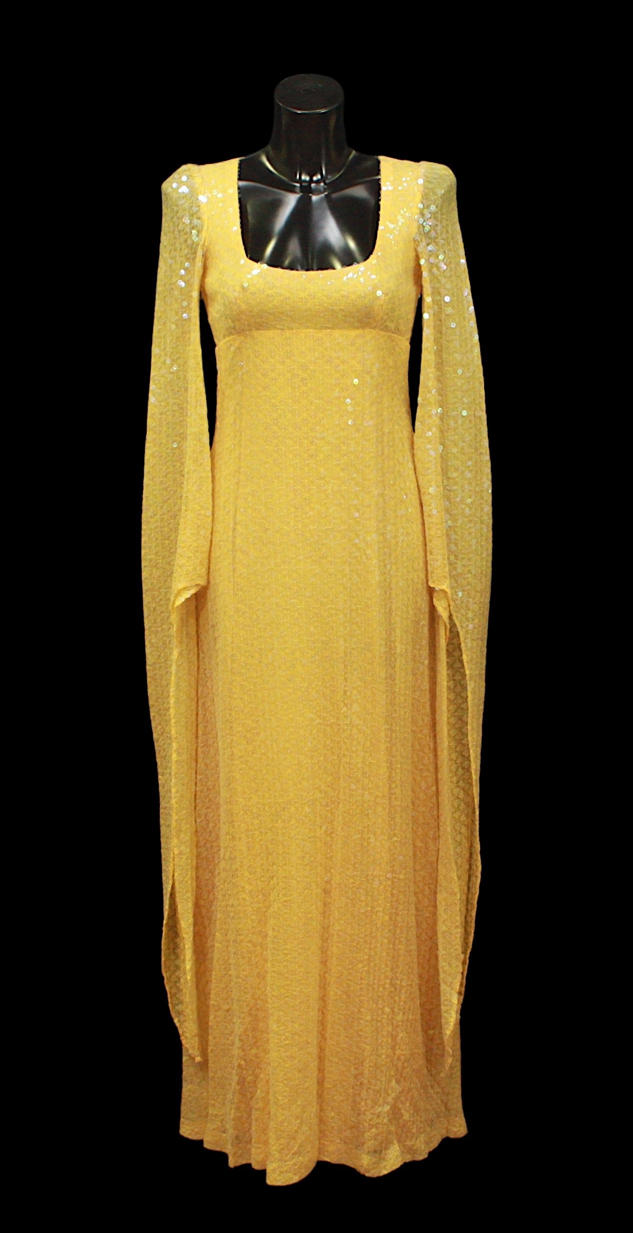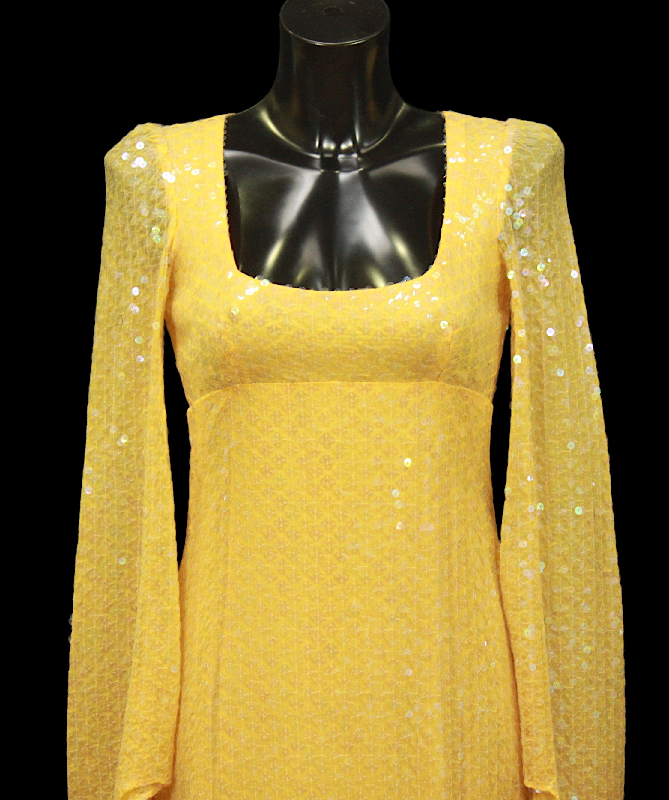 Vintage Fashion/ Stage Costume: A yellow sequinned full length gown/ maxi dress,