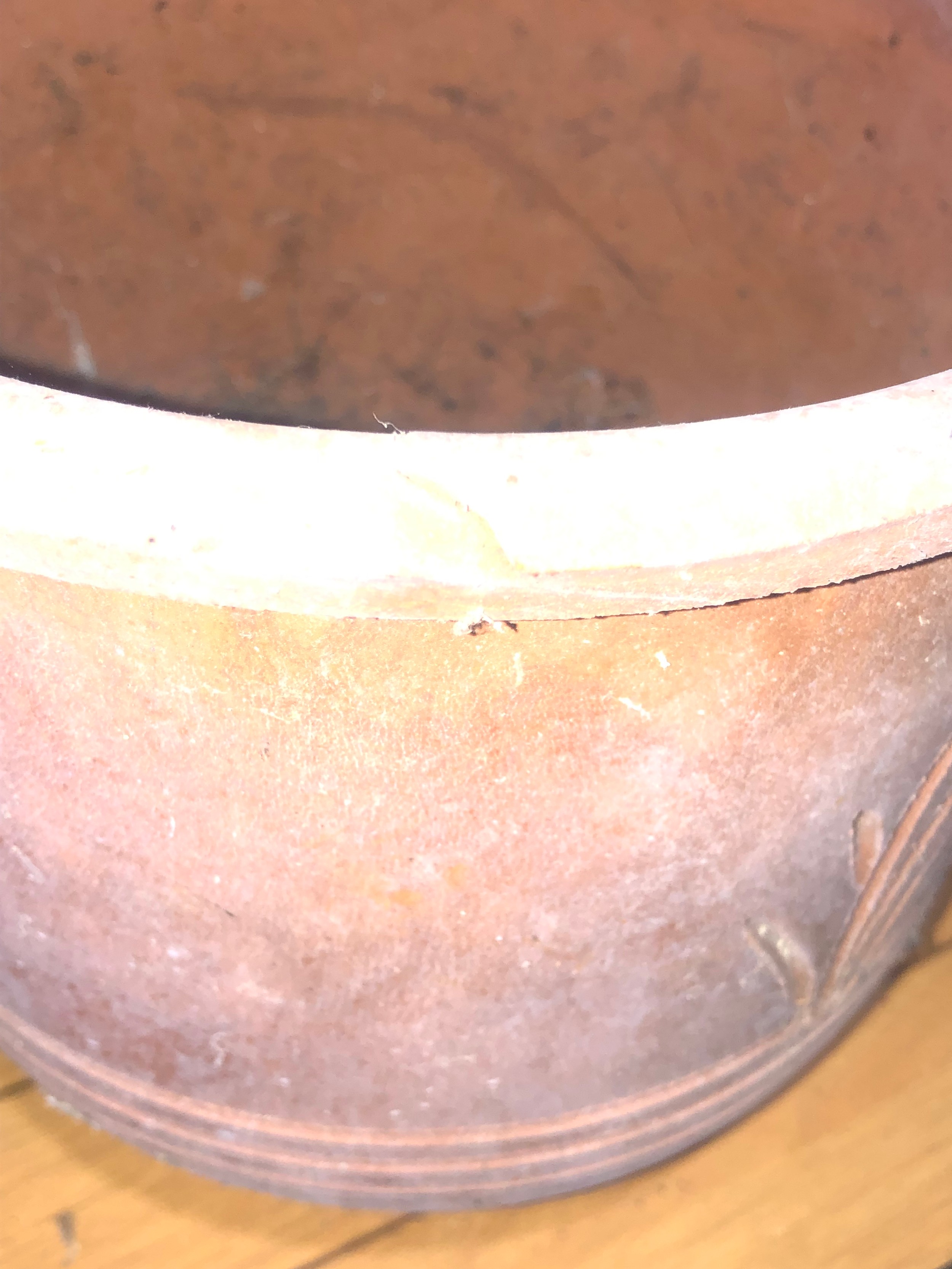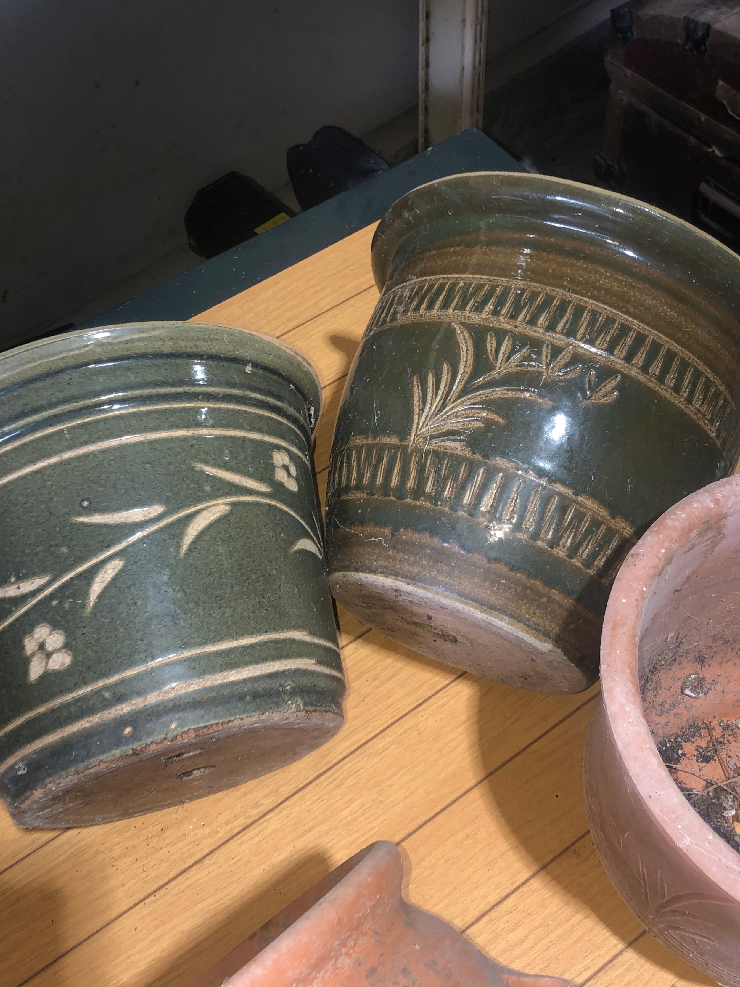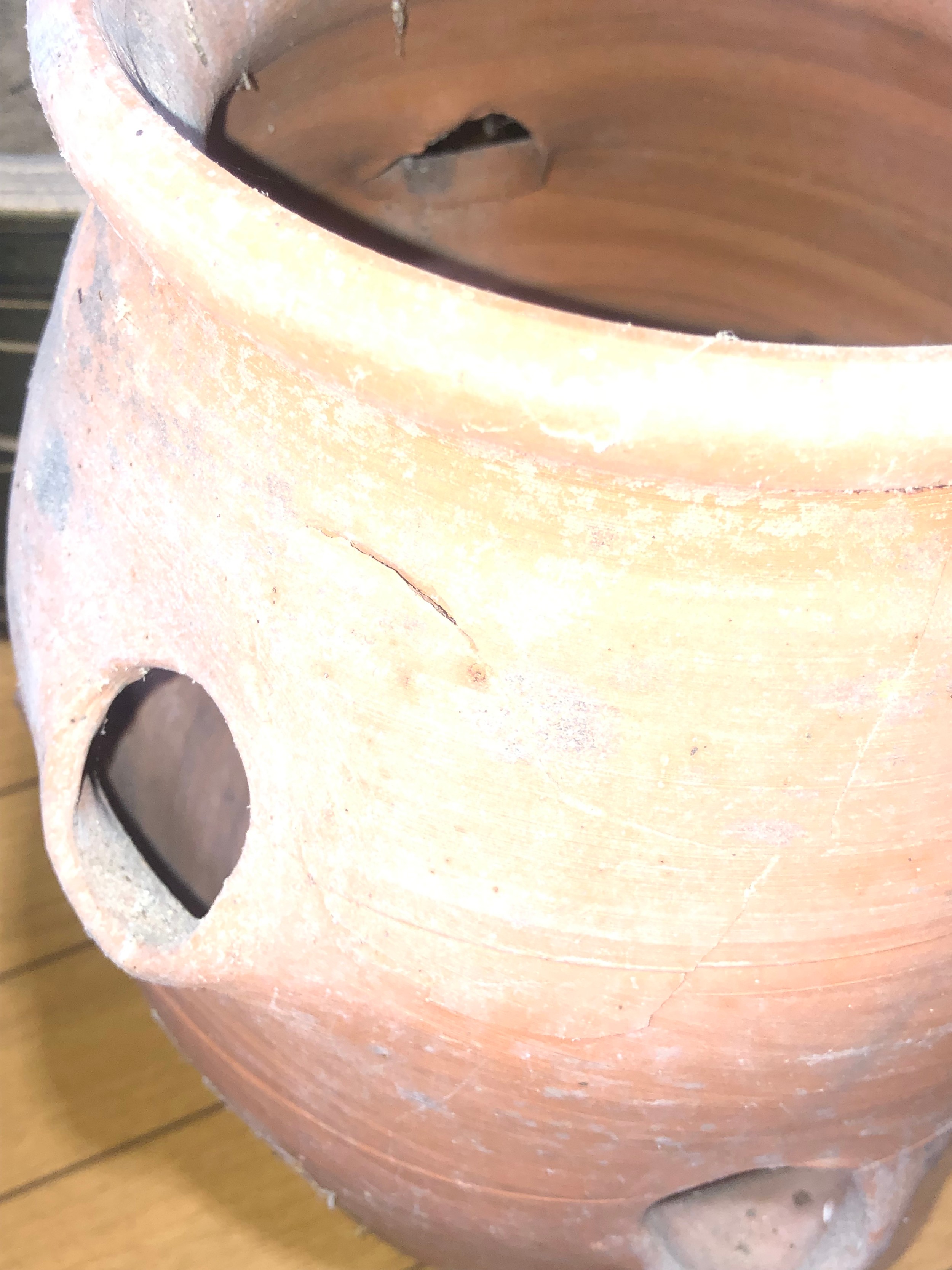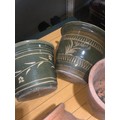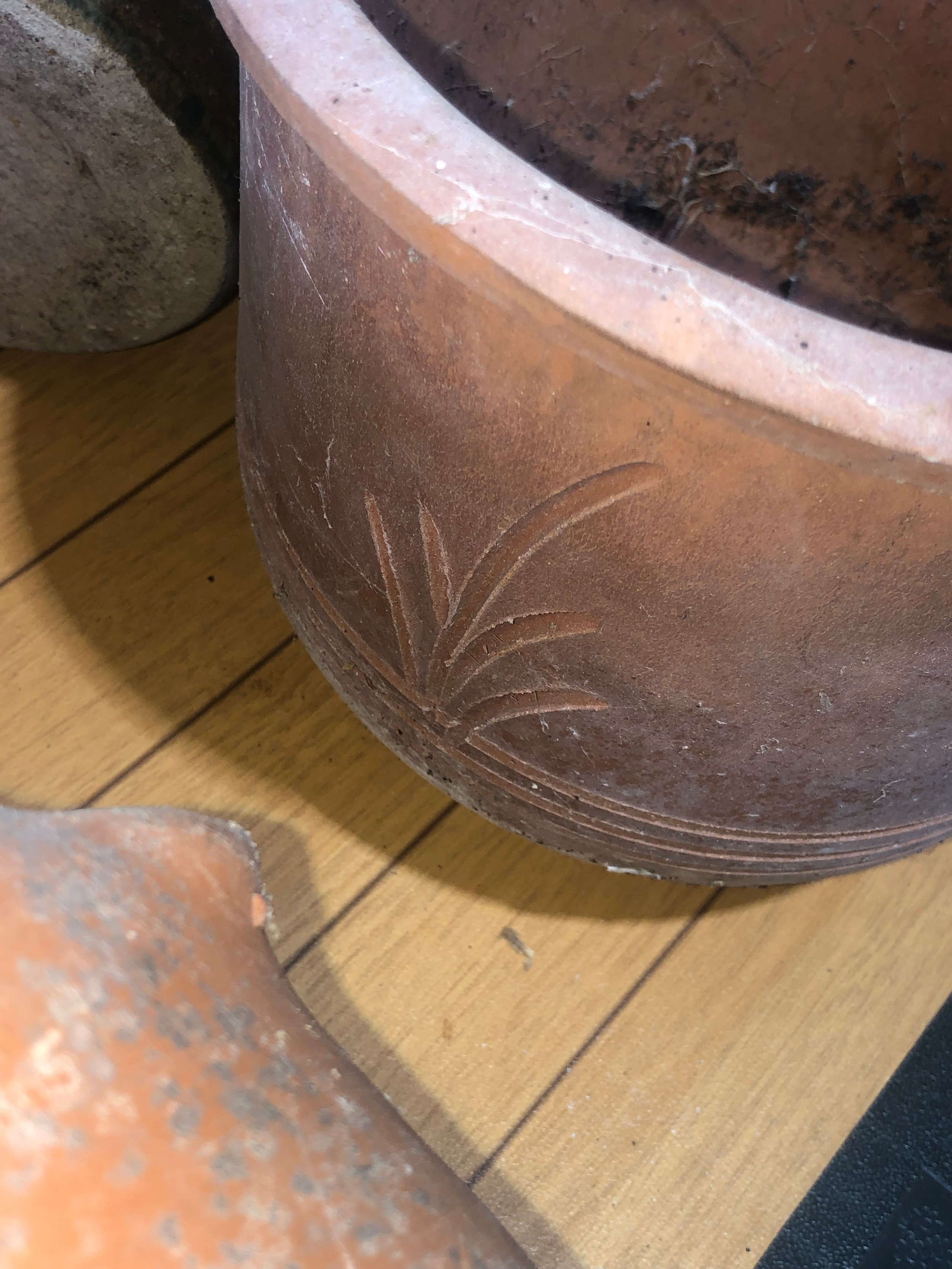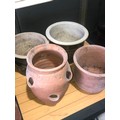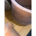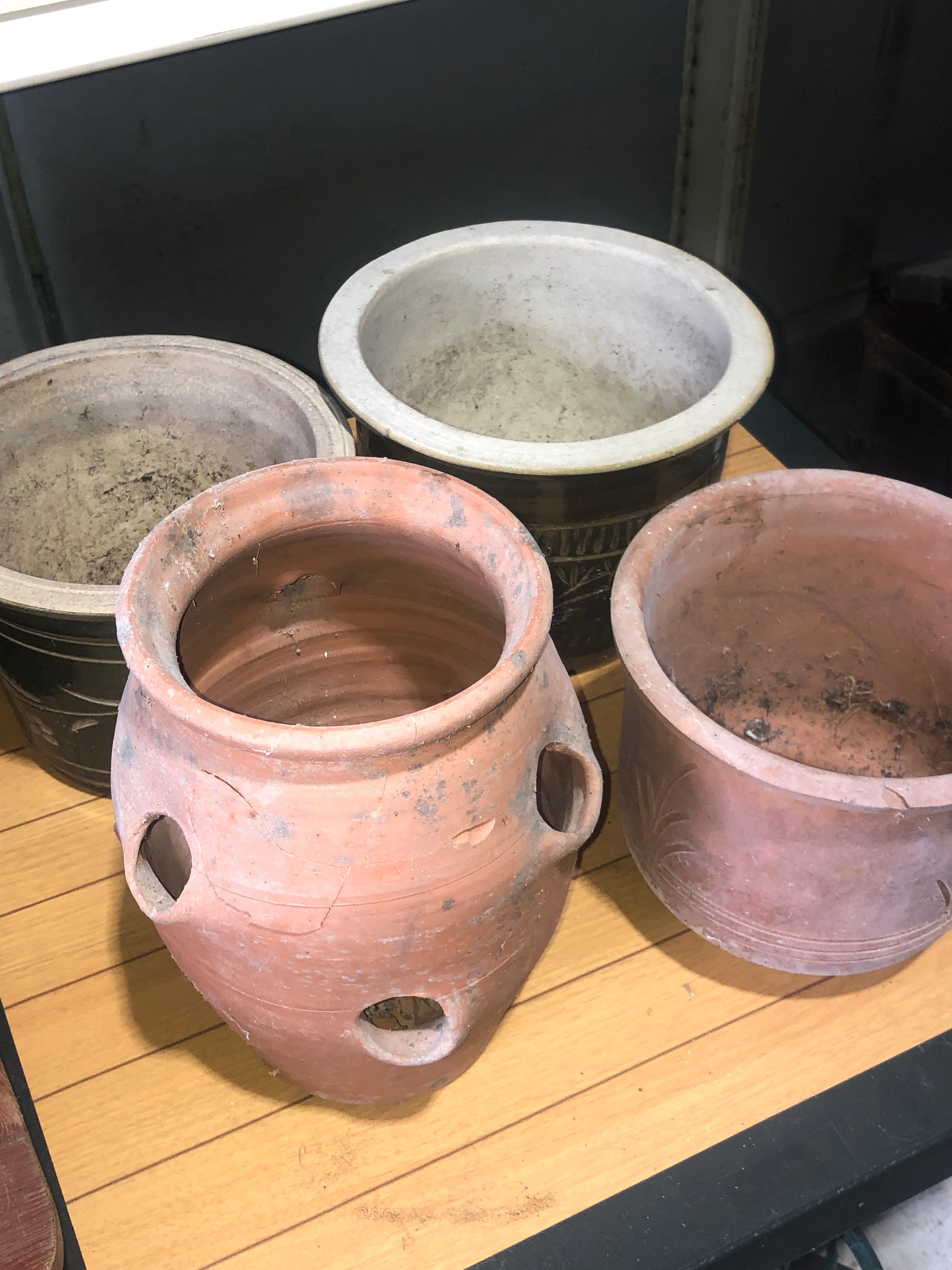 Planters and flower pots. Note the crack in the Strawberry planter