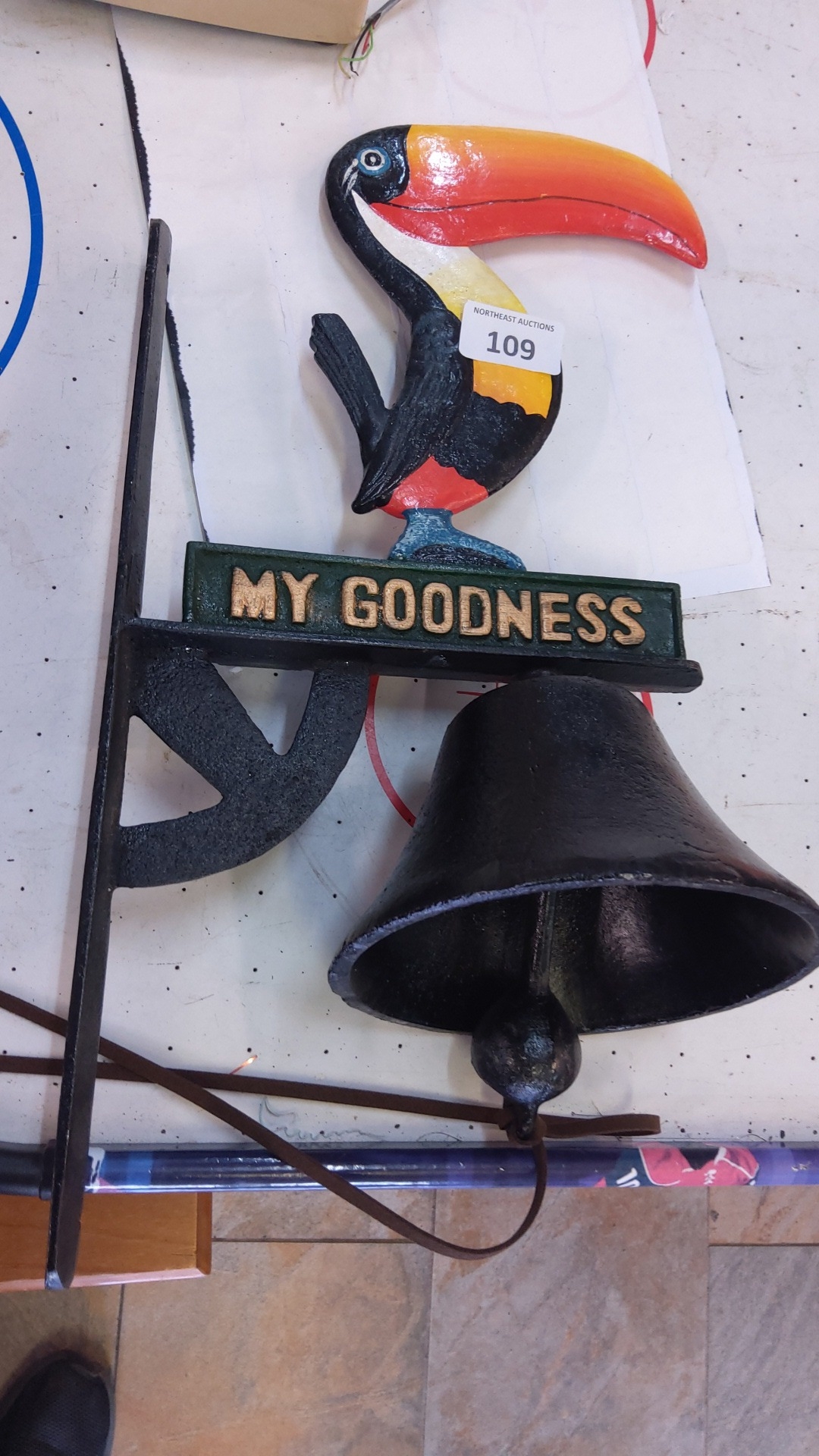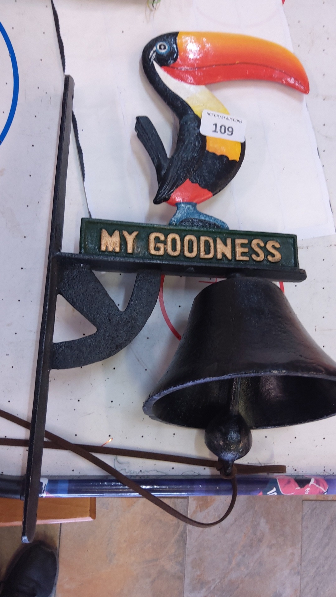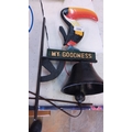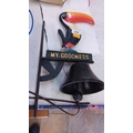 Cast-iron wall-mounted bell bracketed with a polychrome toucan finial above a raised-letter plaque reading 'MY GOODNESS', the bell suspended beneath a shaped support.