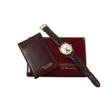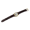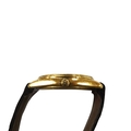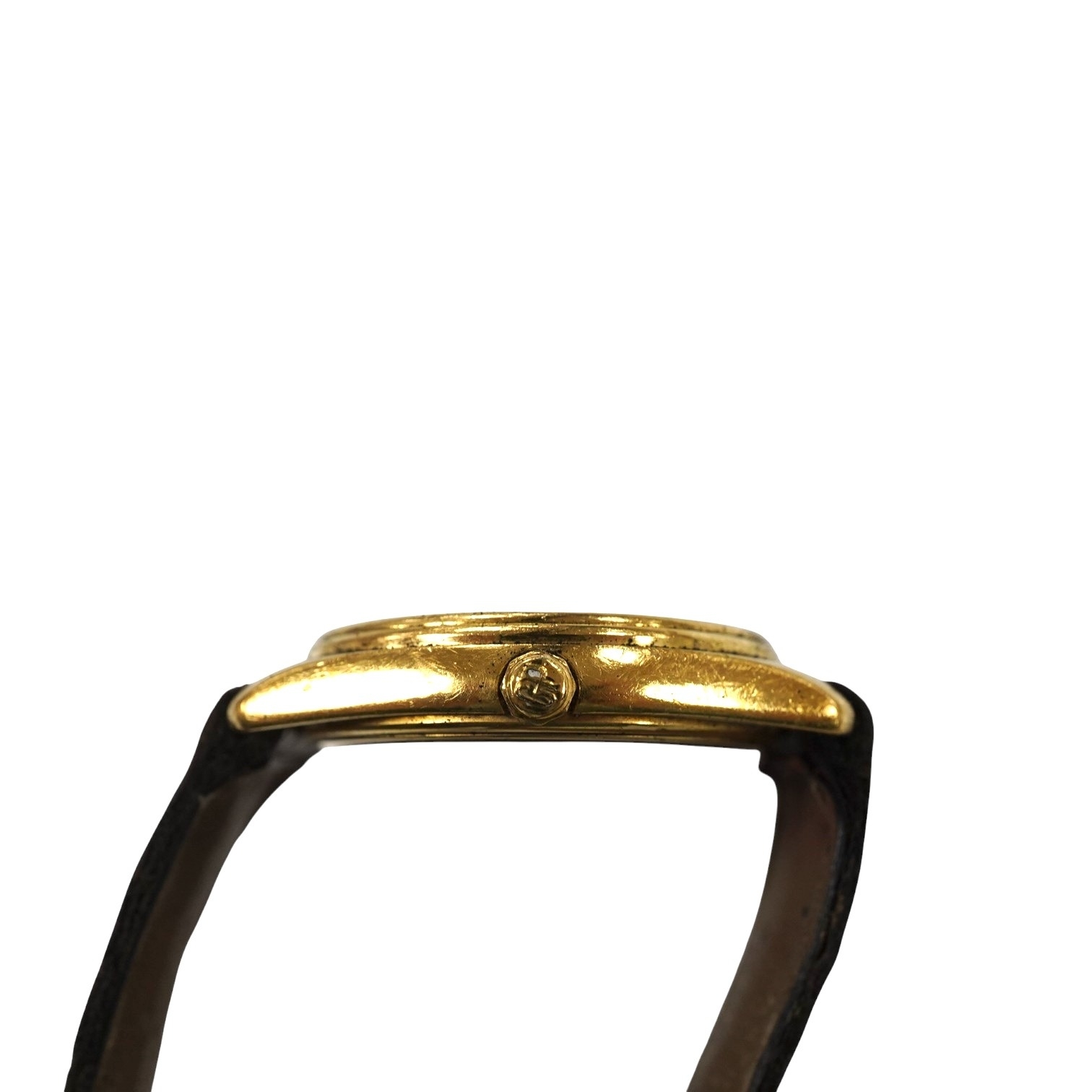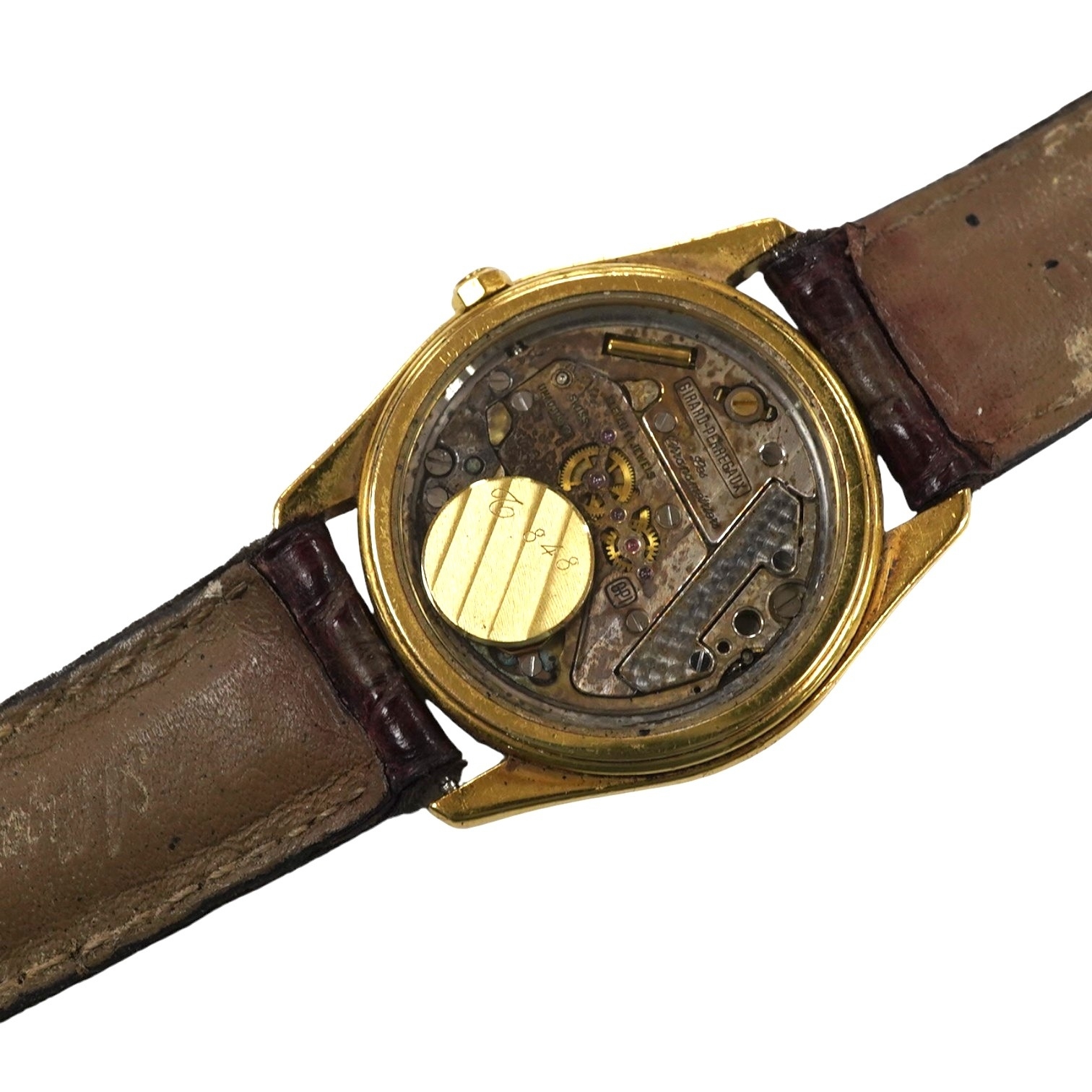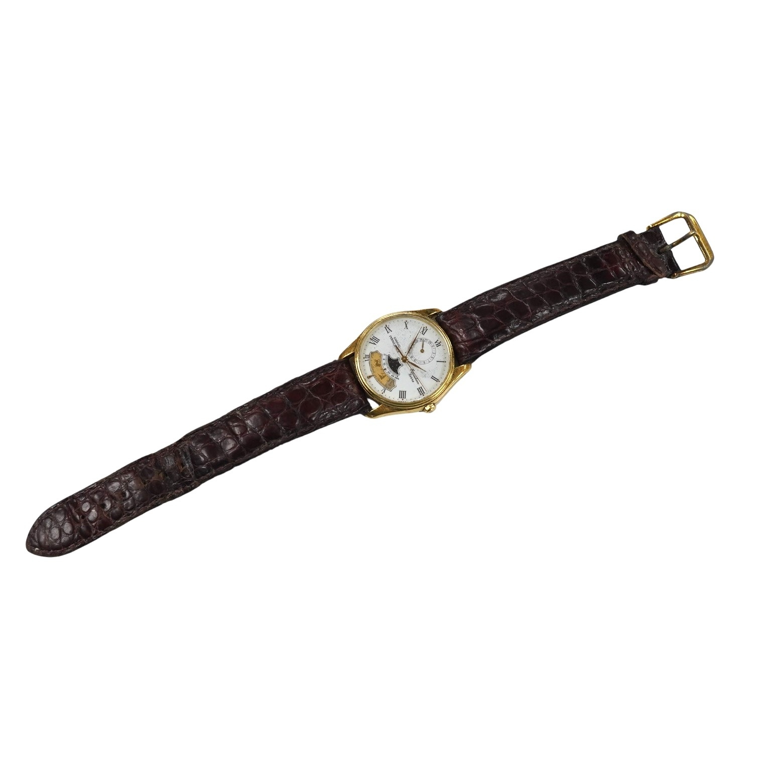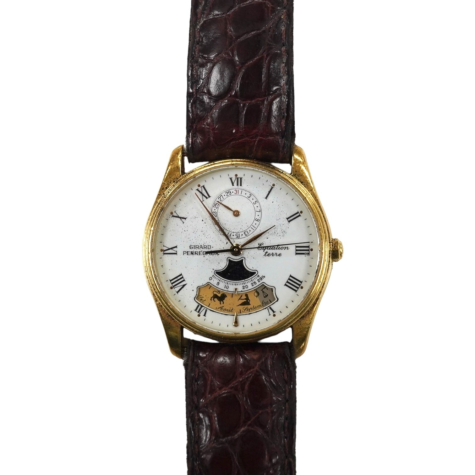 A gentleman's 1980's 18k gold Girard Perregaux Equation Terre quartz wrist watch, with Roman dial, subsidiary date dial, moonphase and month aperture, movement a.f., case diameter 32mm, on an associated leather strap, with box and some papers.