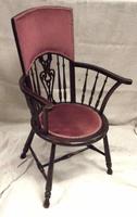 Edwardian beech framed elbow chair with shaped top rail over pierced splat and spindle back, outswept open arms, upholstered pad seat, turned supports and stretchers.