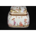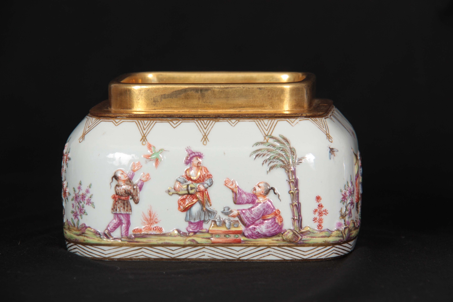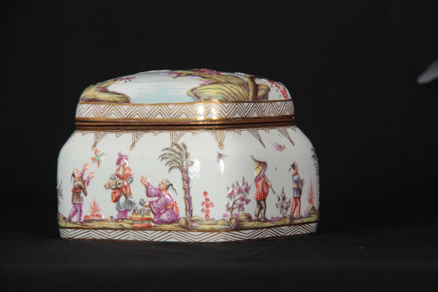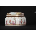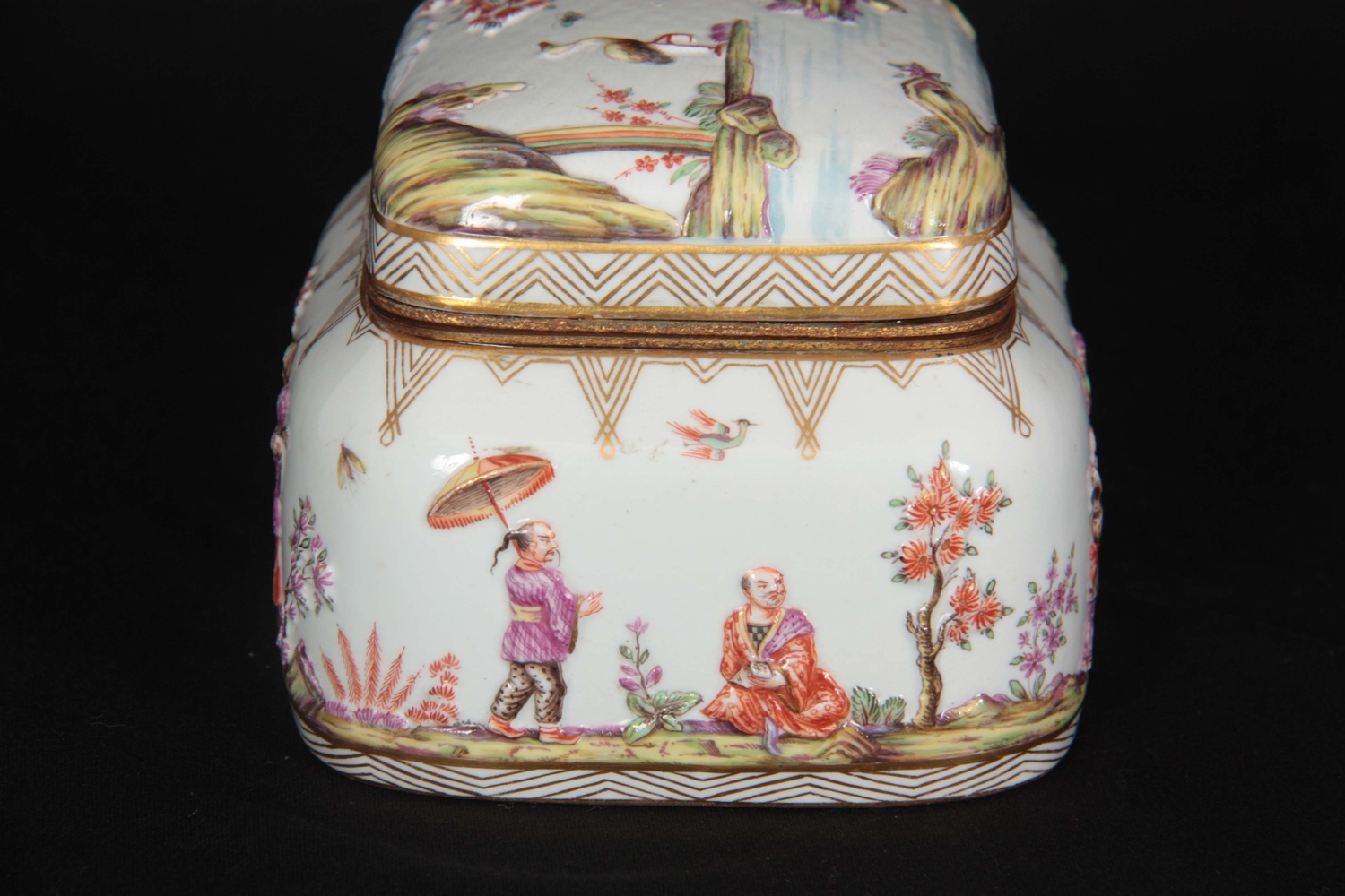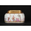 A 19TH CENTURY MEISSEN GILT METAL MOUNTED CASKET AND COVER of shouldered rectangular form with rounded pull-off cover, the body with all-over decoration of relief moulded chinoiserie figures in garden and river landscape settings within gilded hatched borders in the 18th century style 13.5cm by 11.5cm 10.5cm high