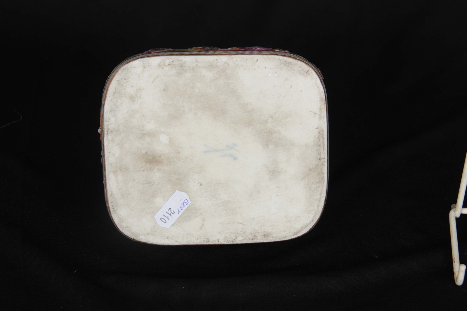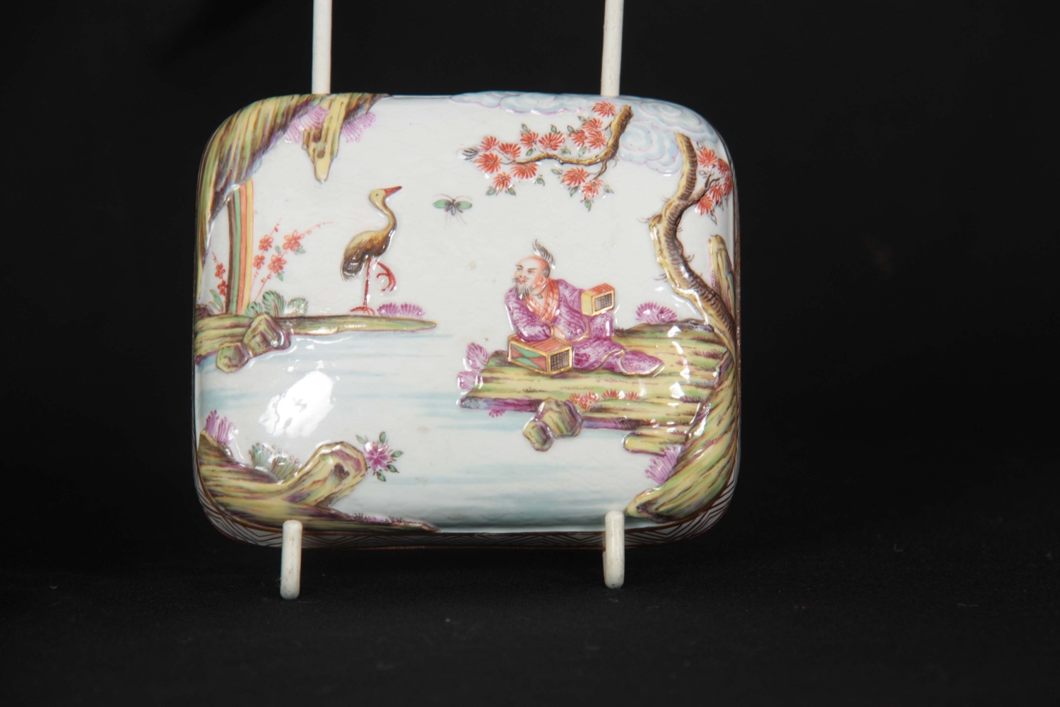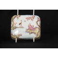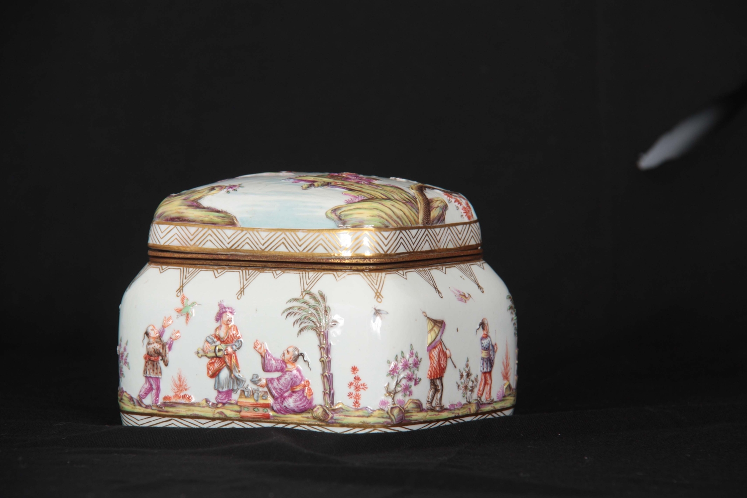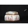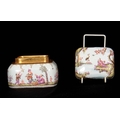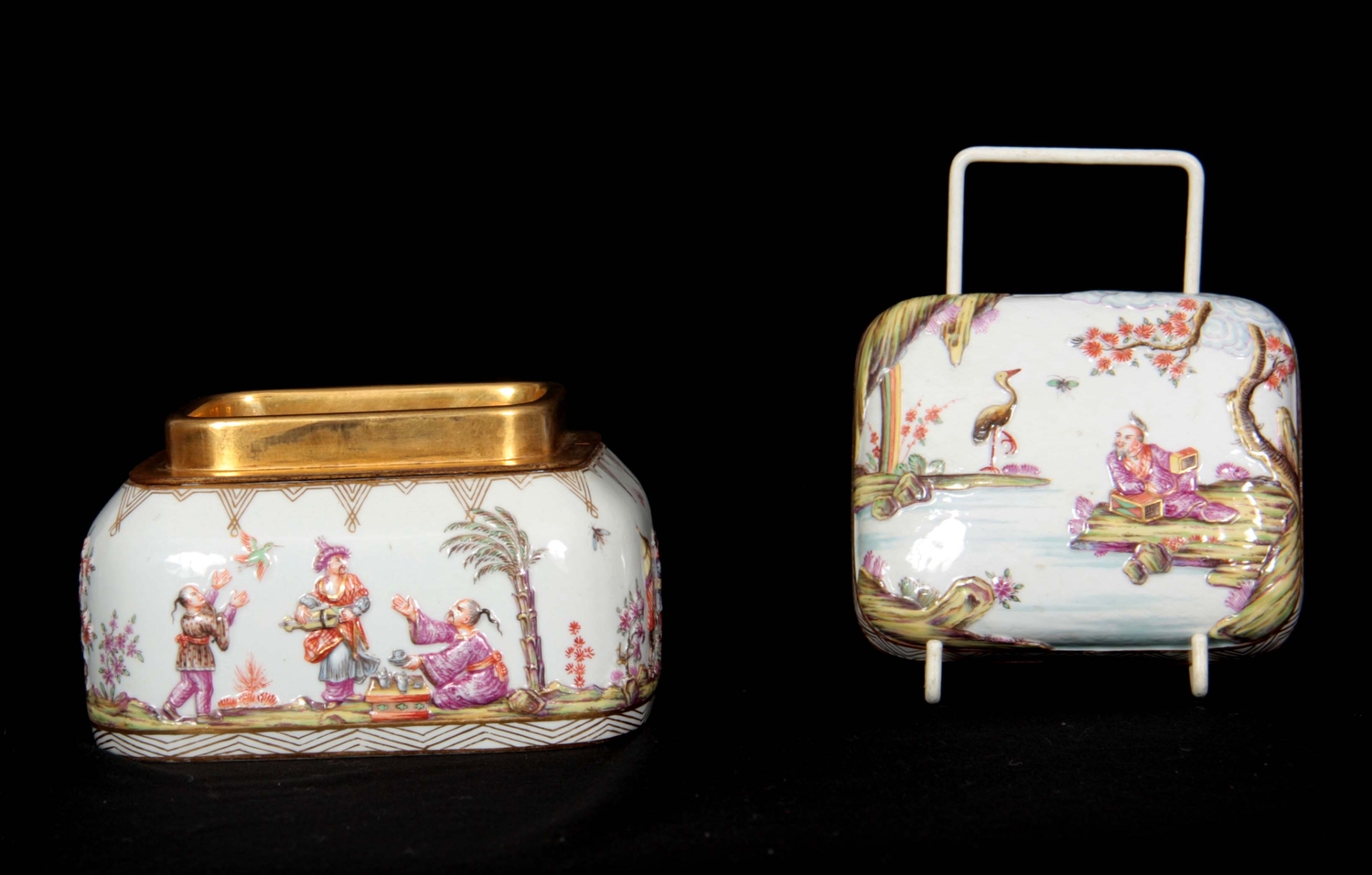 A 19TH CENTURY MEISSEN GILT METAL MOUNTED CASKET AND COVER of shouldered rectangular form with rounded pull-off cover, the body with all-over decoration of relief moulded chinoiserie figures in garden and river landscape settings within gilded hatched borders in the 18th century style 13.5cm by 11.5cm 10.5cm high