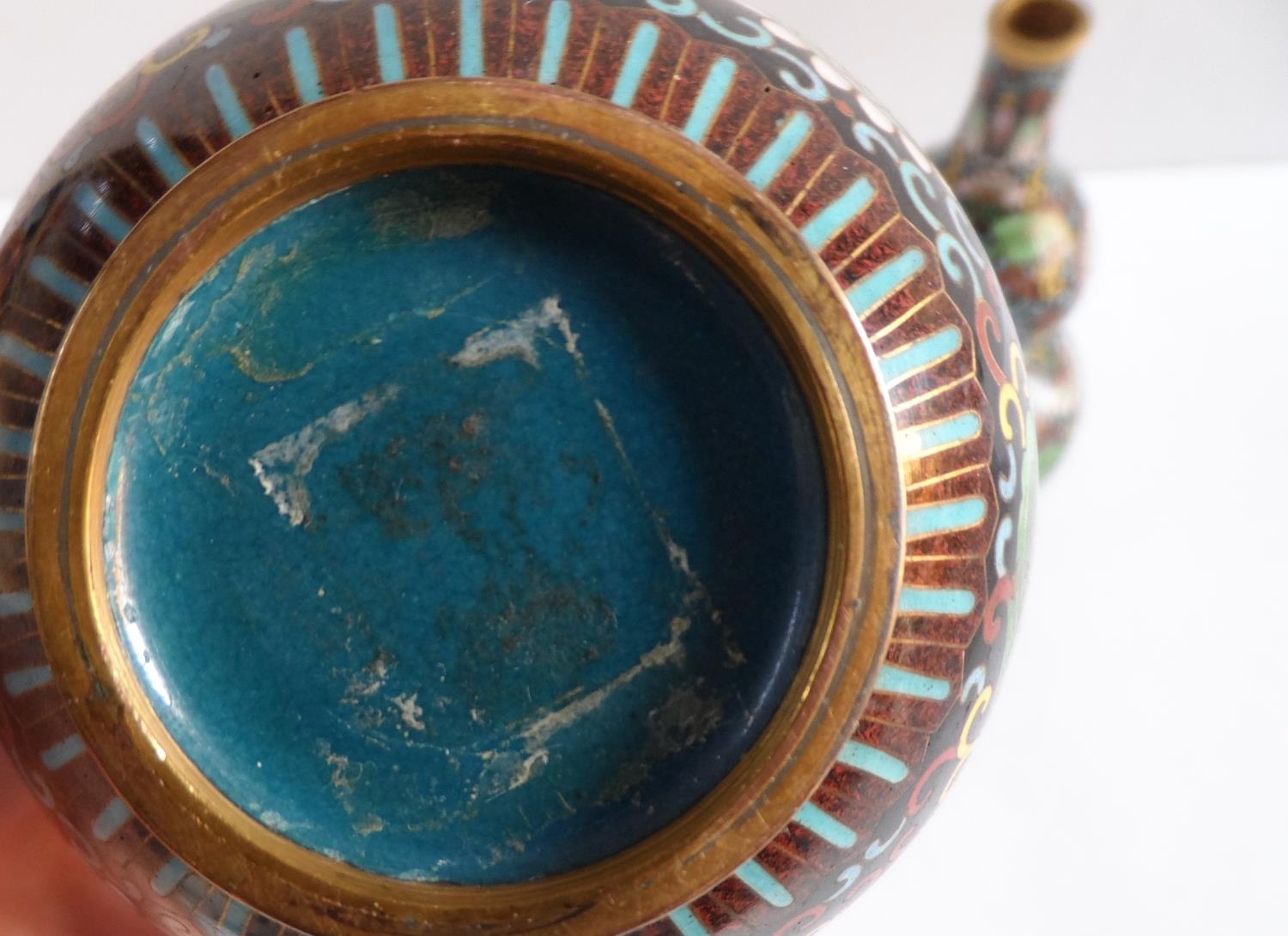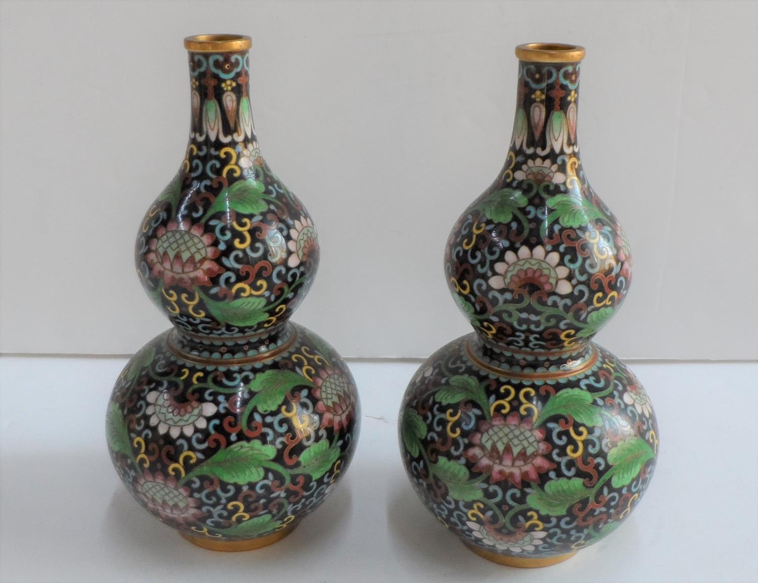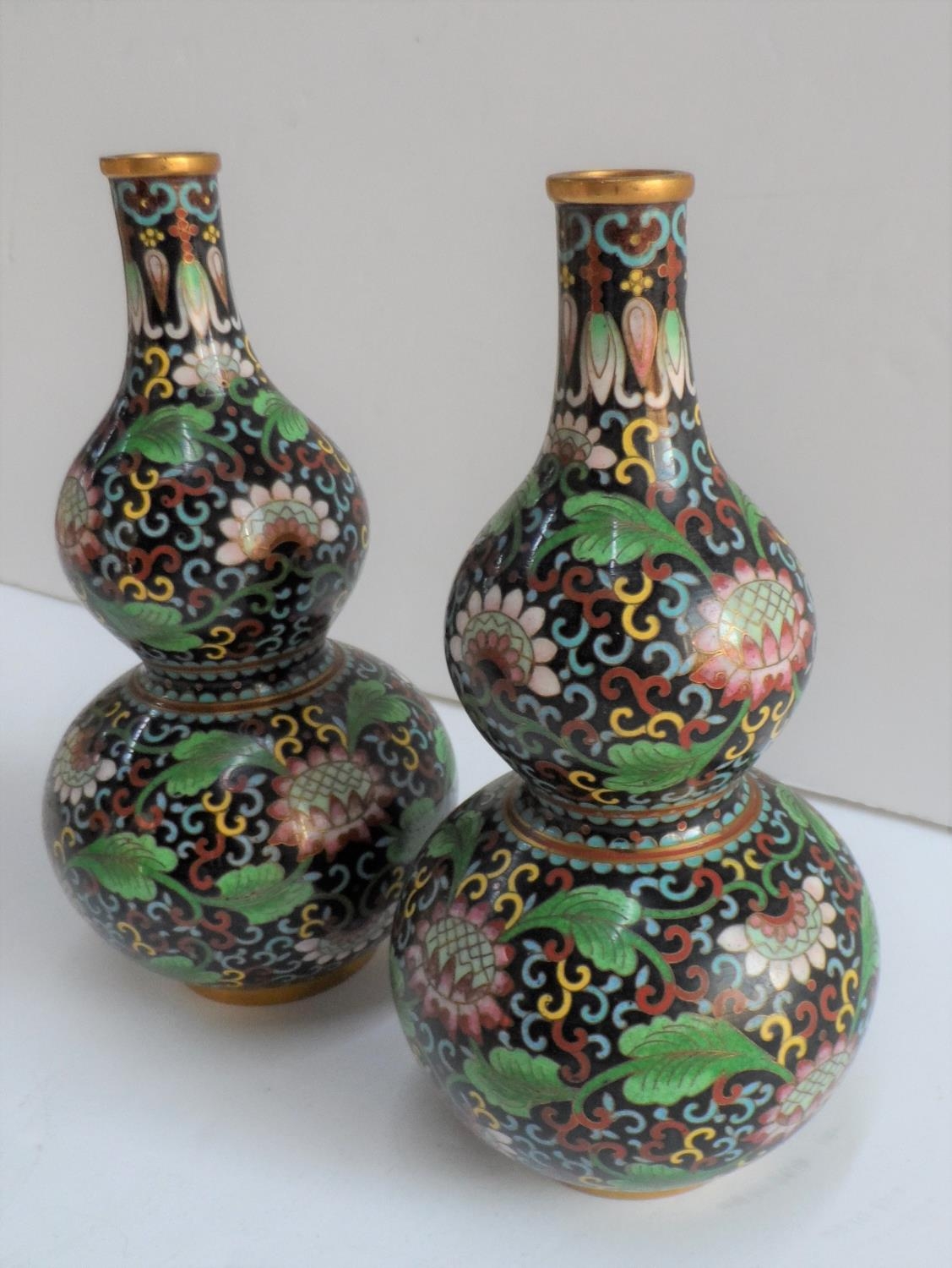 Pair of small, unmarked, Oriental double gourd cloisonné vases (2),Both 17 cm tall