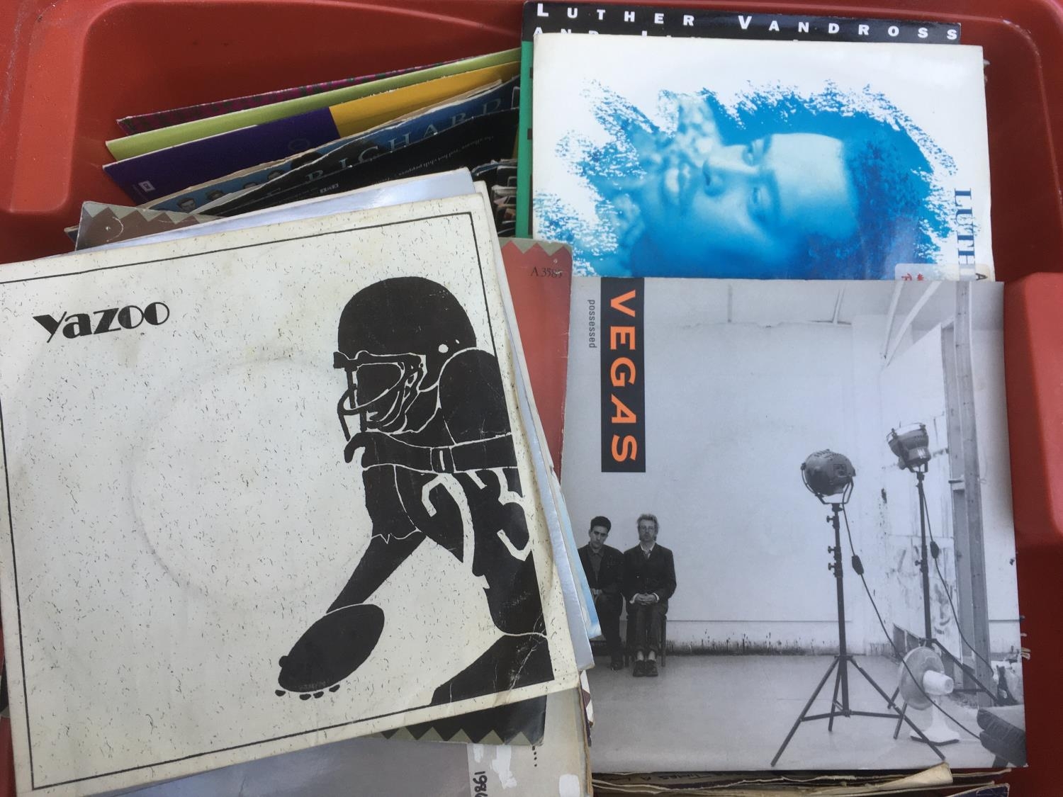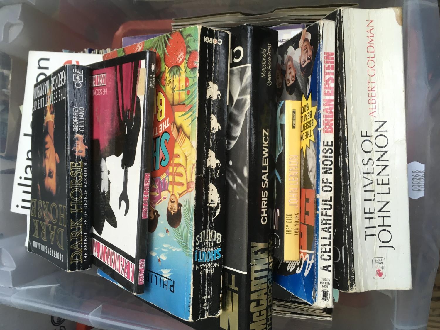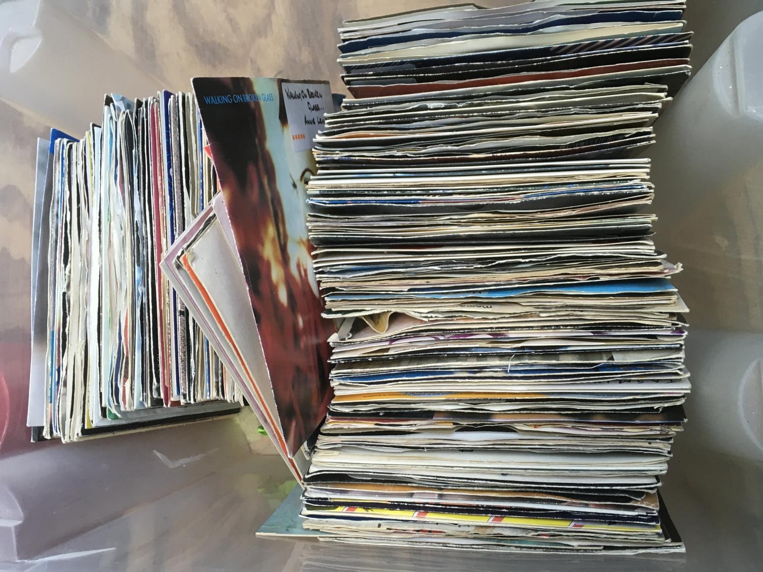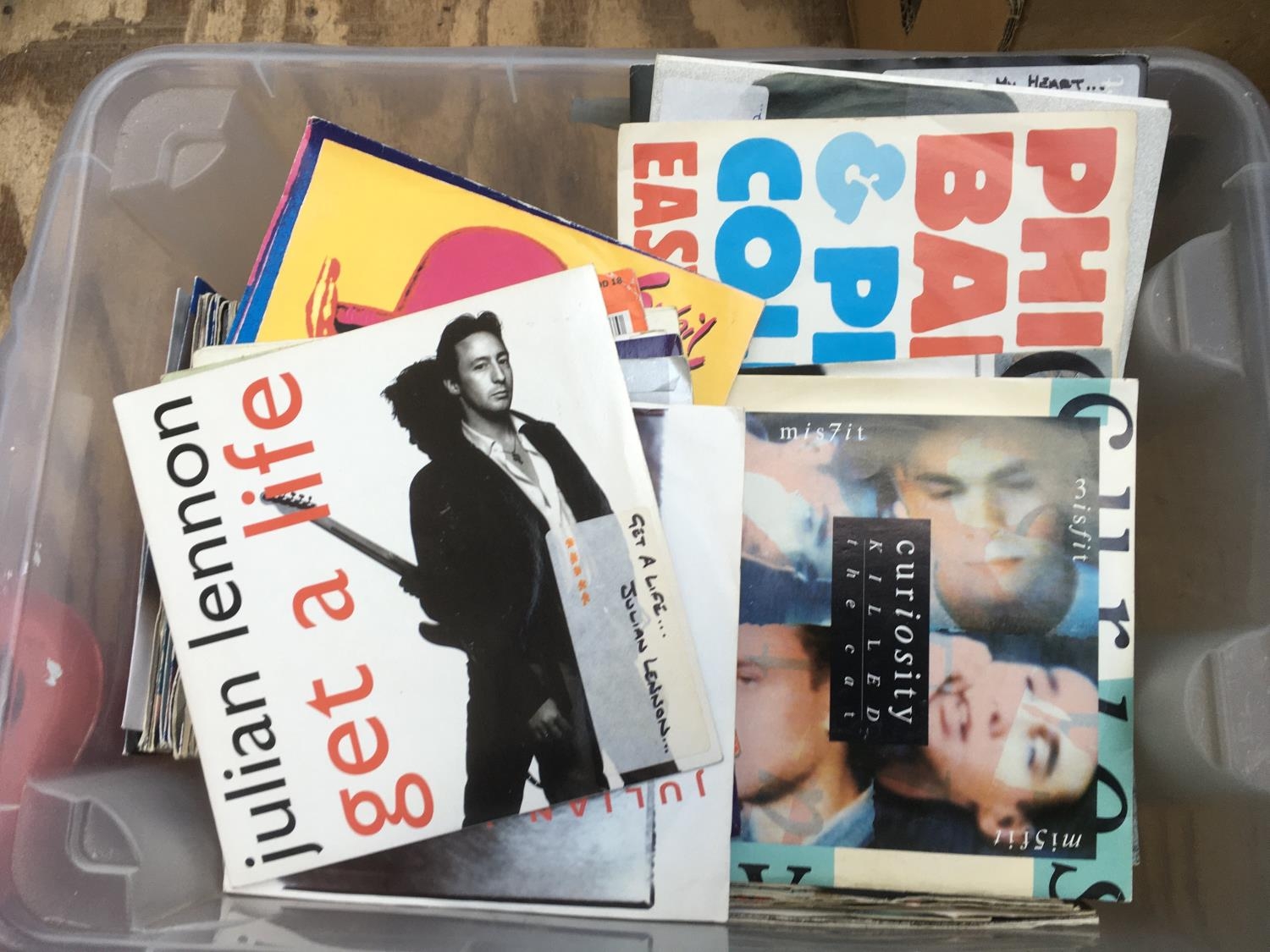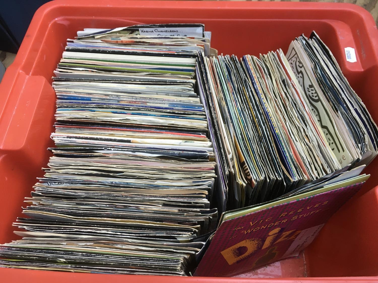 Two boxes of 7 inch singles mainly from the 1980s and 90s plus a small collection of Beatles books.