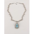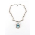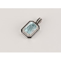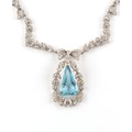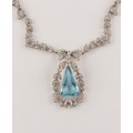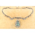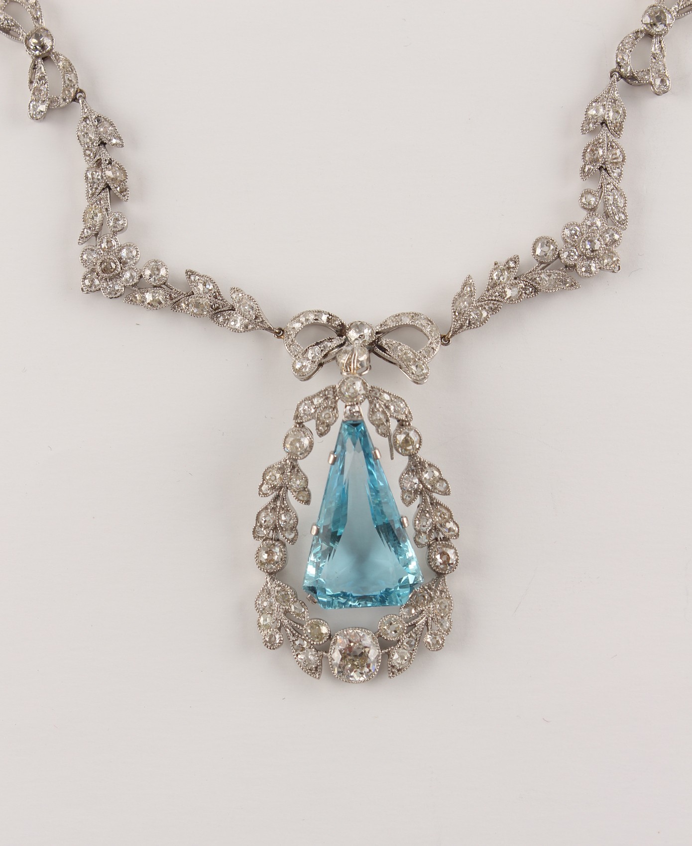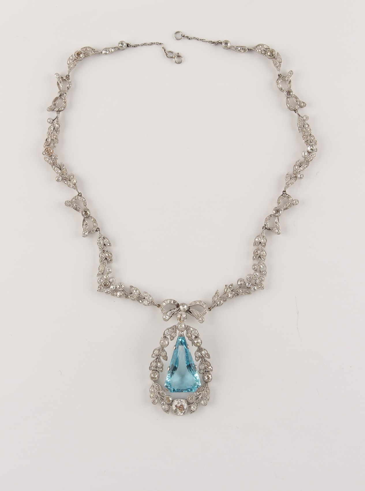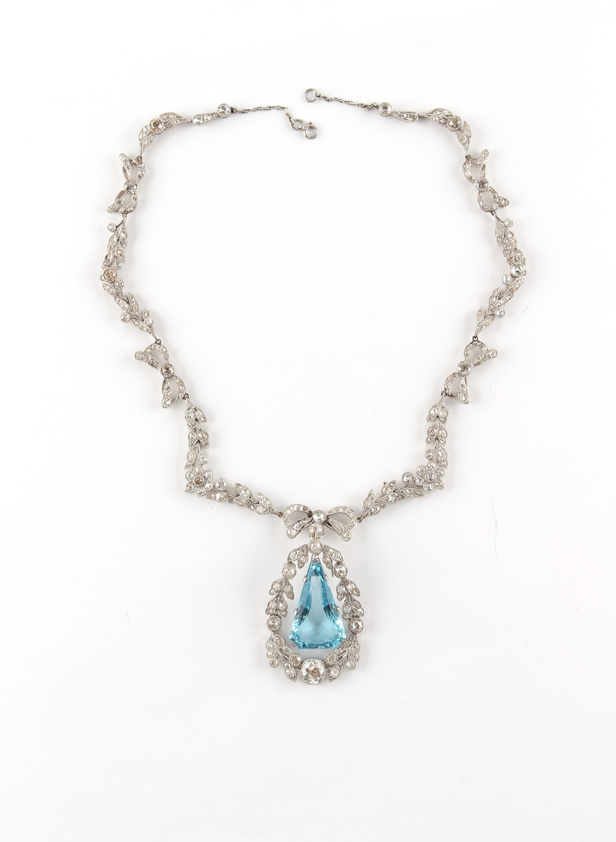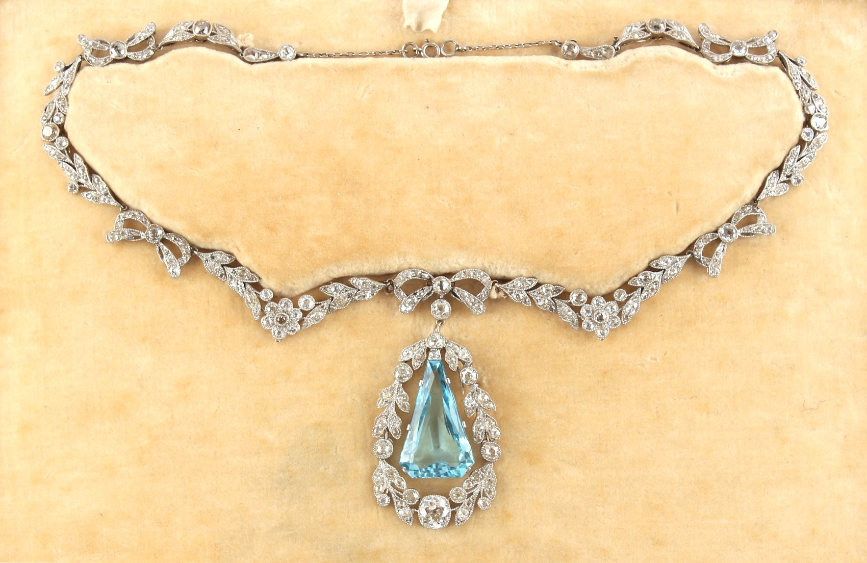A fine Belle Epoque aquamarine & diamond necklace, the angular drop shaped aquamarine of intense vibrant colour and weighing approximately 12.50 carats, the mixed old cut diamonds weighing an estimated total of 13.94 carats, in gold & platinum setting, 14.5ins. (37cms.) long, in Tessiers fitted case.