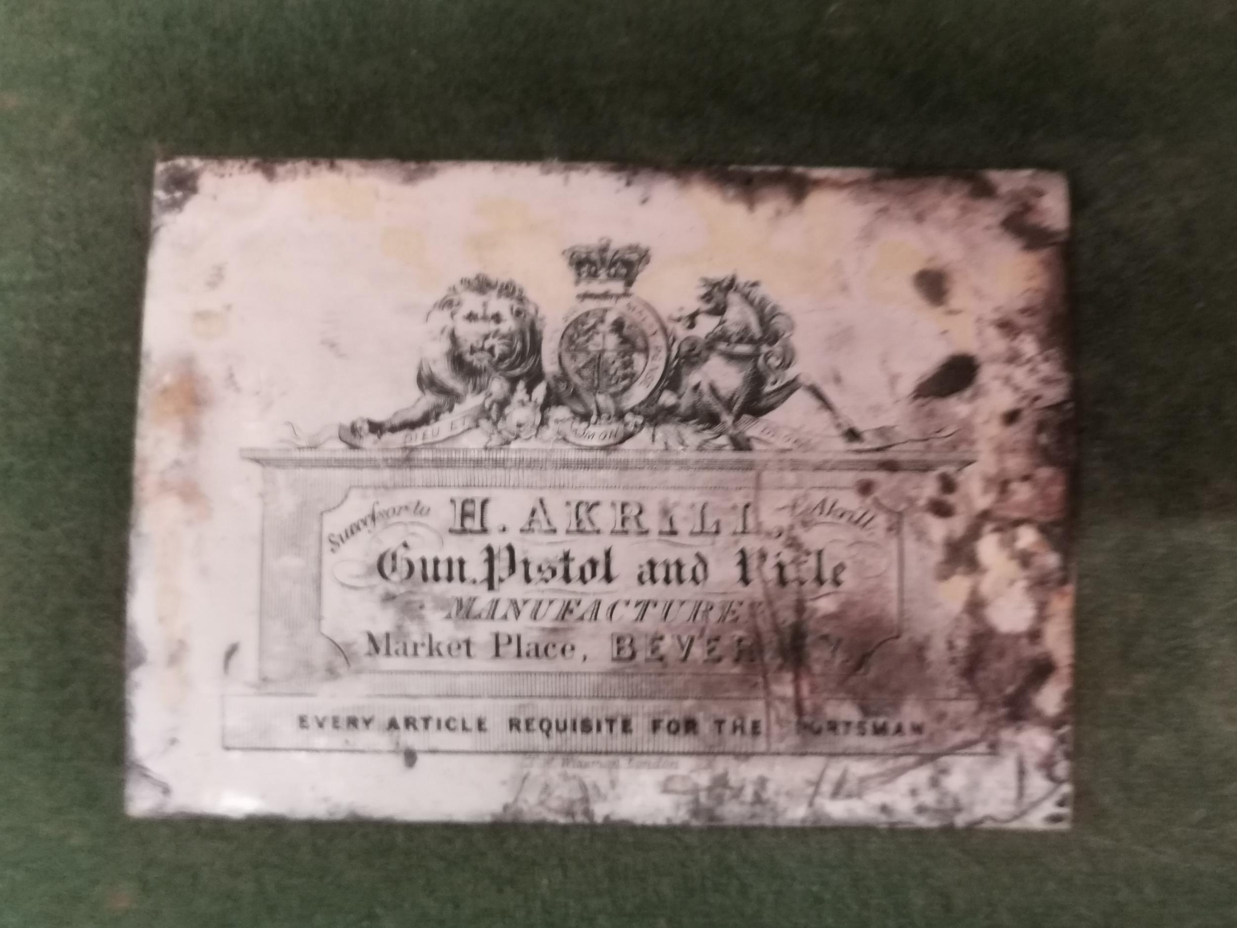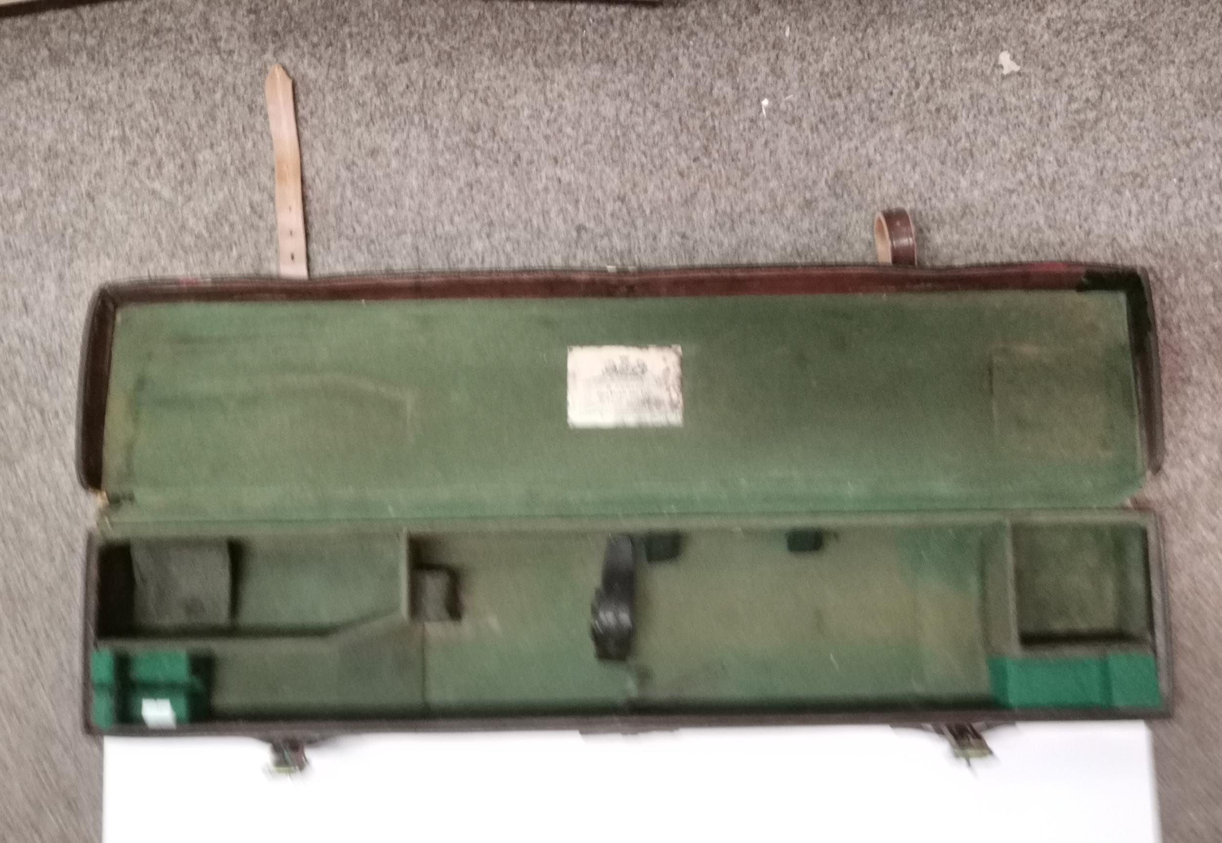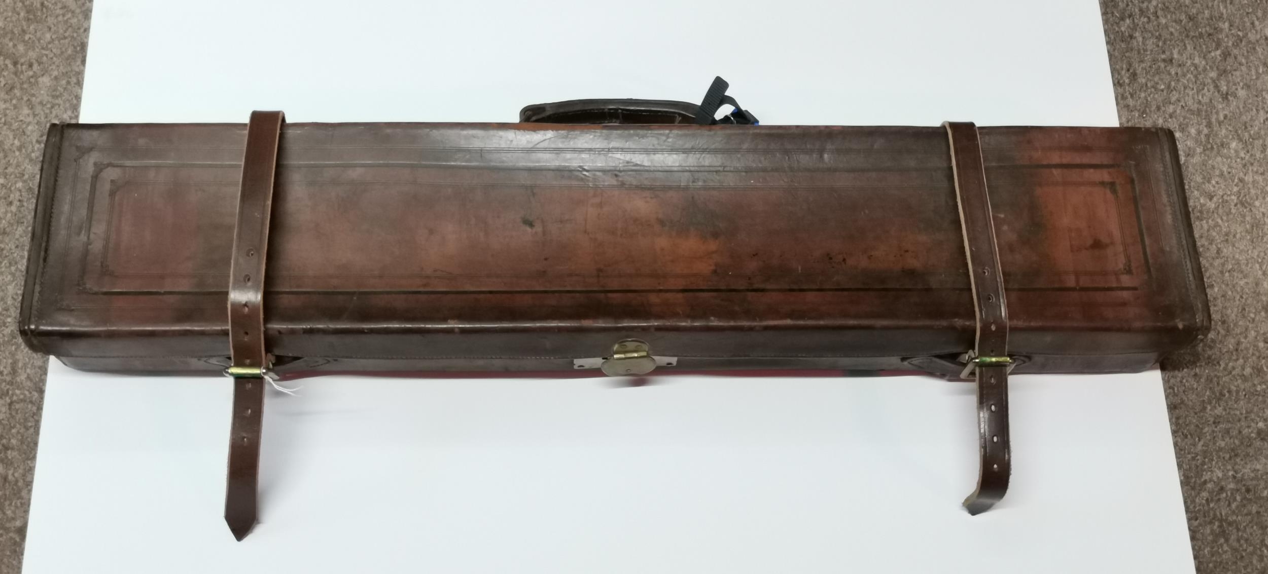 A leather gun case, second half 19th Century, label for H. Akrill, Beverley to green baize interior, with key and replacement leather straps. Approx. 83cm wide, 17cm deep