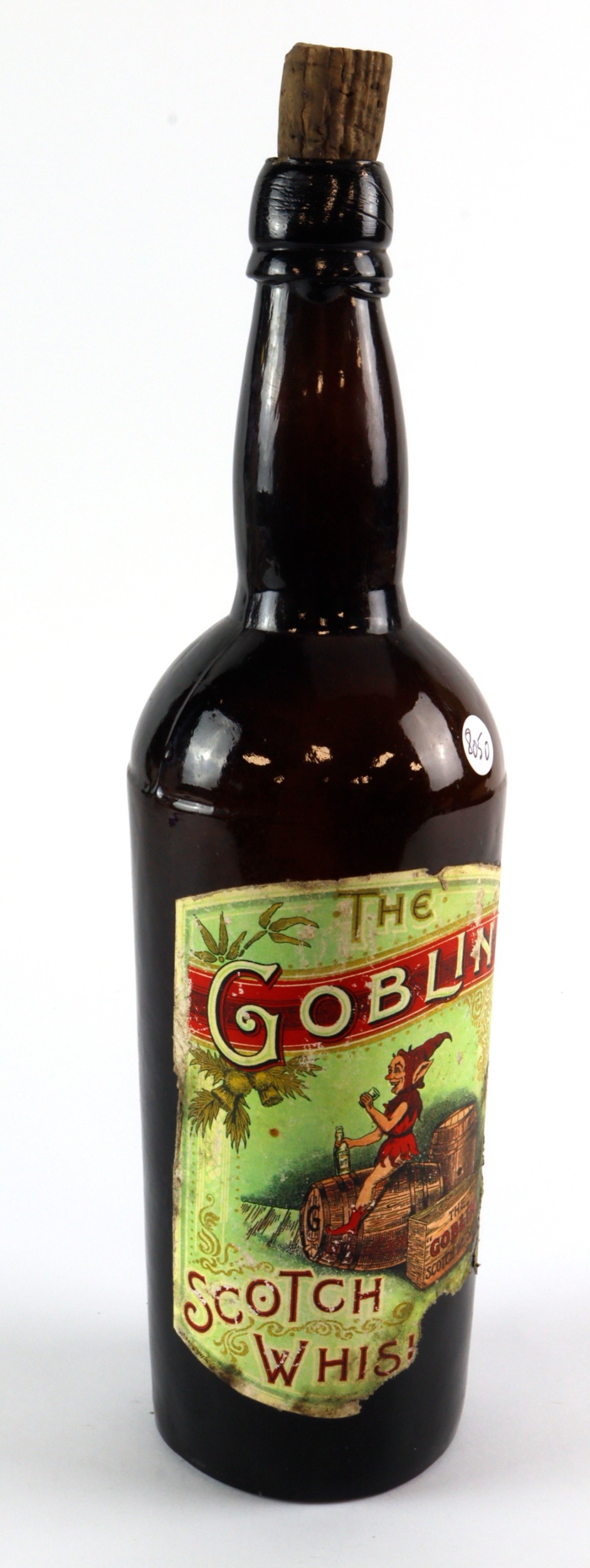 Whisky bottle. An empty Whisky bottle, possibly Victorian, interesting label reads "The Goblin Scotch Whisky" (part of the bottom of the label is missing, most of the K&Y of Whisky), the whole of the name is legible on the illustration of the box on the label