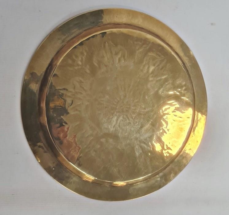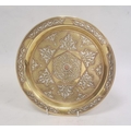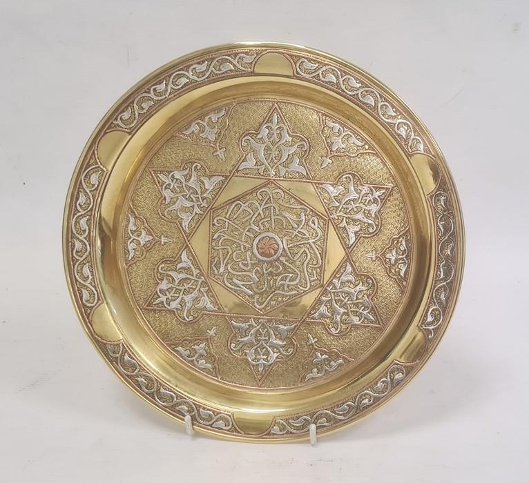 Middle Eastern brass dish of circular form with inlaid copper and silvered decoration, 24.5cm diameter
