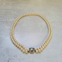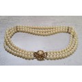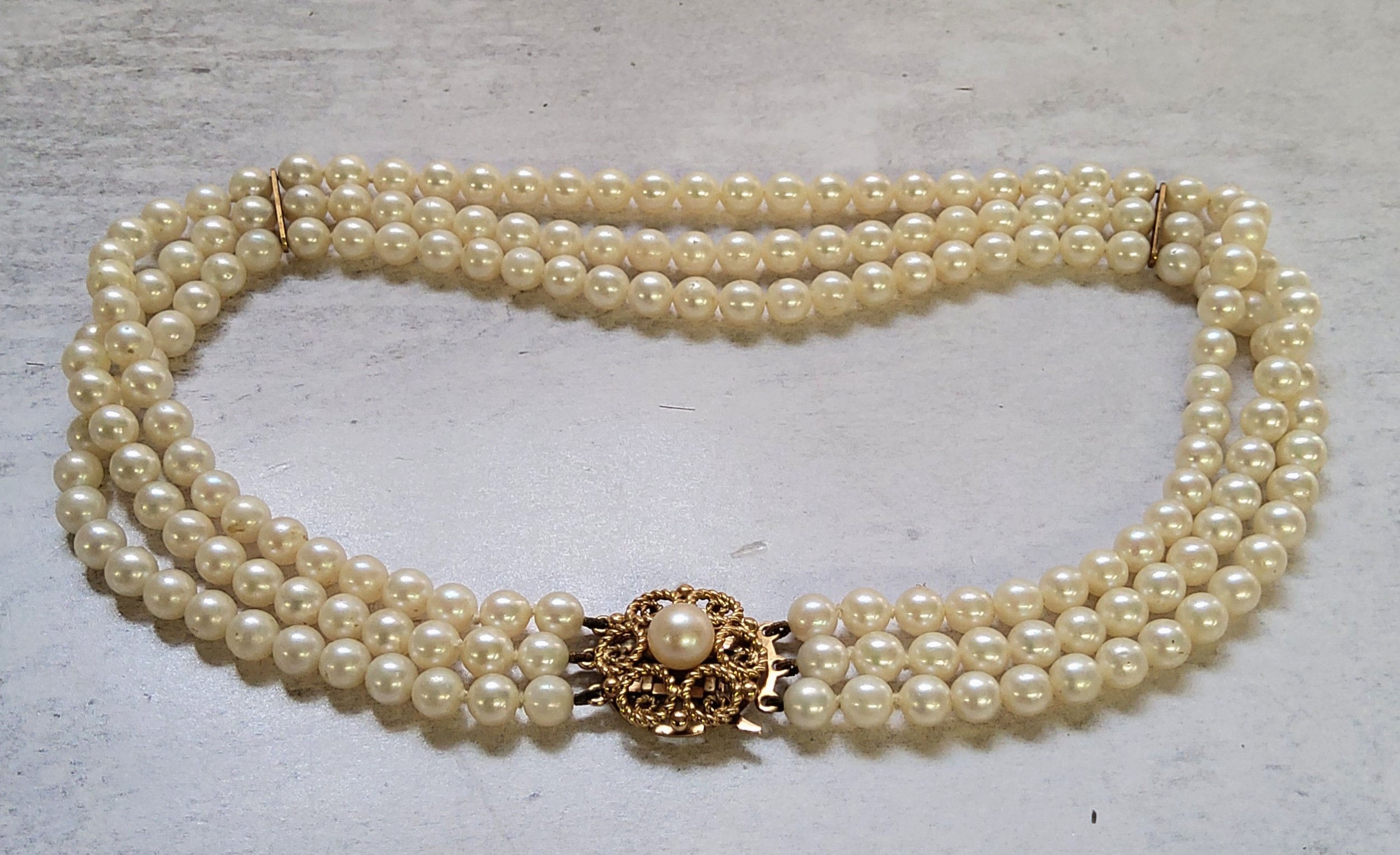 A three-strand cultured pearl choker, 9ct gold circular clasp mounted with a central pearl, hallmarked AJ, London, 1996