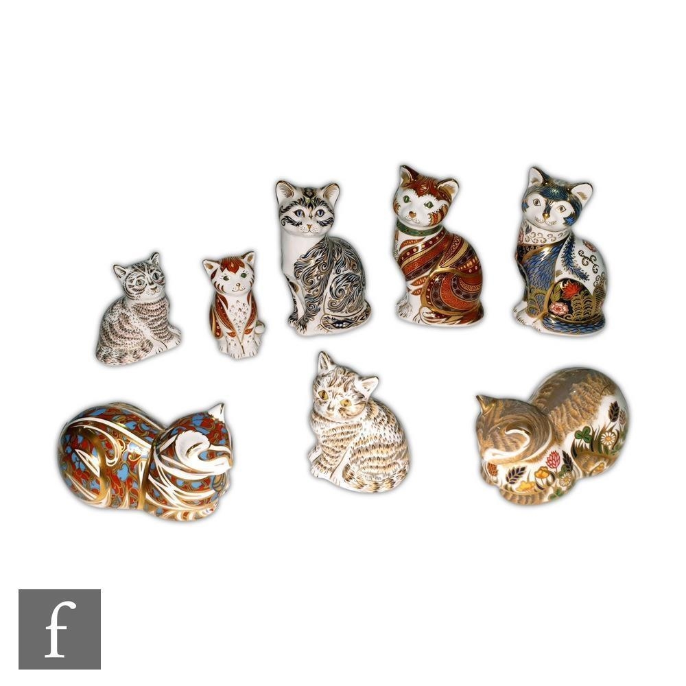Eight Royal Crown Derby Cat paperweights to include Fireside Cat, made exclusively for Peter Jones of Wakefield, Tabitha and Thomas, Cottage Garden Cat, Marmalade numbered 1151 of 2500, Marmaduke numbered 313 of 2500, Majestic Cat numbered 3362 of 3500, all with printed marks, all with gold stoppers, all boxed bar Marmaduke, Majestic Cat and Red Stripe Cat. (8)