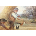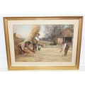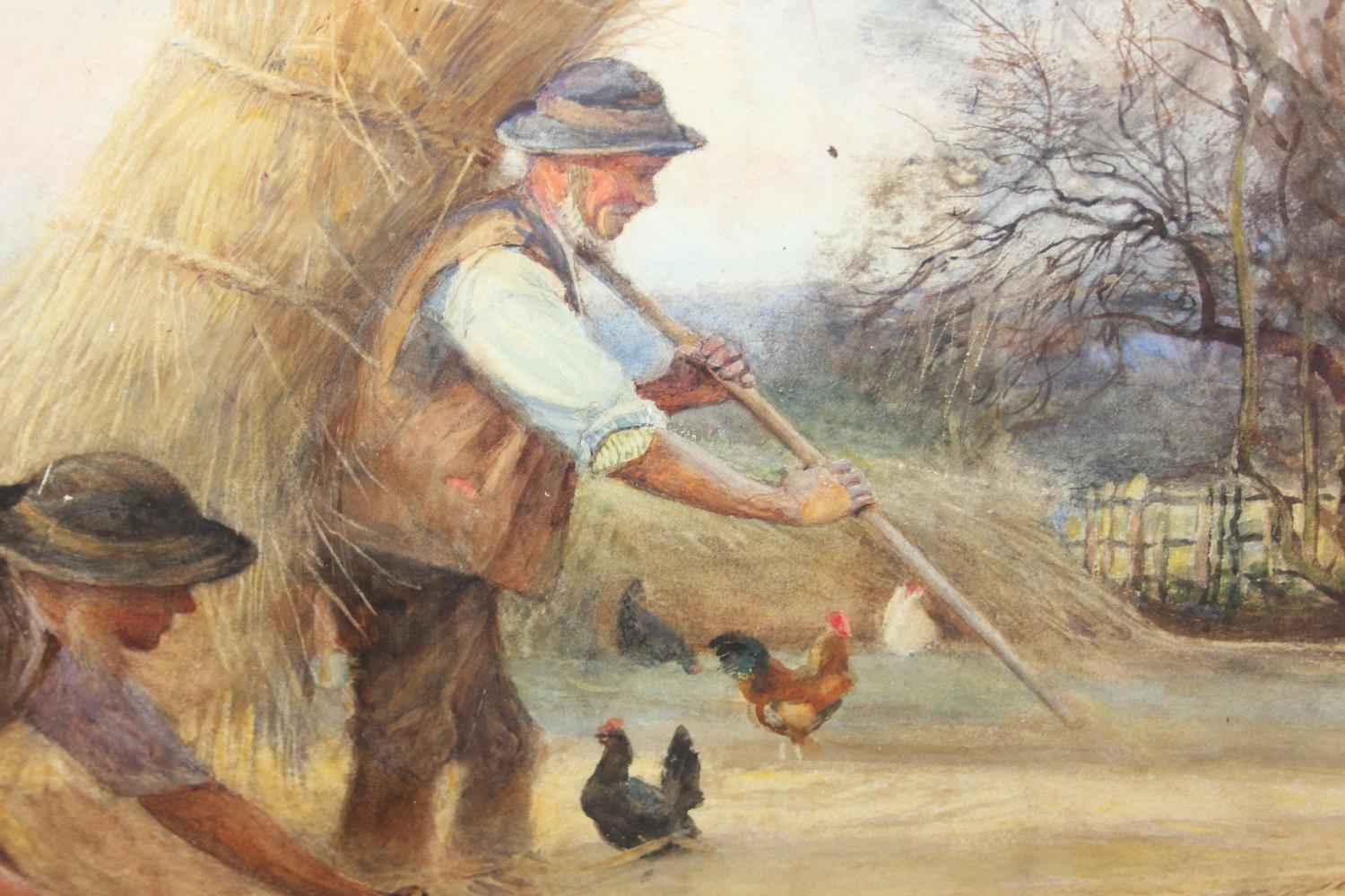 watercolour depicting farmers twisting and moving hay or straw with chickens,