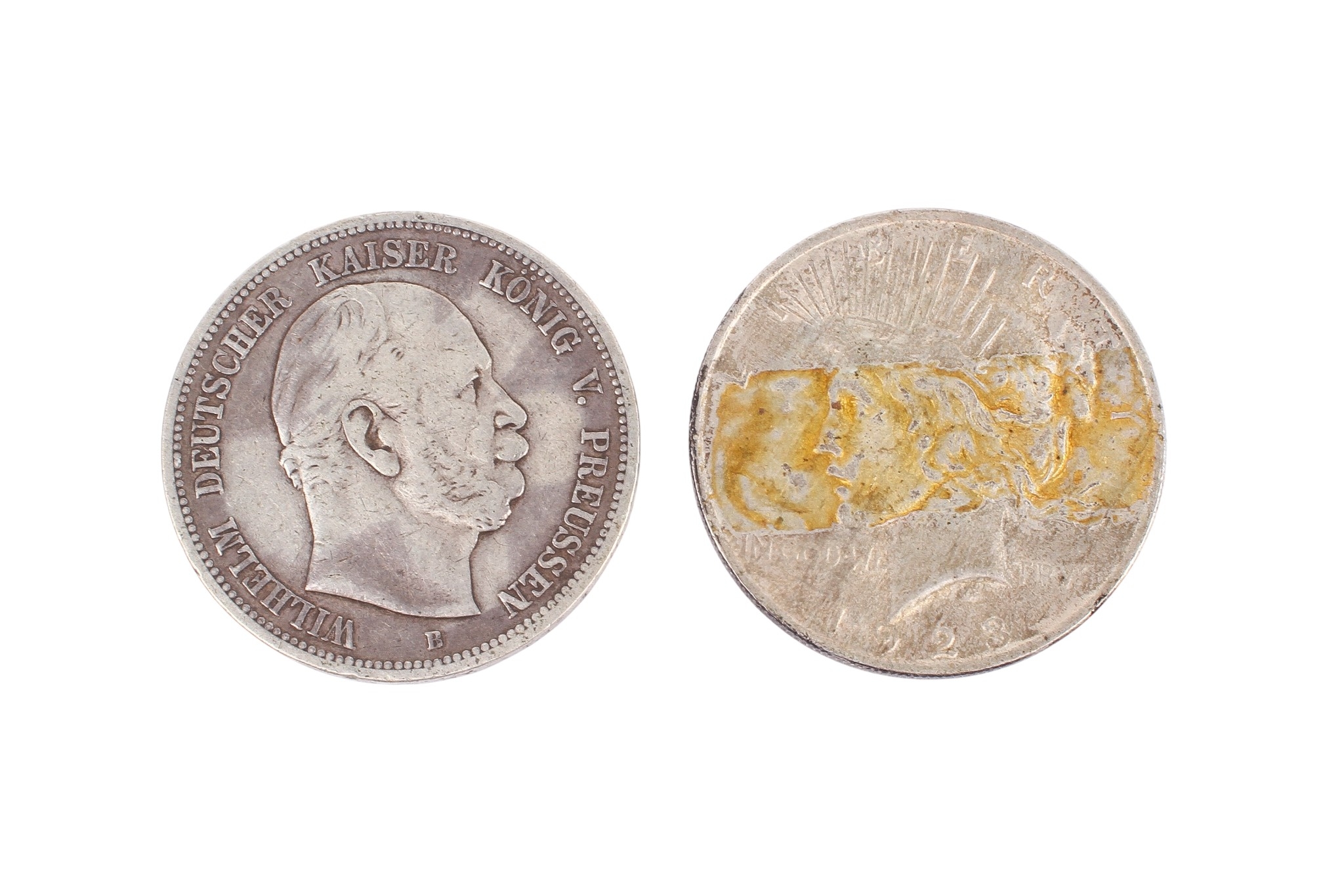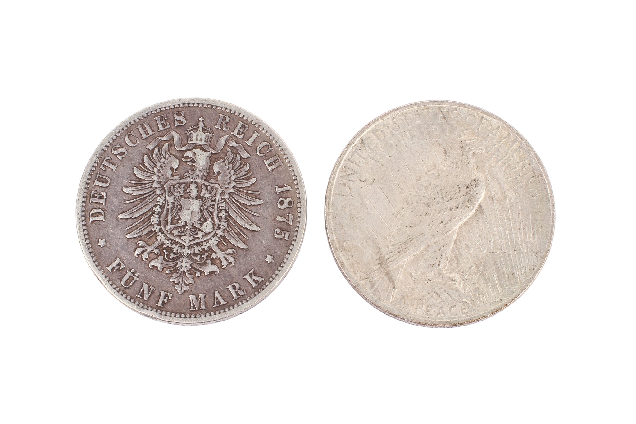 1875 Germany/Prussia 5 Mark silver coin and a US 1923 silver Peace Dollar