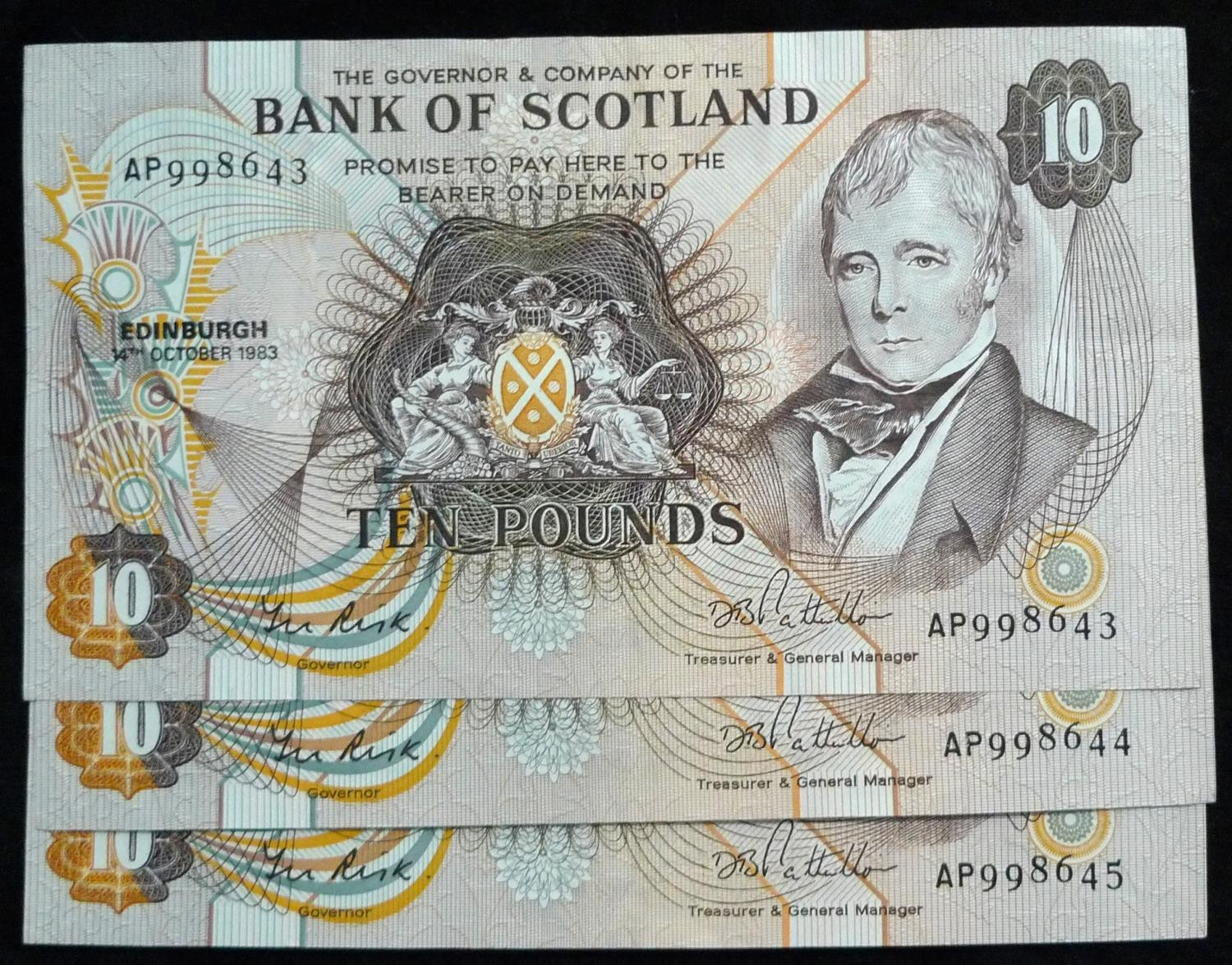 Bank of Scotland. £10. (3) SC134c 14.10.83. AP998643 -645 consecutive. EF.