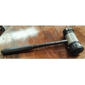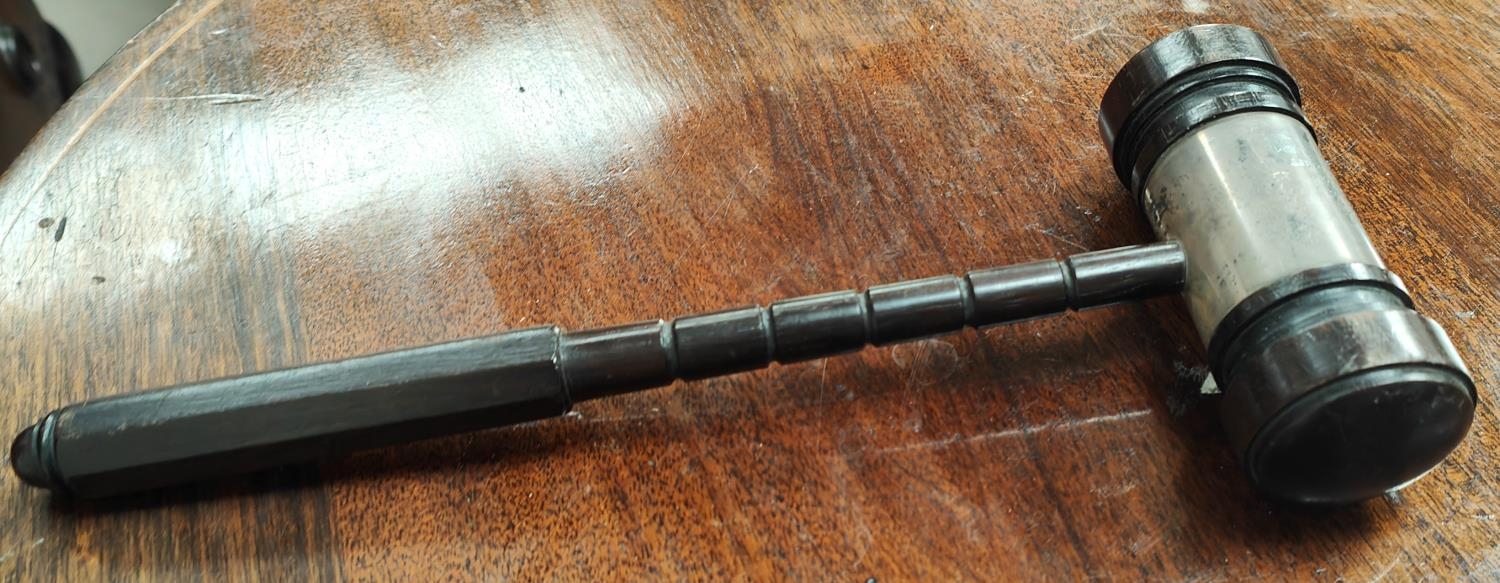 A presentation gavel with carved head and handle with white metal presentation surround, length 28cm