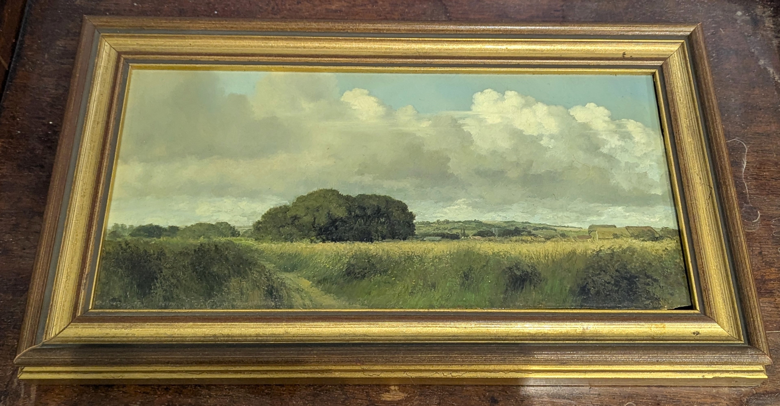 Oliver Ommanney, 'Somerset Landscape near Curry Rivel [...]', oil on board, unsigned, verso inscribed, 14cm by 30cm