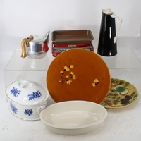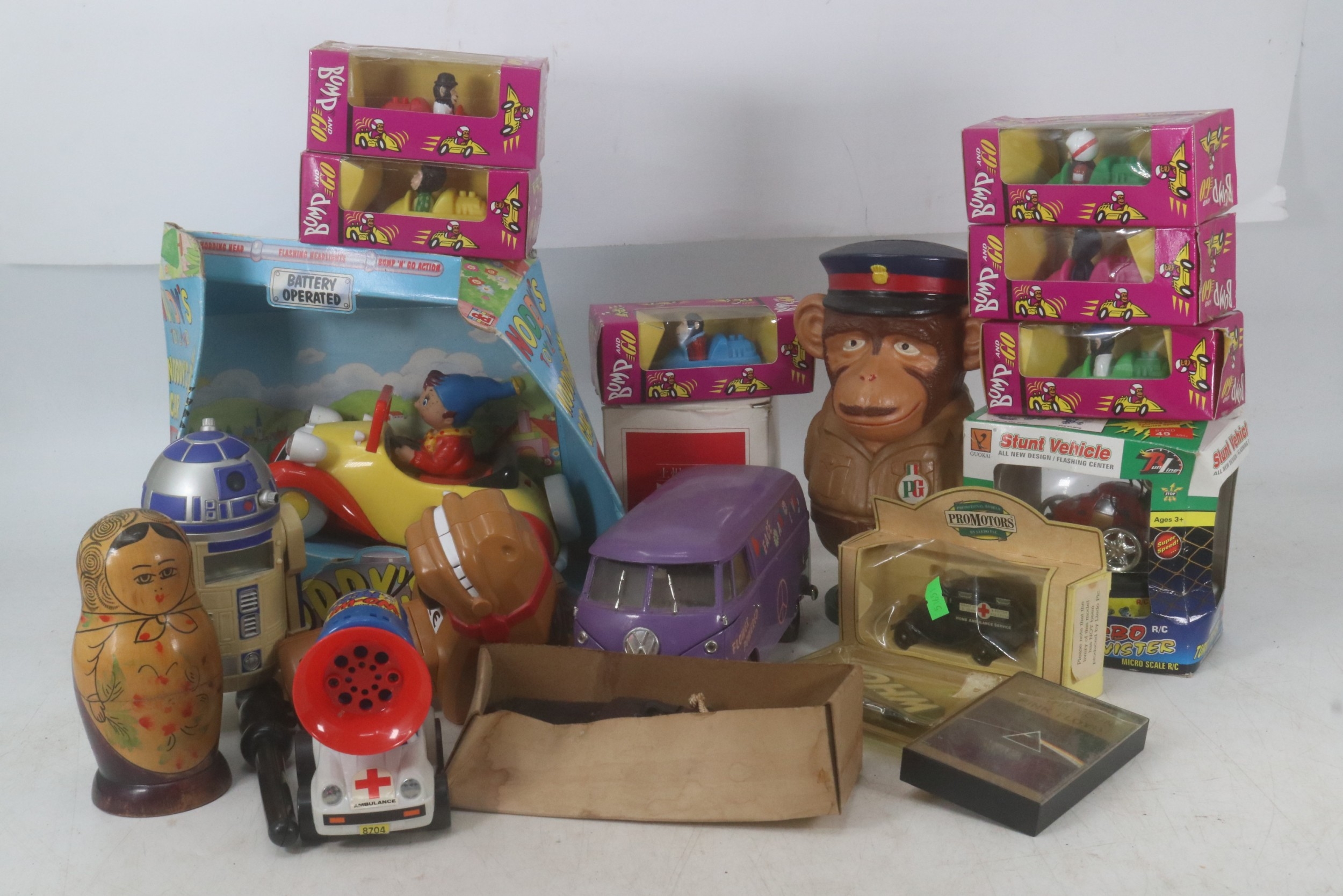 Selection of toys and novelty items together with British Airways headphones, stacking doll, Noddy's car etc