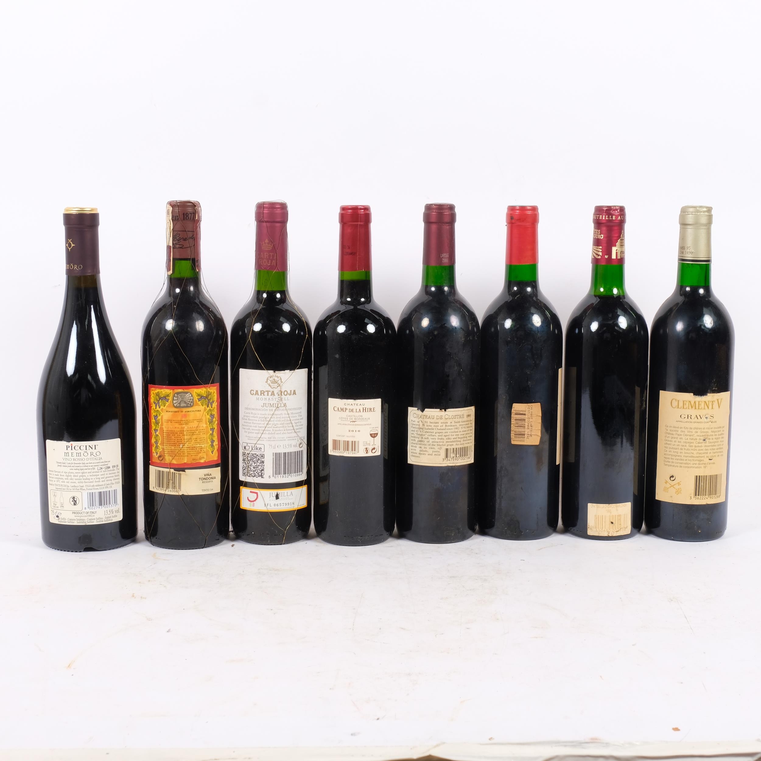 8 bottles of various wine, including a Grand Vin De Bordeaux, Clement V, Graves 1993, bottle of 1995 Chateau De Clostre Bordeaux Superior, bottle of 2005 Grand Reserve Carta Roja, etc, all sealed