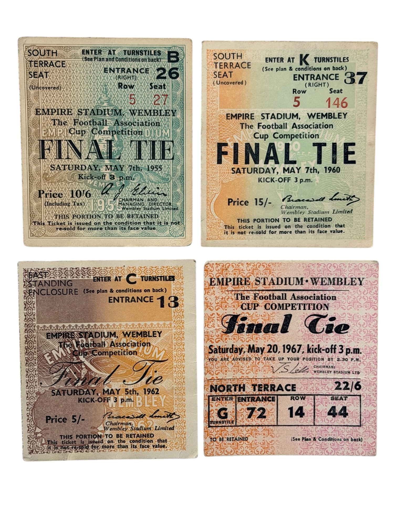 COLLECTION OF FA CUP FINAL FOOTBALL TICKET STUBS, 1955 NEWCASTLE VERSUS MANCHESTER CITY, 1960 WOLVES VERSUS BLACKBURN ROVERS, 1962 TOTTENHAM VERSUS BURNLEY, 1967 TOTTENHAM VERSUS CHELSEA.