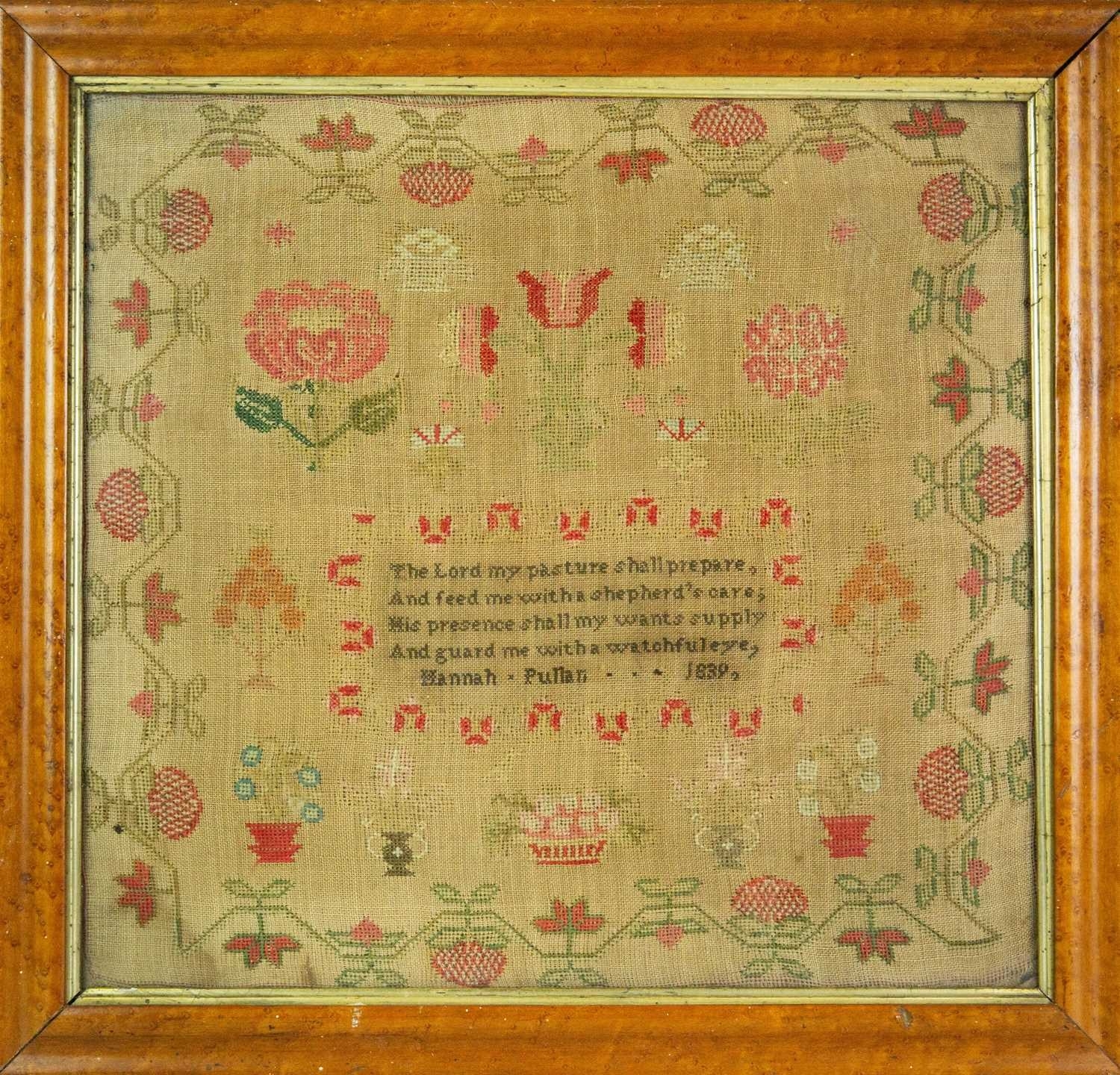 An early Victorian woolwork sampler by Hannah Pulhan, 1839. Worked with trailing flowers and foliage, and pots of plants, with a central verse, 40.5 X 43cm, maple framed, 49 x 52cm.