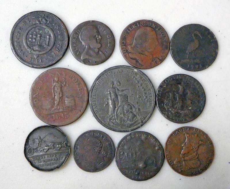 SELECTION VARIOUS TOKENS & MEDALS TO INCLUDE 1801 BATTLE OF COPENHAGEN MEDAL, 18TH CENTURY SOUTH WALES EVASION ALFRED THE GREAT HALFPENNY, 1794 FAWLER'S LONDON WHALE FISHERY HALFPENNY, JOHN OF GAUNT DUKE OF LANCASTER, COVENTRY HALFPENNY, ETC
