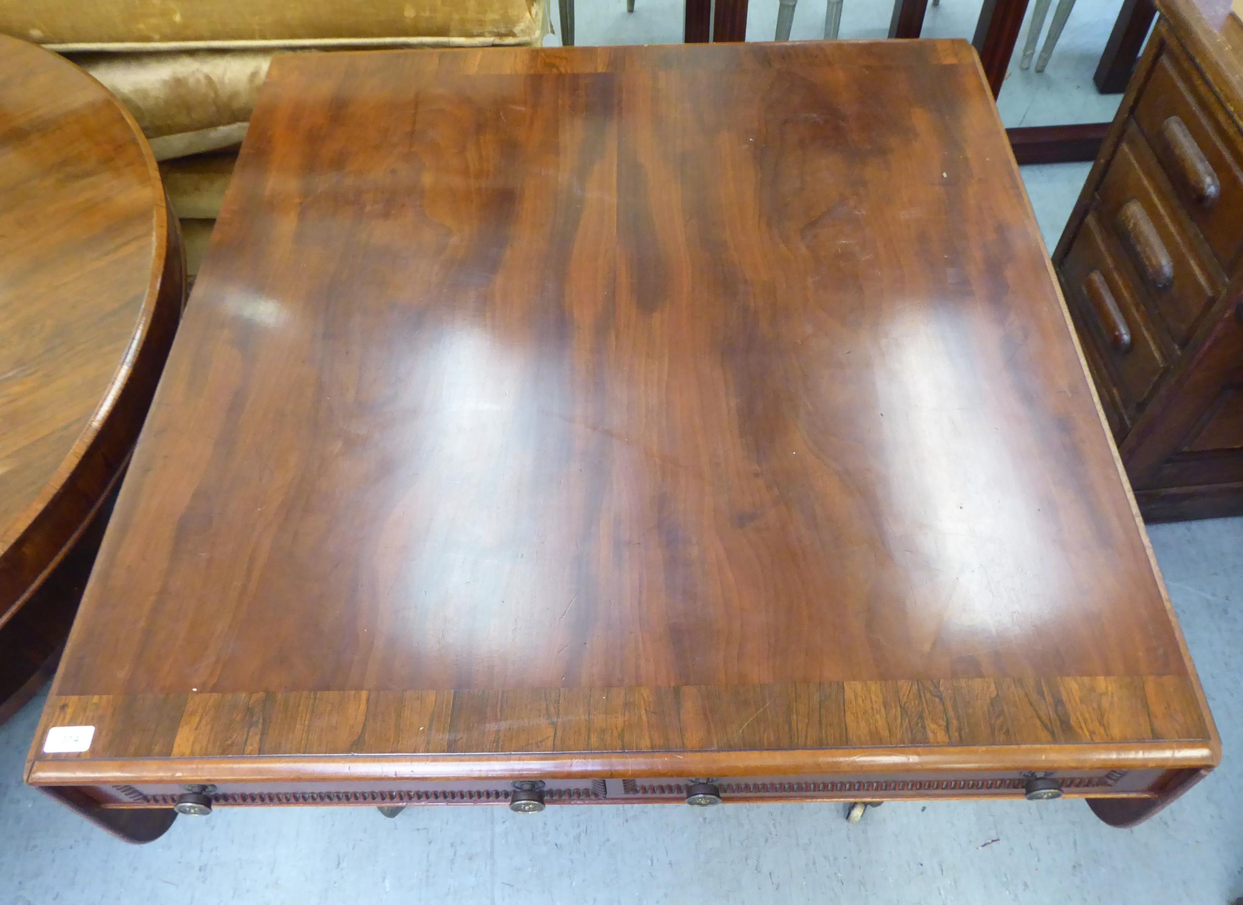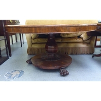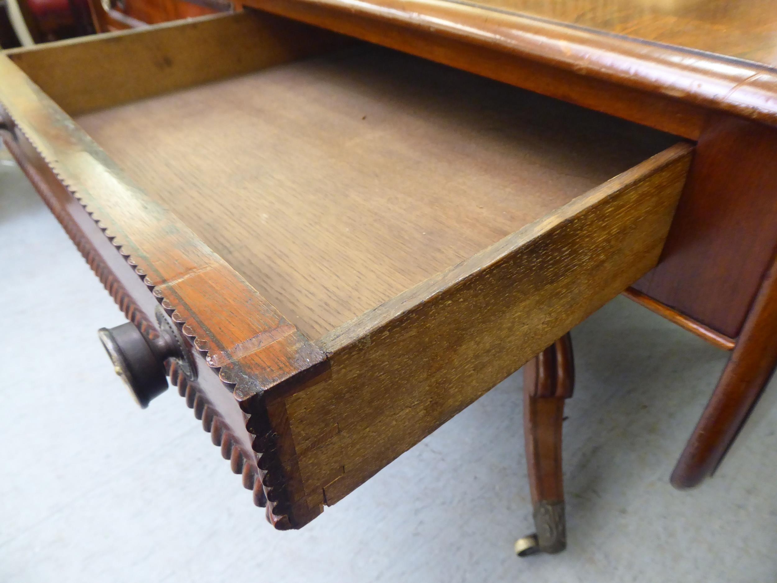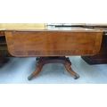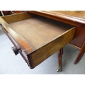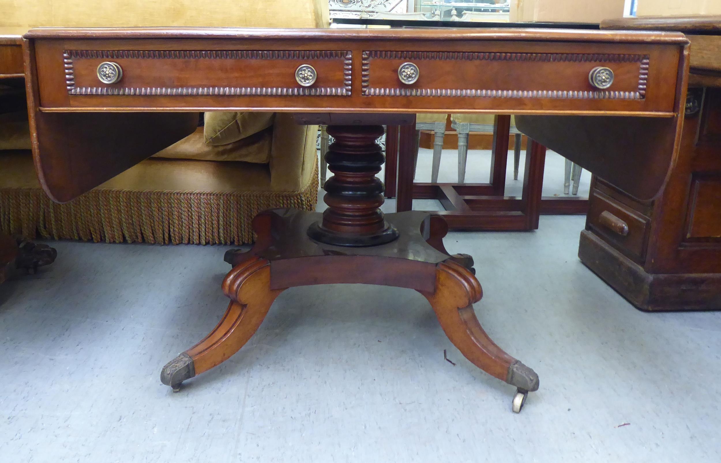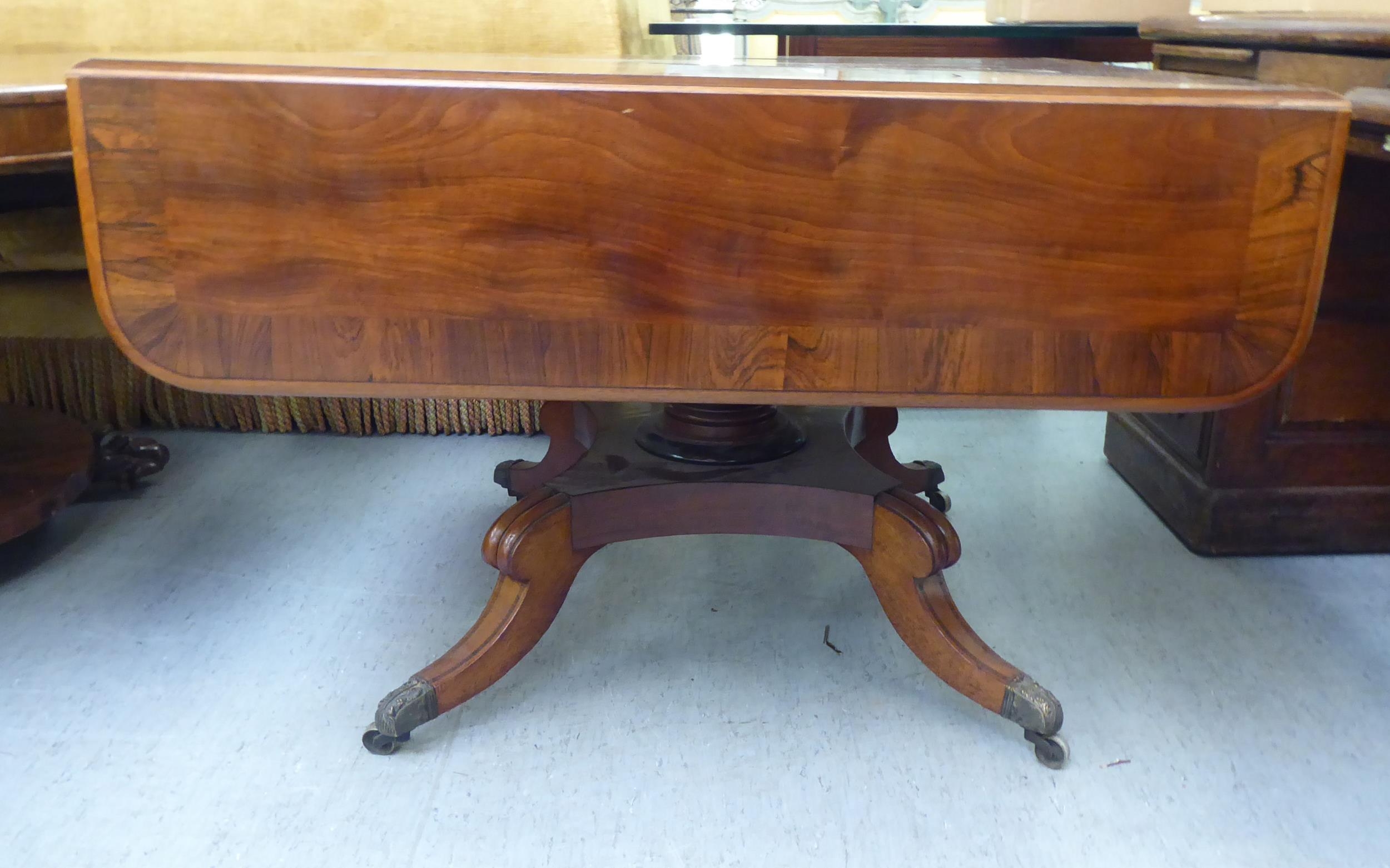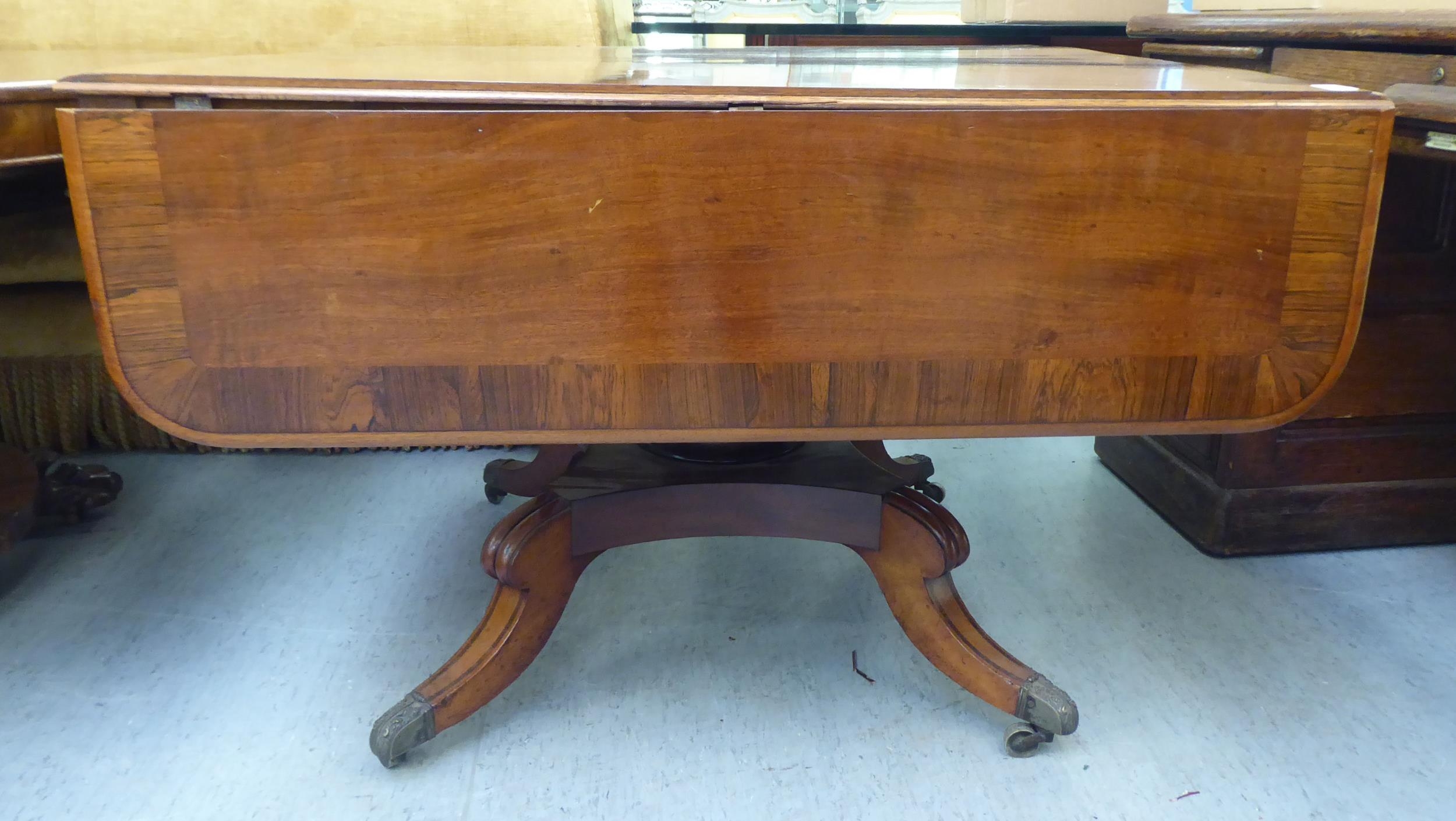 A Victorian crossbanded rosewood and mahogany sofa table with two pairs of frieze drawers, raised on a knopped column, splayed quadruped base, splayed legs and brass capped casters 28"h 39"w closed 61"w open