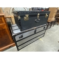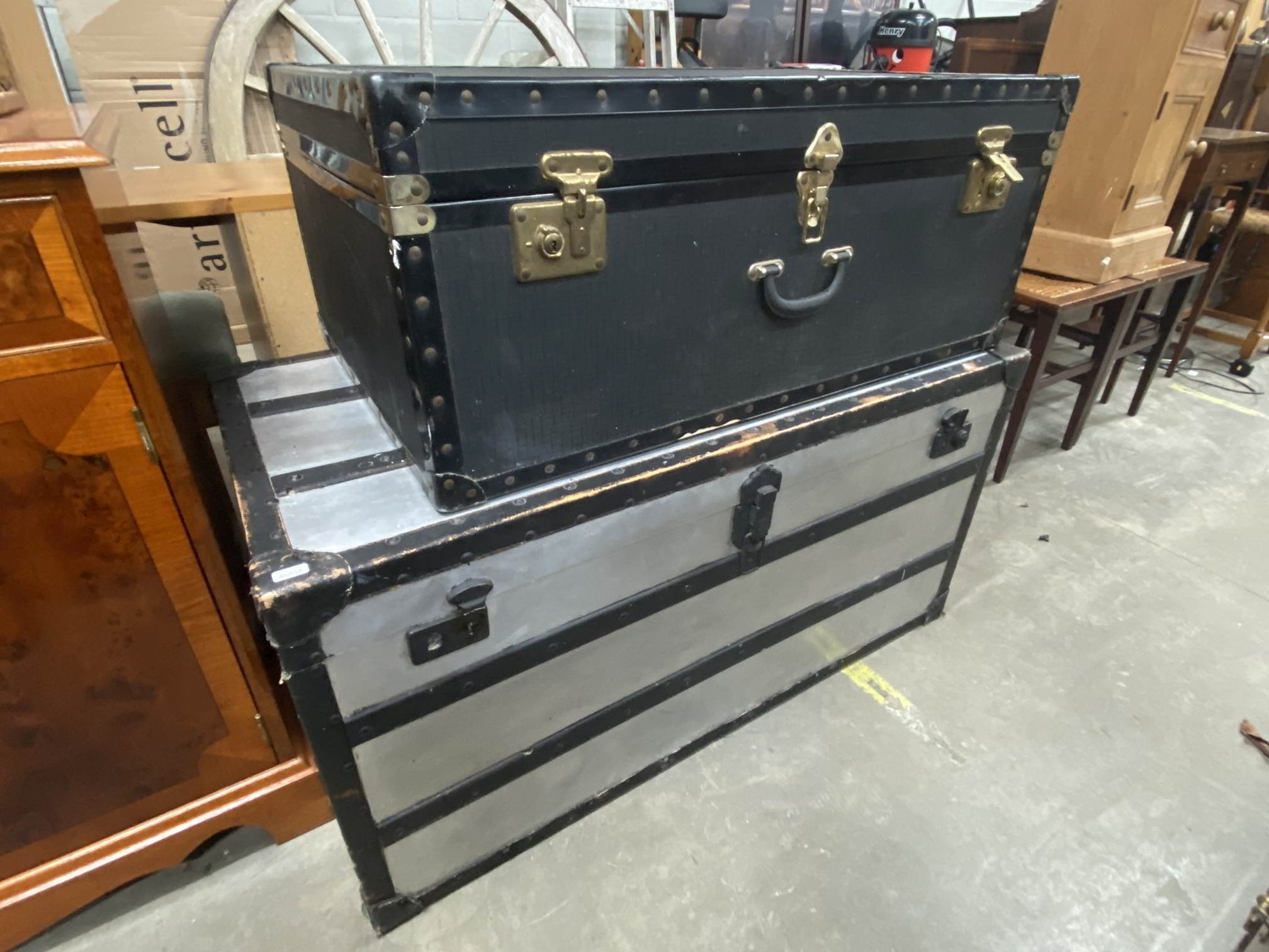 Vintage aluminium/wooden steamer trunk 51H 101W 51D & black vintage trunk 34H 84W 50D