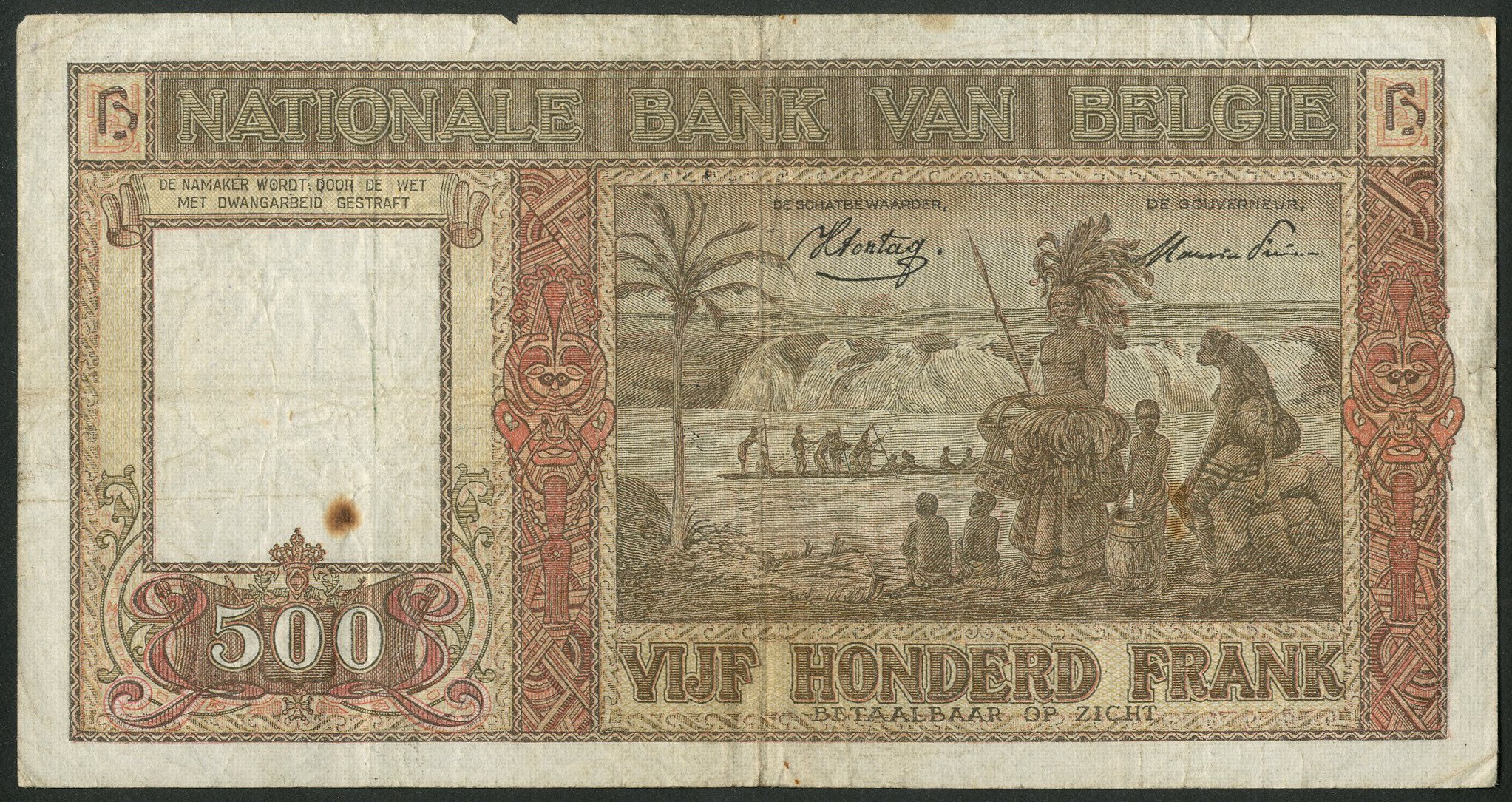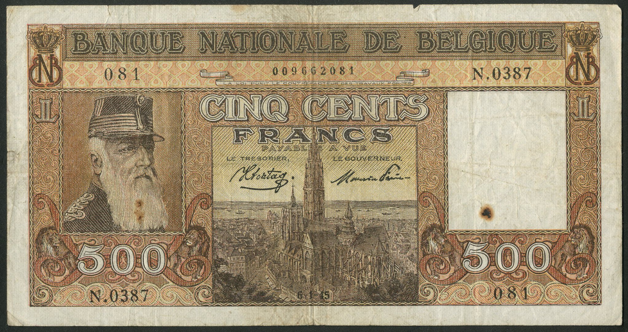 Belgium, Banque Nationale de Belgique, 500 francs, 6-1-45, Sontag/Frere signatures (Pick 127a). Rust marks on beard and at right otherwise Fine.