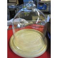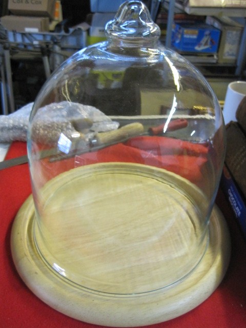 A large cheese dome with wooden cheeseboard under