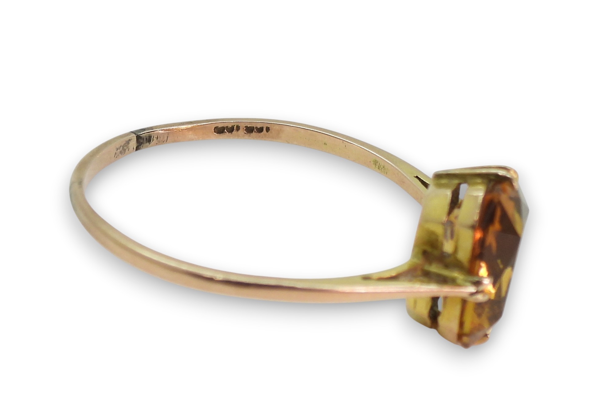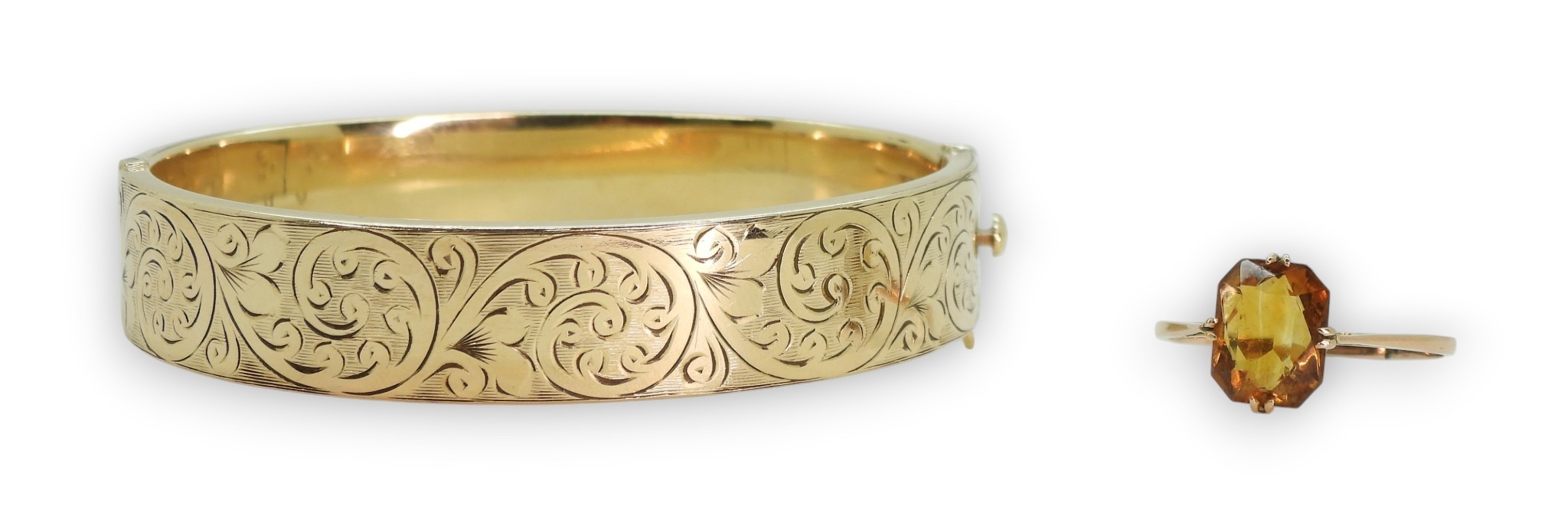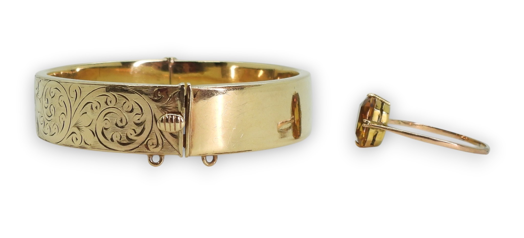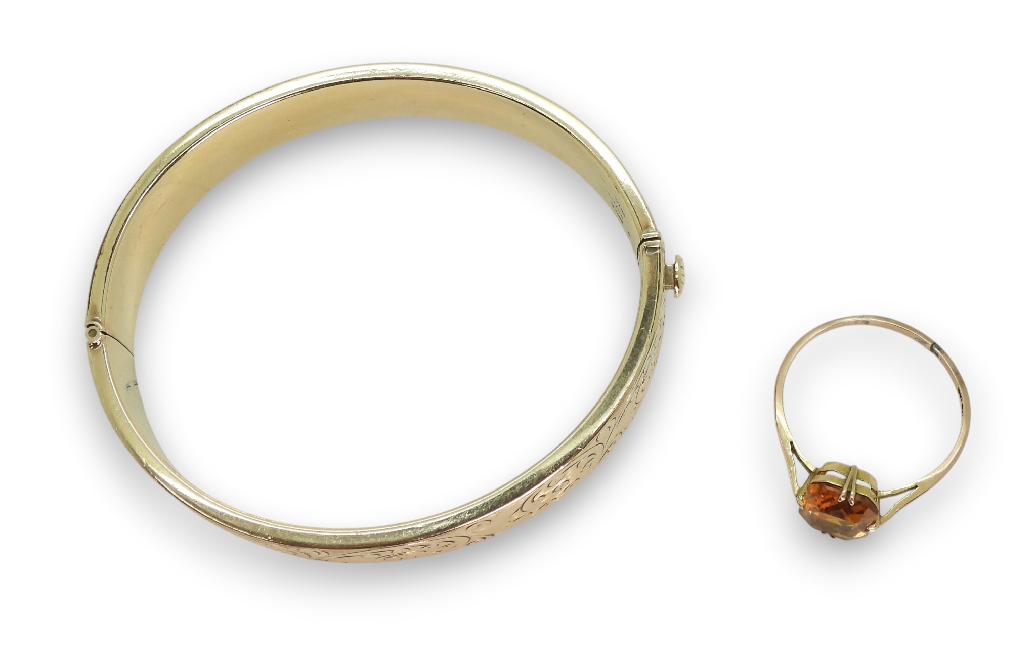 A 9ct gold citrine ring, size V1/2 weight 1.7gms, together with a gold plated bangle.