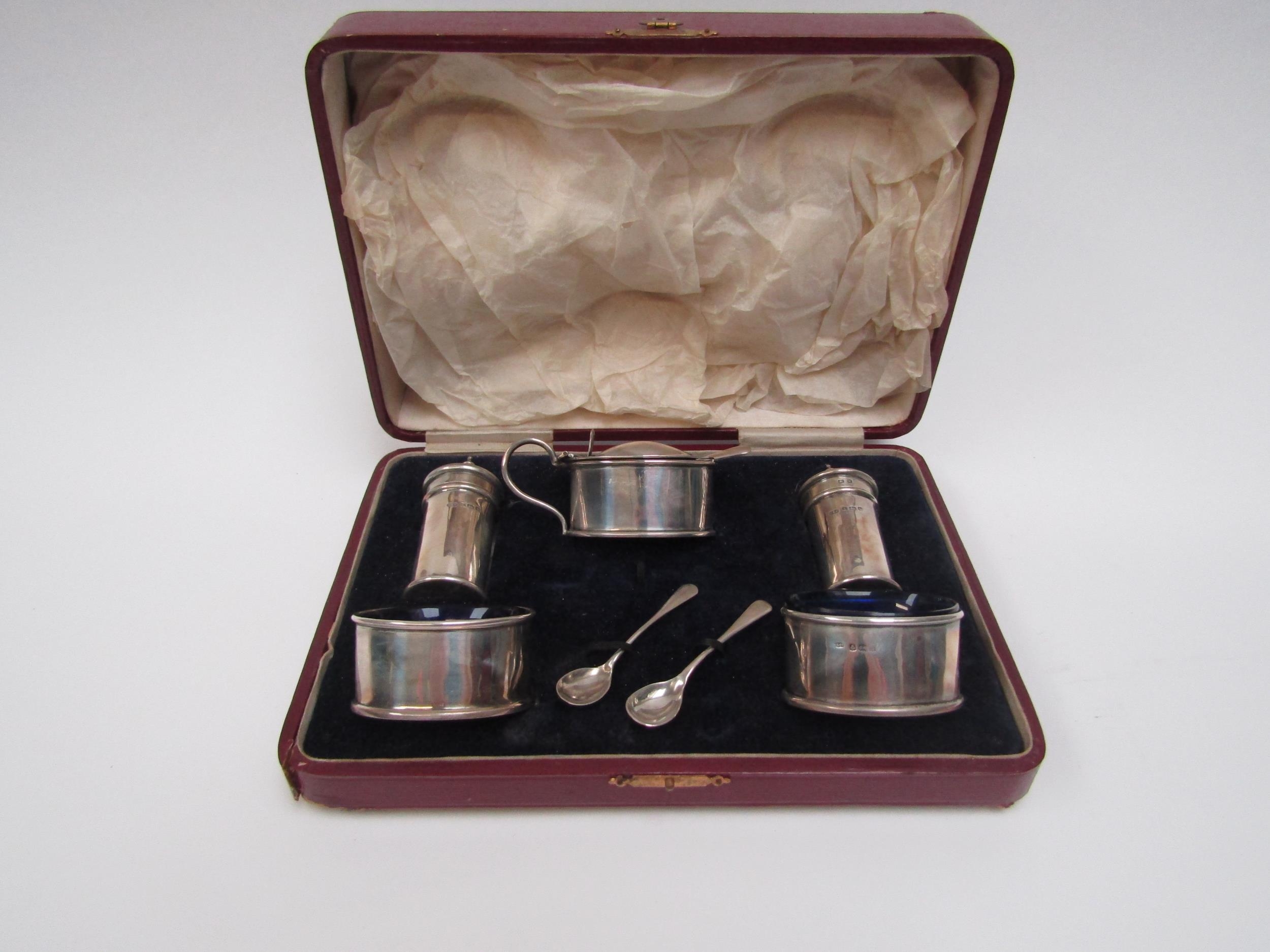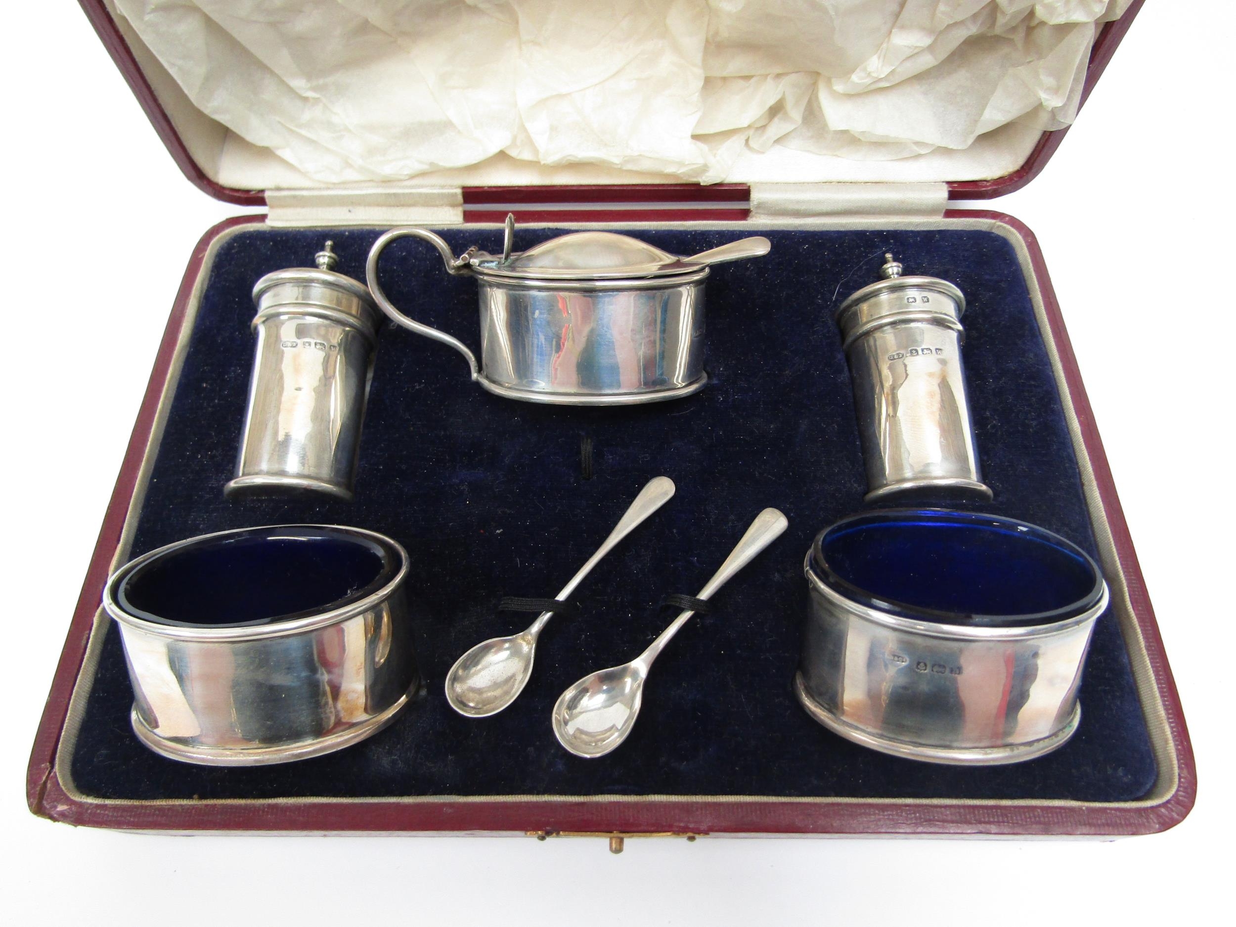 An associated five piece cruet set, makers marks for Deakin and Francis Ltd and B&Co