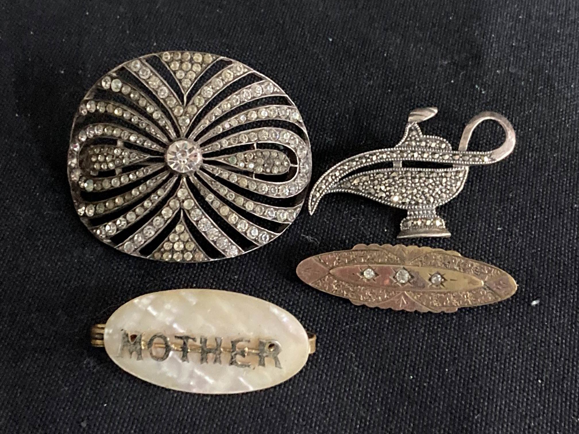 4 vintage/antique brooches inc. silver, marcasite, pearl etc.
