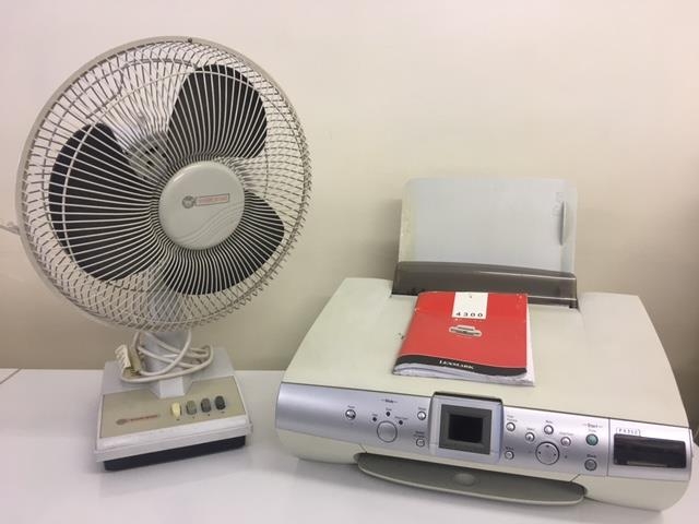 A Lexmark 4300 printer and a Whirlwind desk fan. Untested.