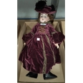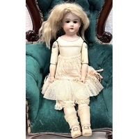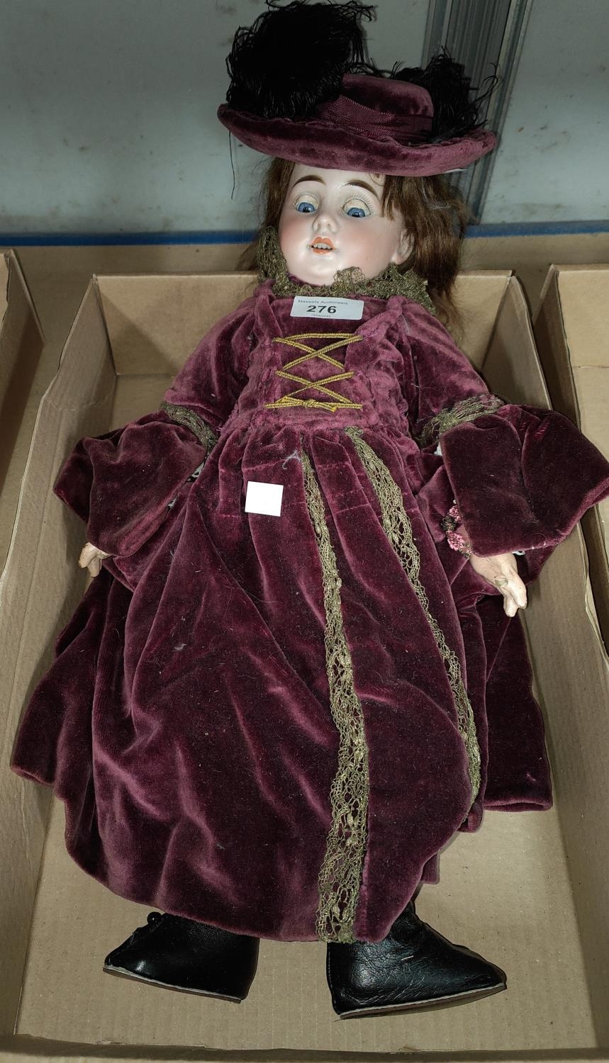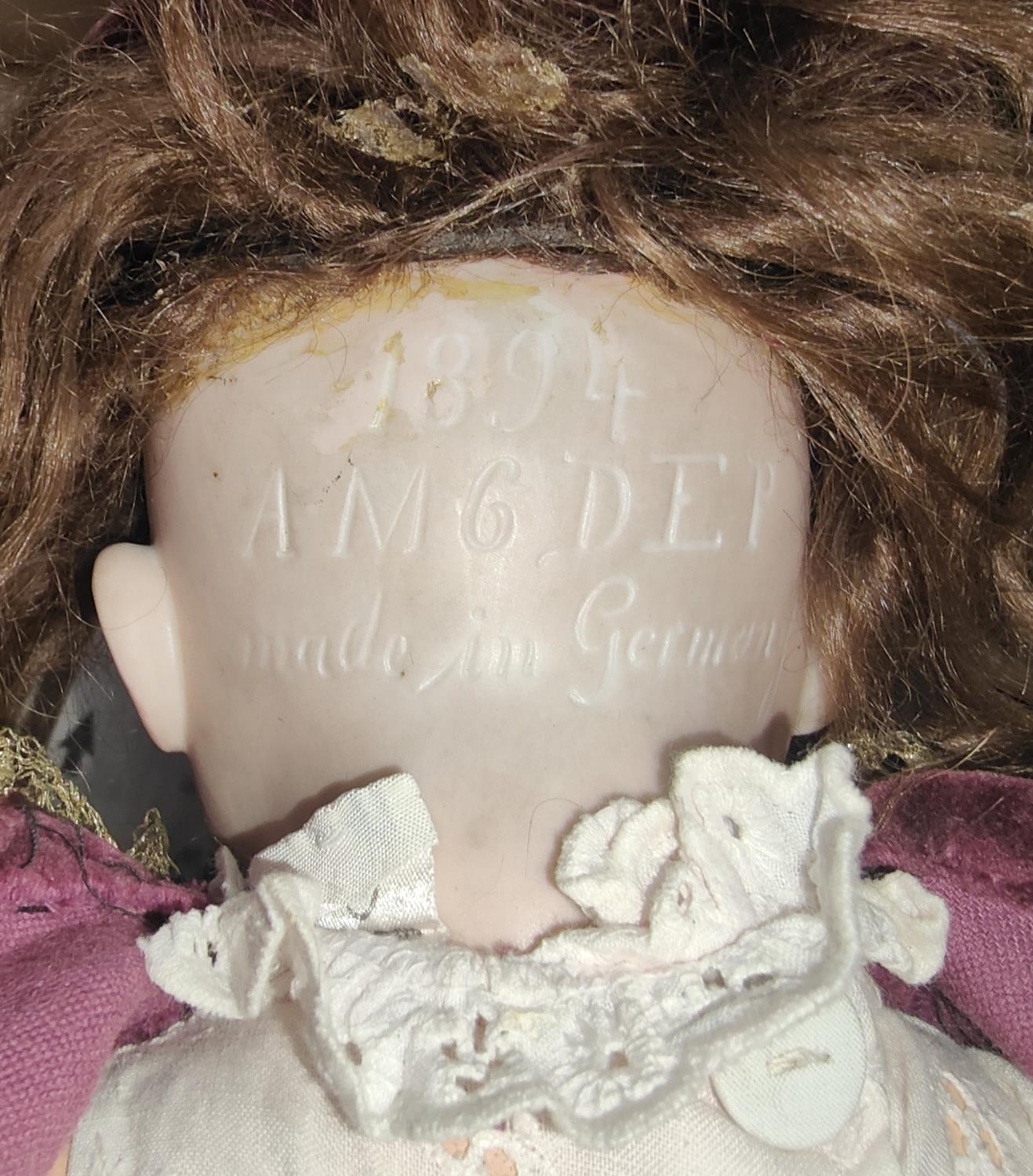 A late 19th/early 20th century bisque head girl doll with sleeping glass eyes, composition body and jointed limbs, real hair wig (cut), in plain velvet dress and hat, imp: 1894 AM 6 DEP, Made in Germany, length 50cm