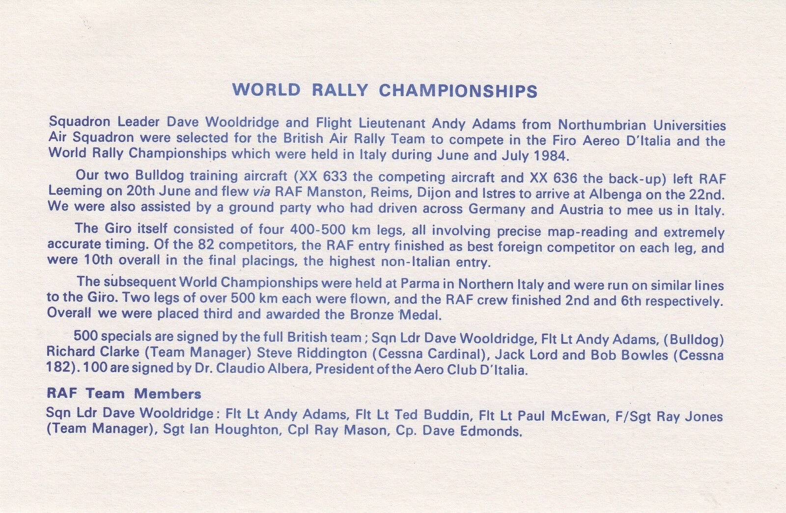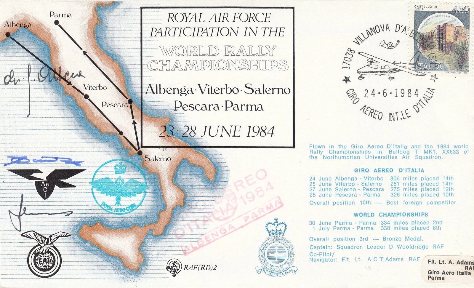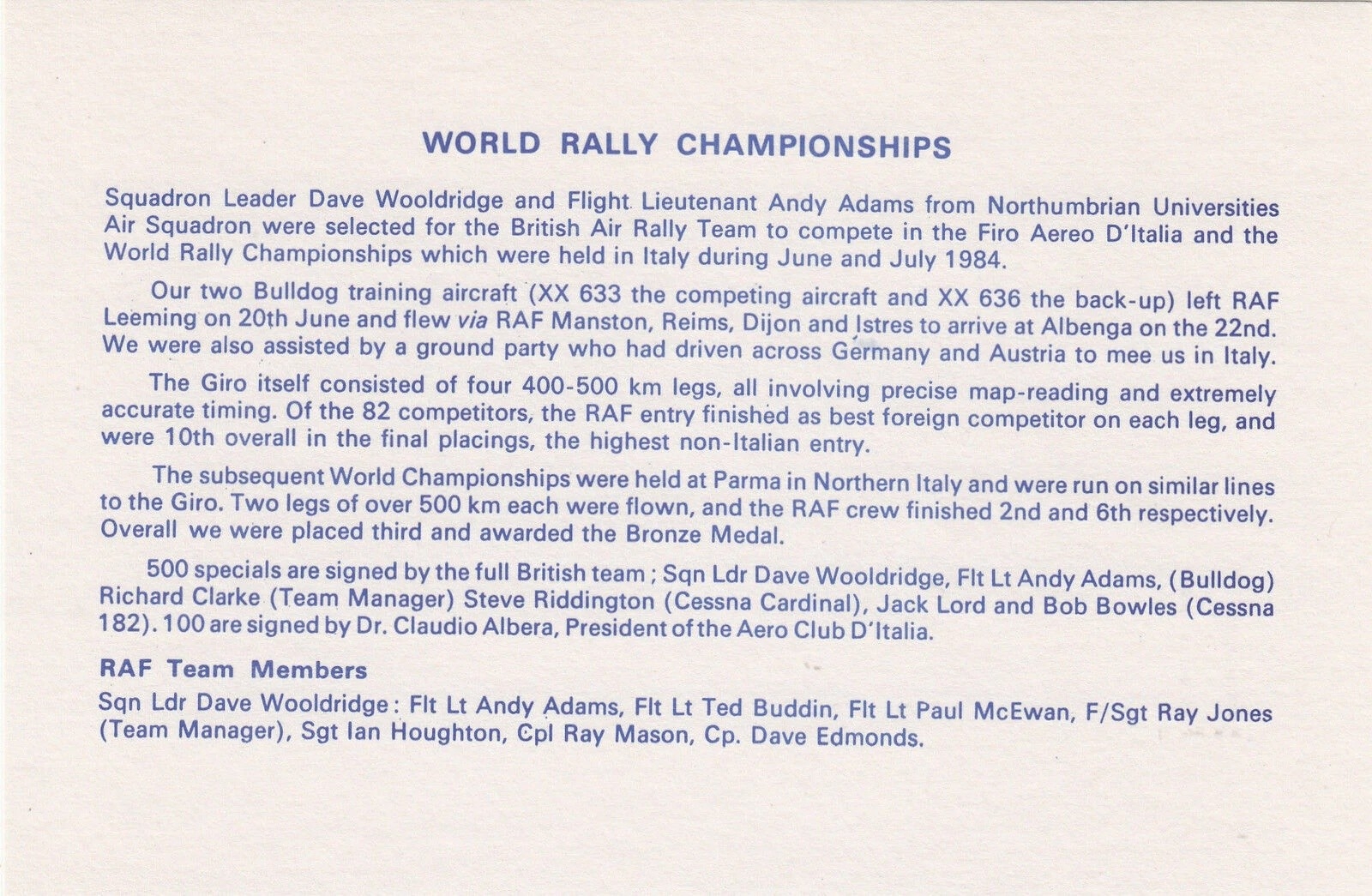 Rare RD2cA World Record Flight The Four Capitals Signed 2 Pilots Plus Dr Claudio Albera. 24 6 1984 Albenga RAF participation in World Rally Championships Albenga - Viterbo - Salerno Pescara Parma. Blue flown cachet Turquoise Royal Aero Club, Turquoise Bomber Command Museum Appeal. Crew Signed Pilot Sqn Ldr D Wooldridge and Navigator Flt Lt A C T Adams Also Signed by Dr Claudio Albera President of the Aero Club Only 100 Signed Copies. See RAF Museum Reference Book for Details. Certified Copy 1600 of 2000. Single Vendor RAF cover collection. Good condition. All autographs come with a Certificate of Authenticity. We combine postage on multiple winning lots and can ship worldwide. UK postage from £5.99, EU from £7.99, Rest of World from £9.99