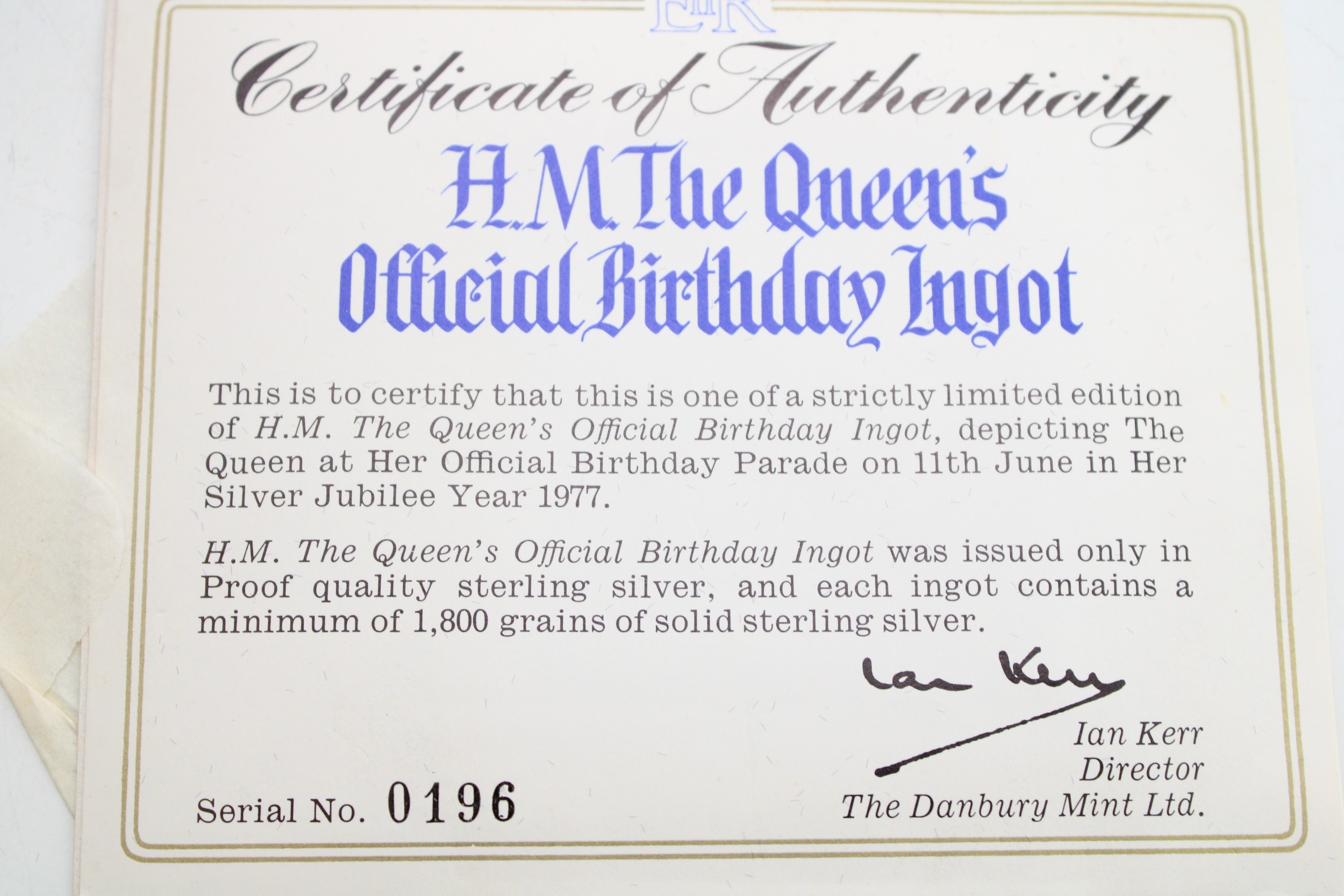 Large hallmarked sterling silver ingot, QEII 1,800 grains / 116g, cased & COA, 1977.