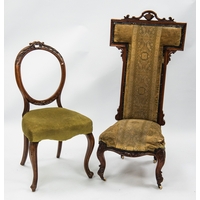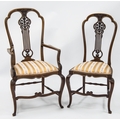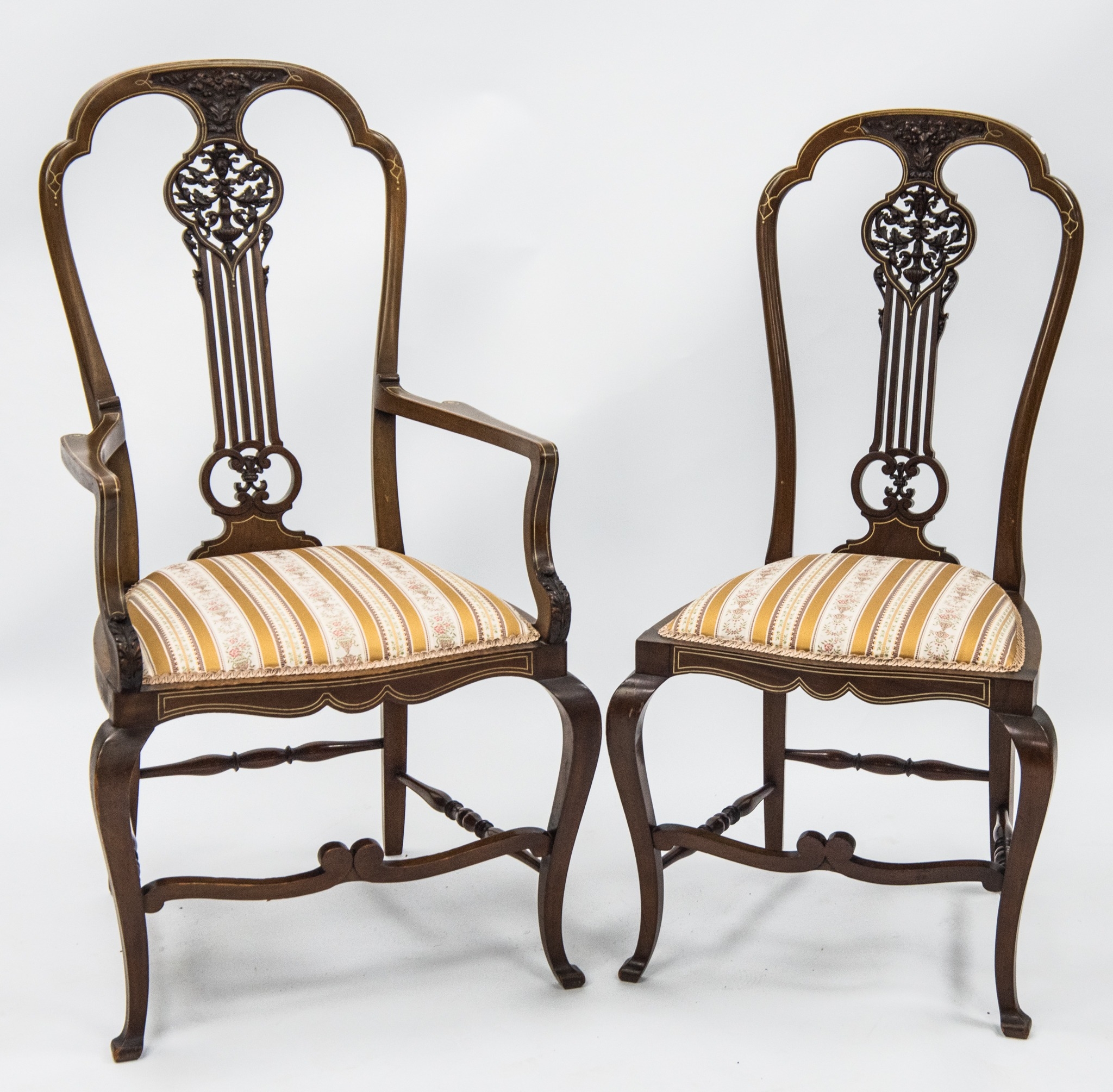 EDWARDIAN CARVED MAHOGANY AND LINE INLAID CARVER CHAIR AND MATCHING SINGLE CHAIR, each with ornate floral carved cresting and conforming pierced panel to the top of the ornate splat, set above a serpentine fronted padded seat, covered in olde gold Regency stripe type fabric, and raised on square cabriole front legs, tied by turned and wavy stretchers, the carver chair with tapering flat arms and acanthus capped scroll supports, (2)