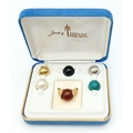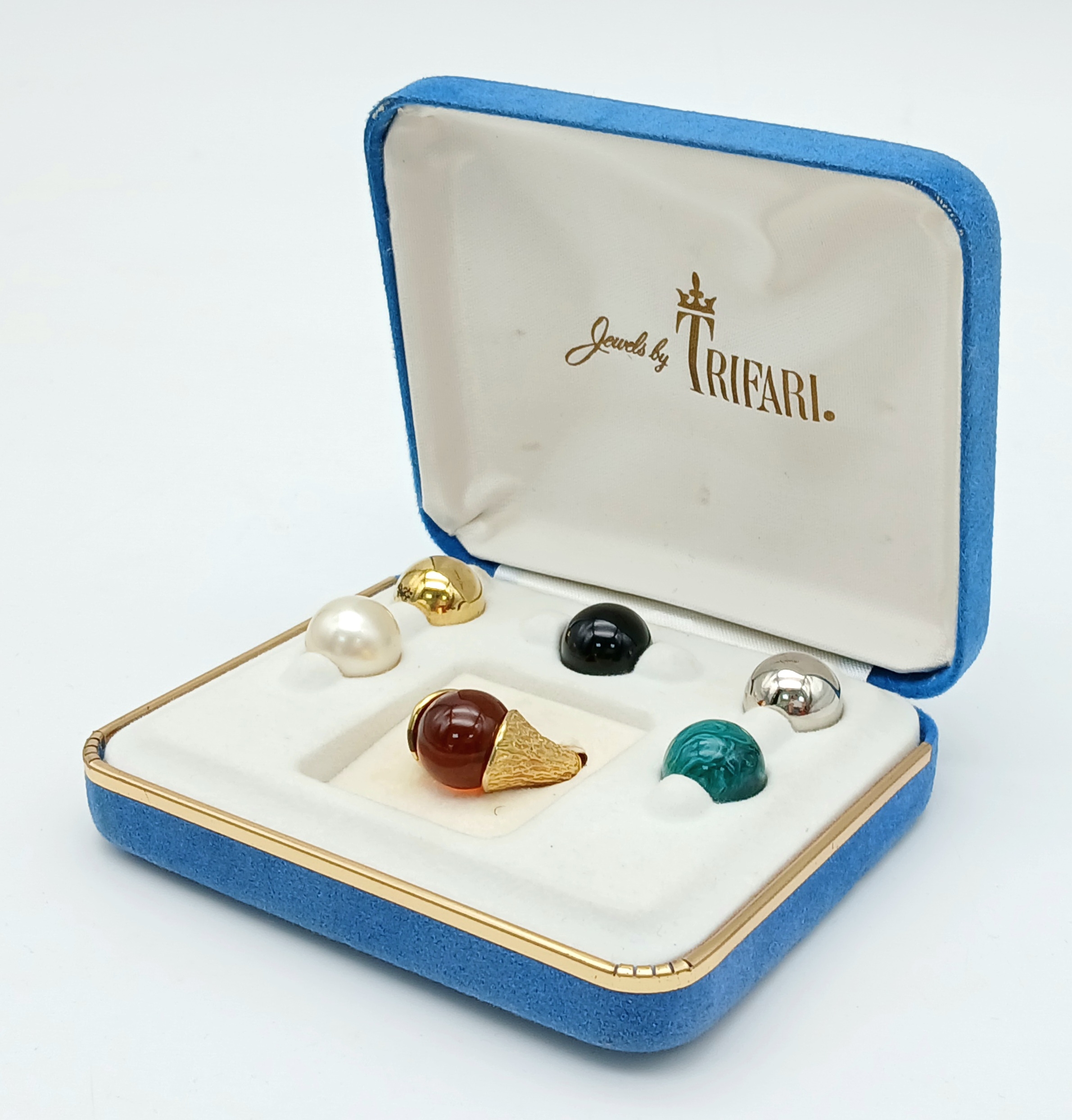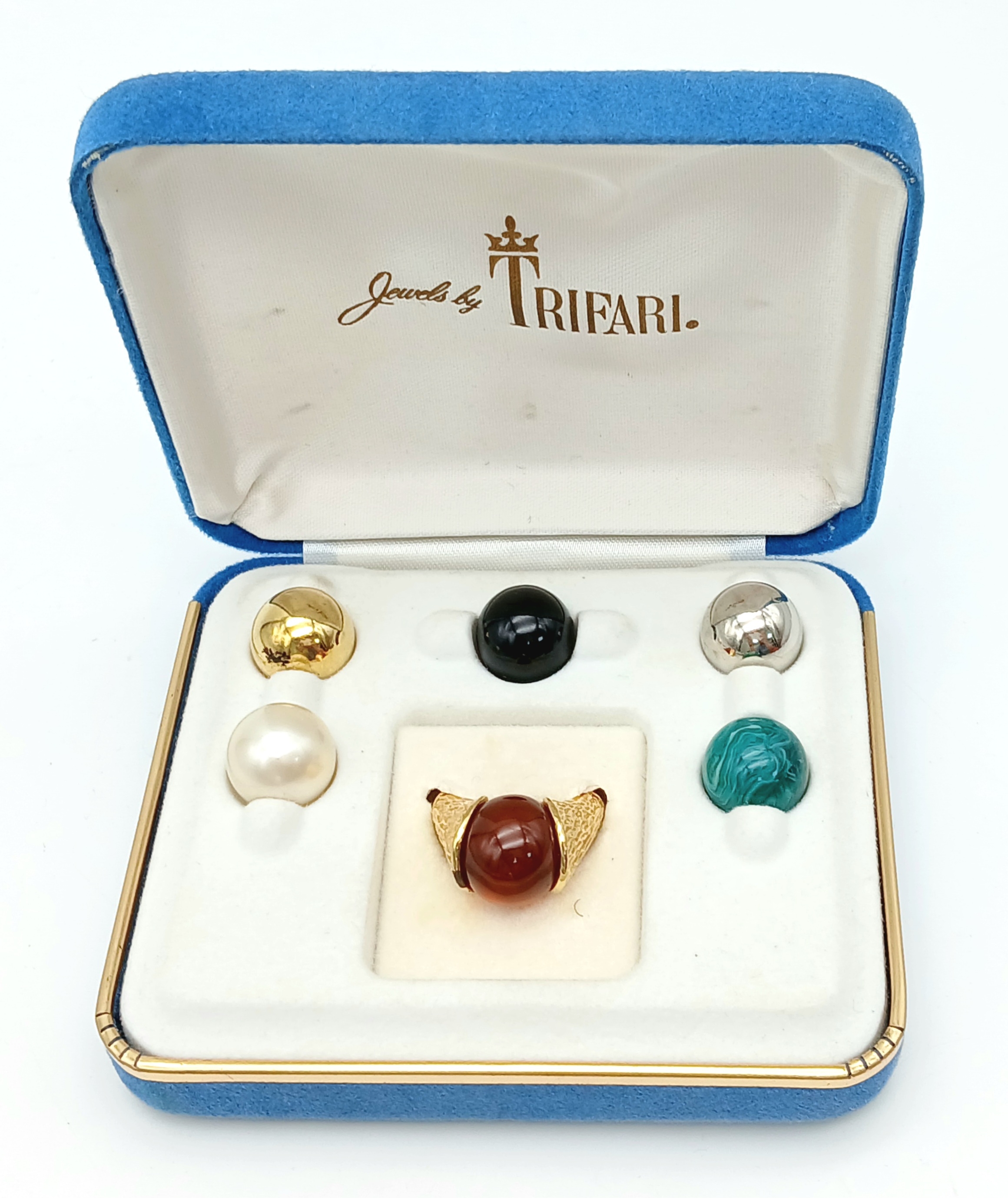 A Rare, Vintage Trifari Interchangeable Ring Set. Size M. Gilded metal. Original packaging. Six options for different moods/occasions. In good condition.
