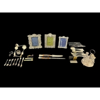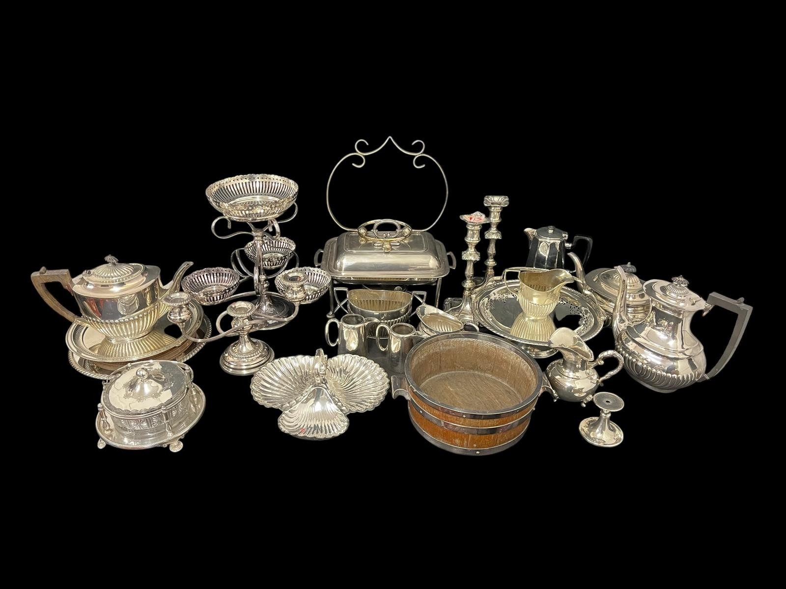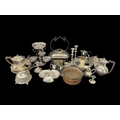 A MISCELLANEOUS COLLECTION to include a plated epergne, a plated entrée dish, a pair of plated candlesticks, coffee pots, teapots, hors d'oeuvre dish, etc.
