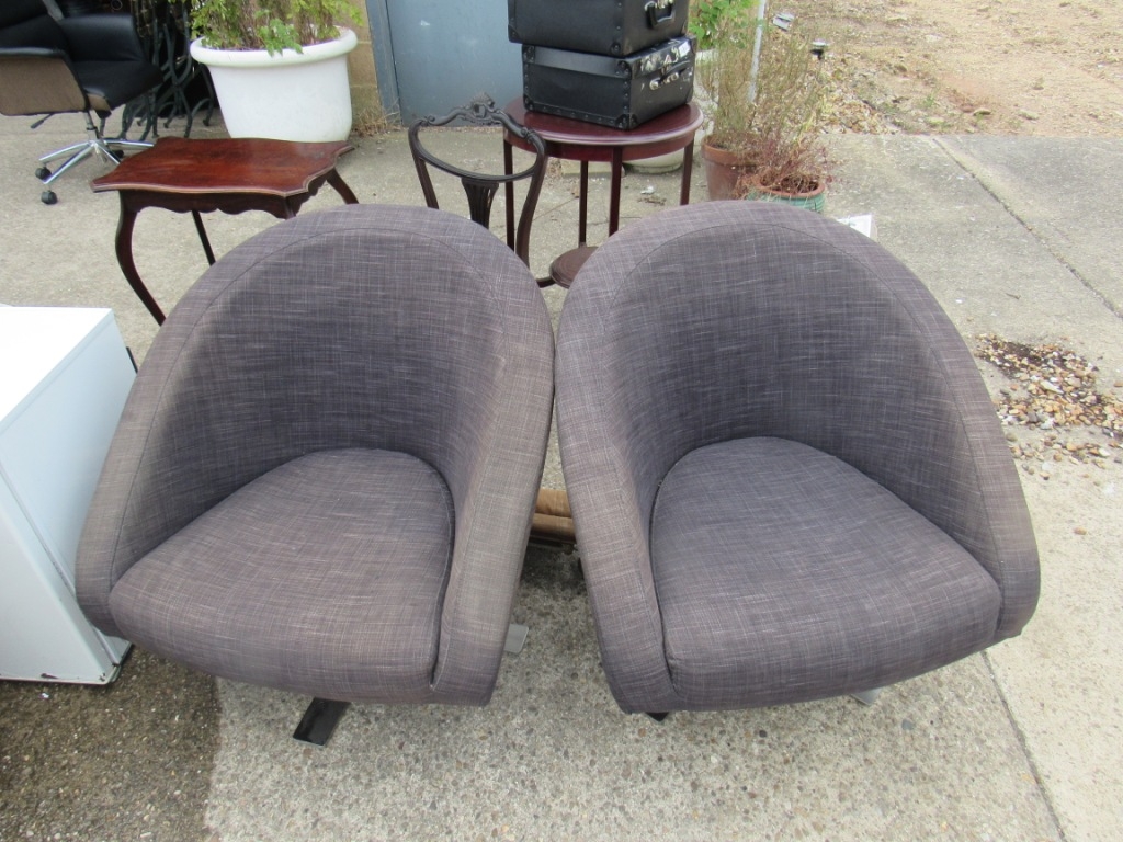 Pair Dwell brown upholstered swivel armchairs