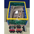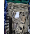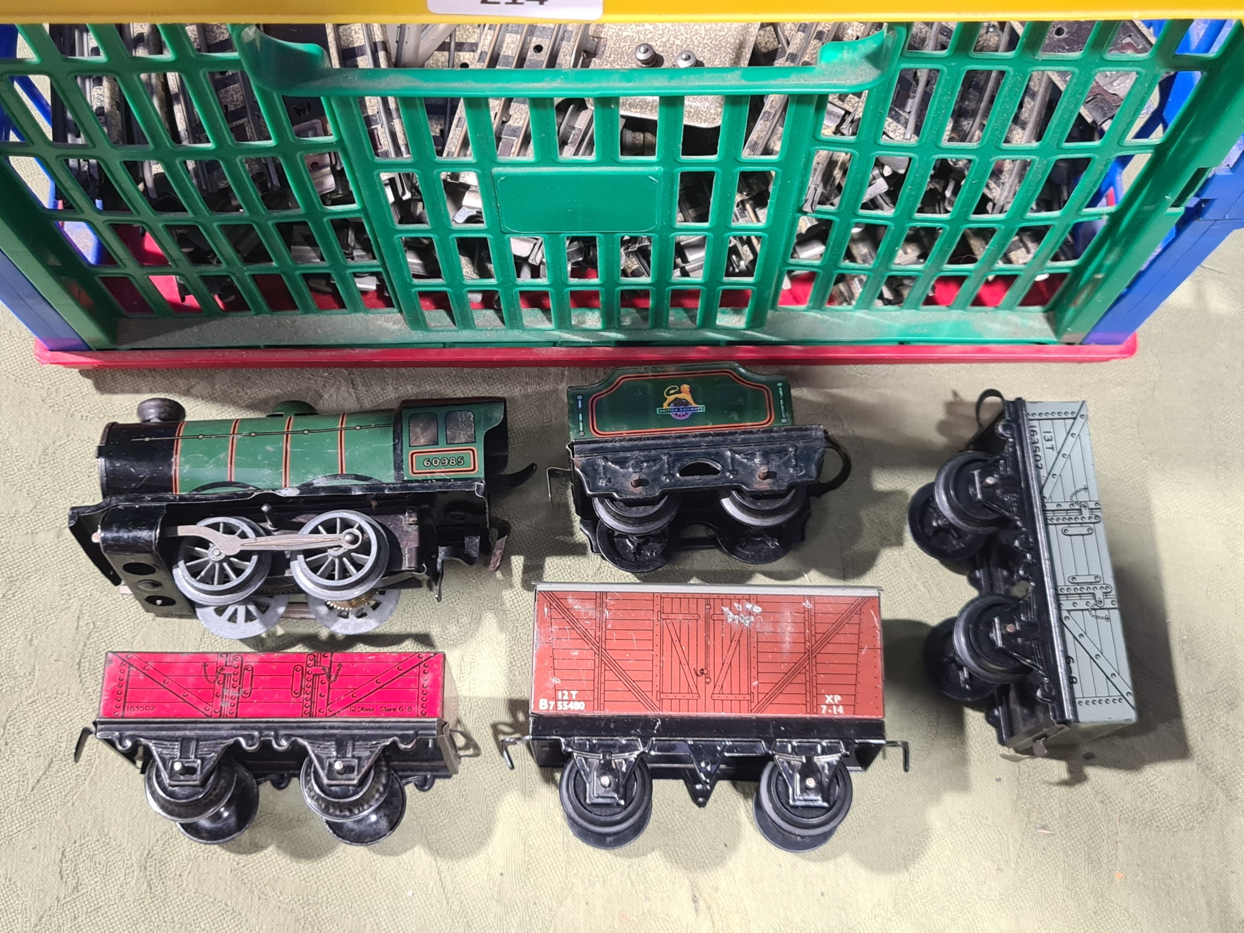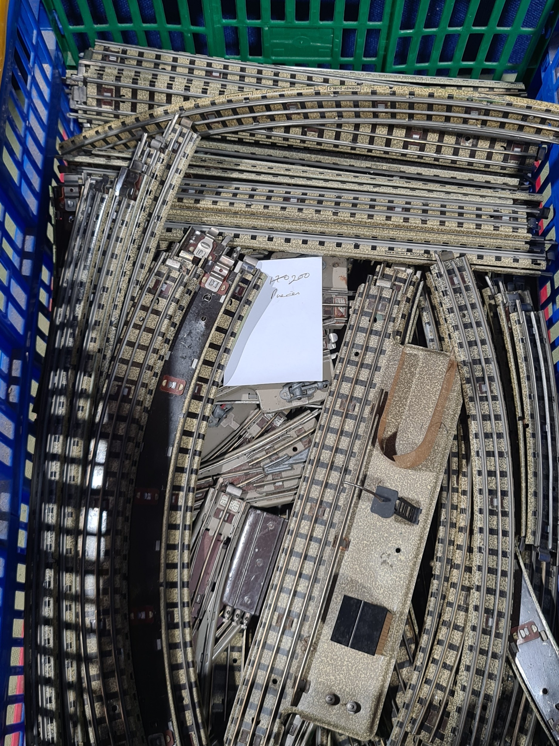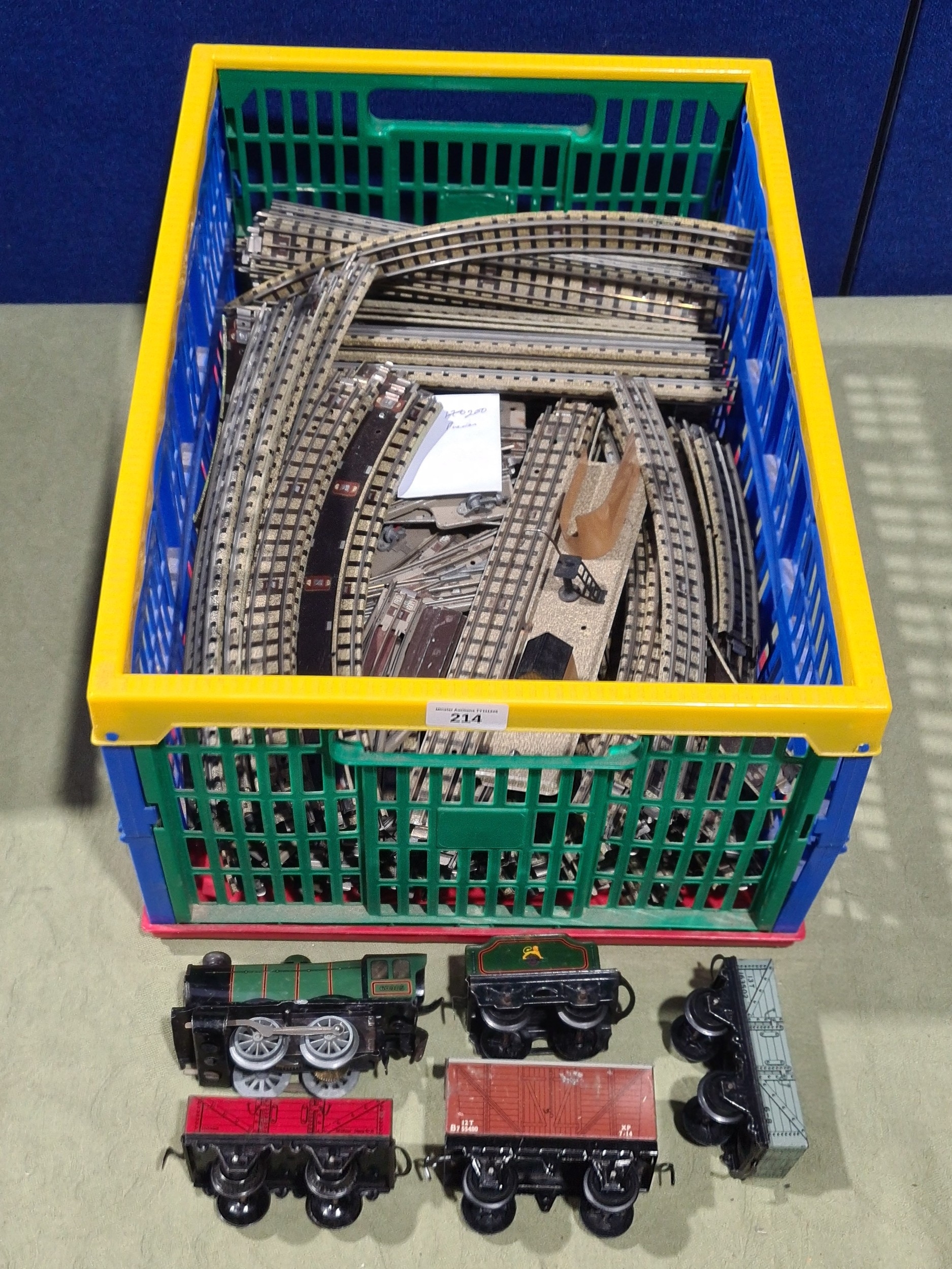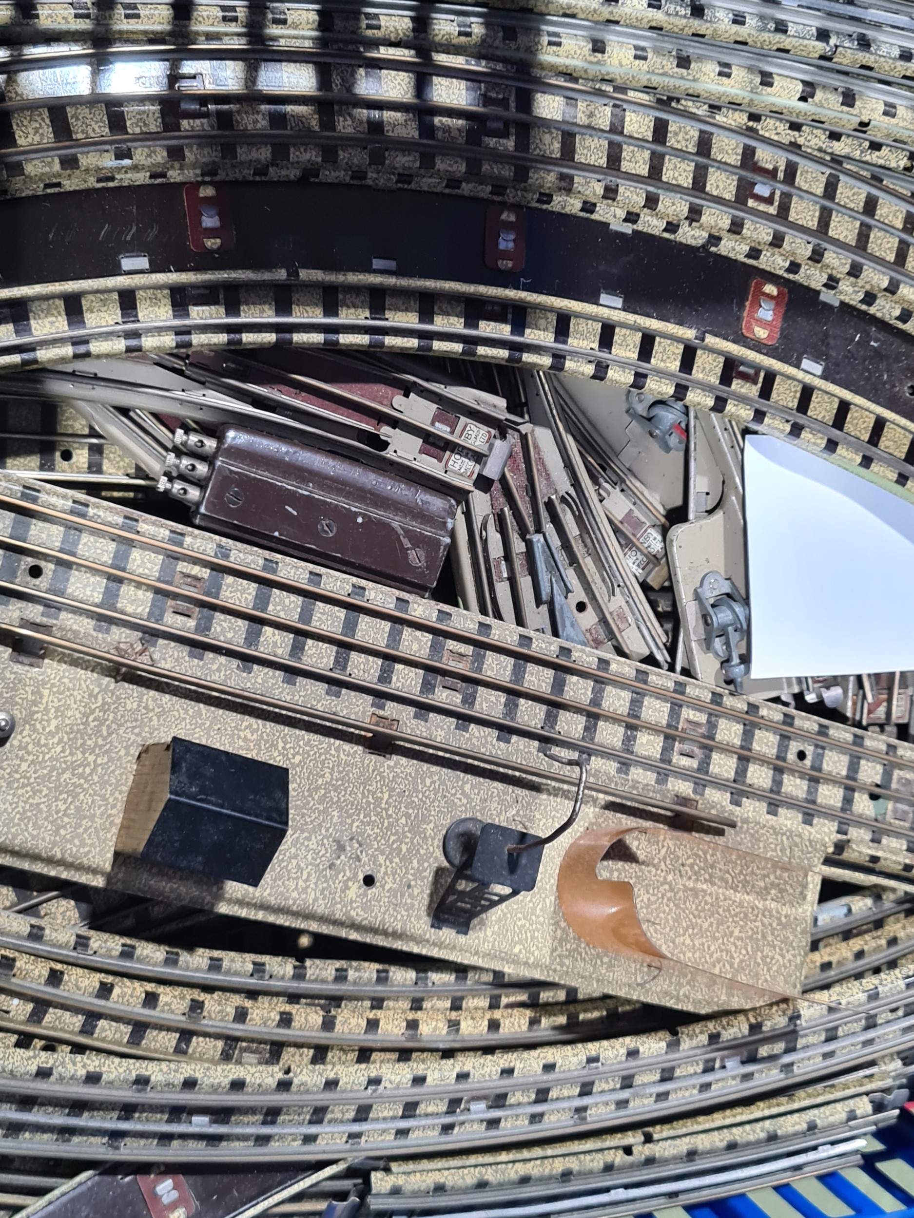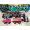 A large quantity of over 200 pieces of Hornby Dublo 3-rail Track including Straights, Electric Points, Short Rails, condition varies, together with Hornby 0 gauge clockwork M0 Locomotive and Wagons