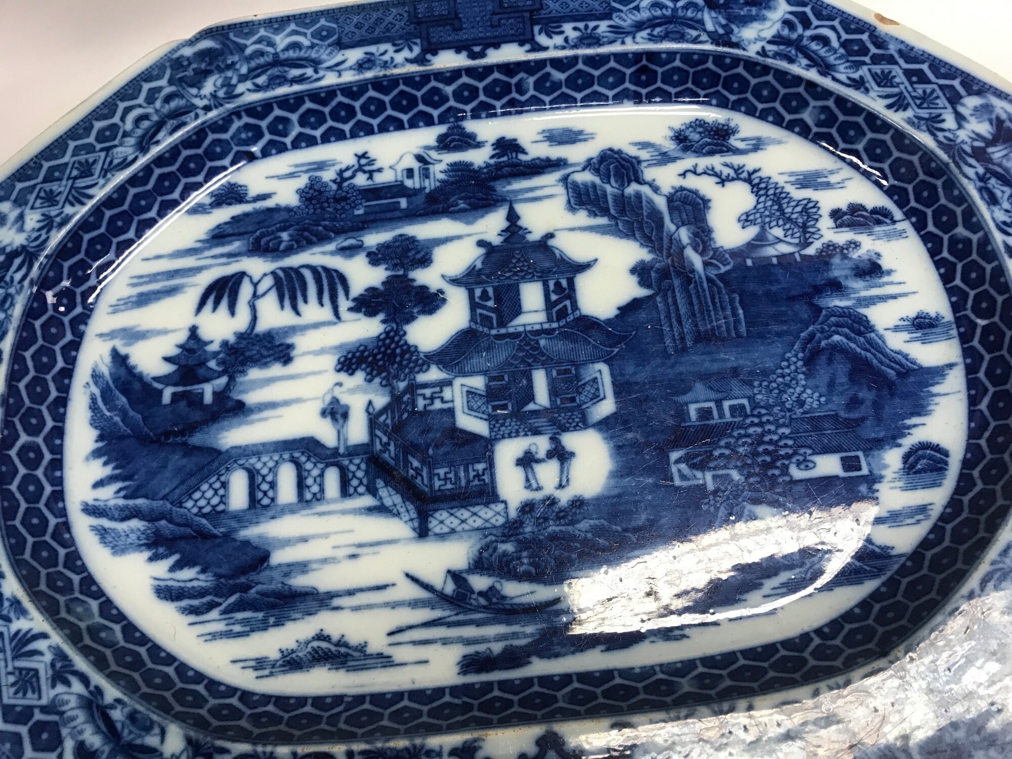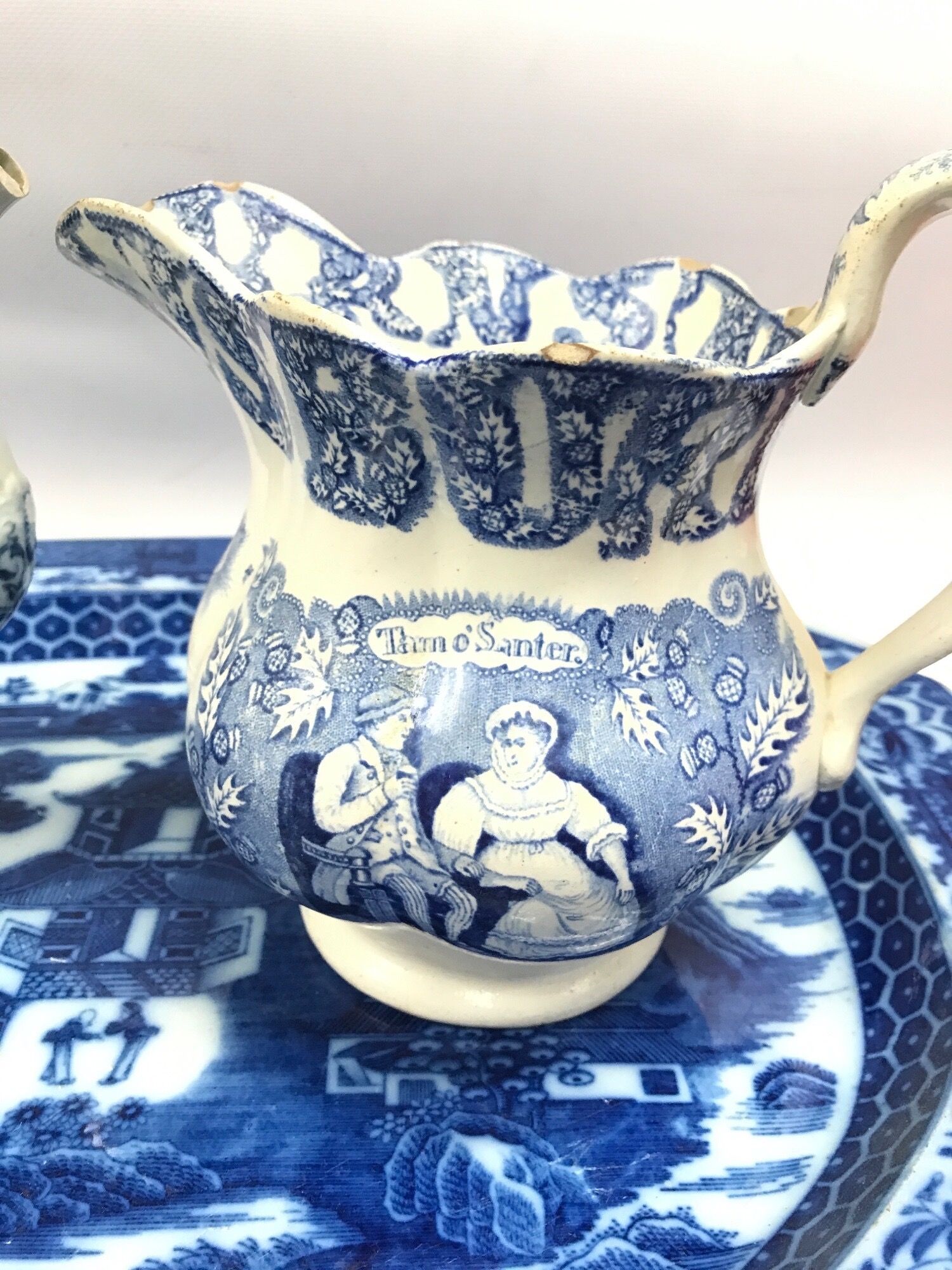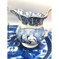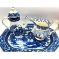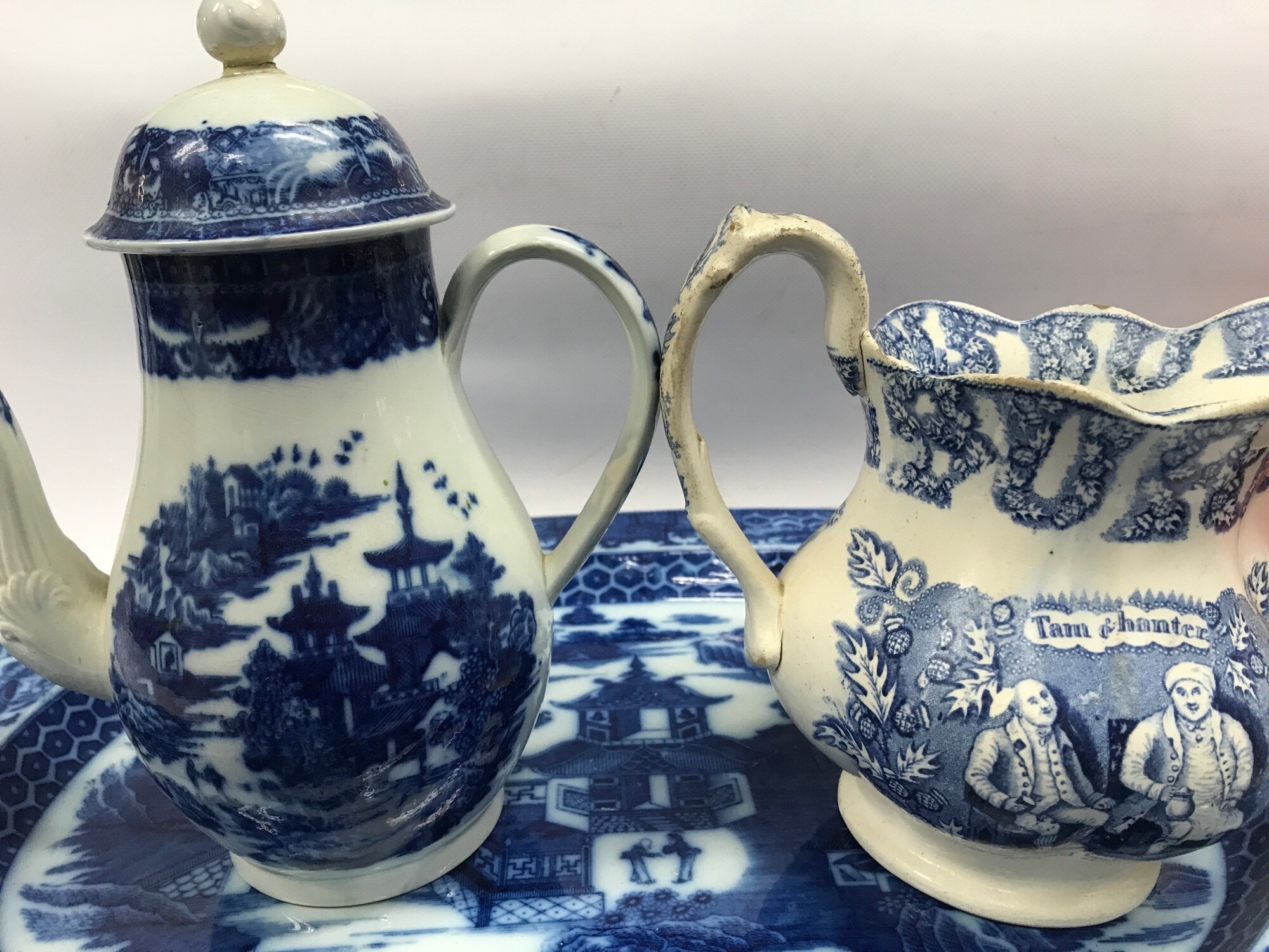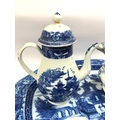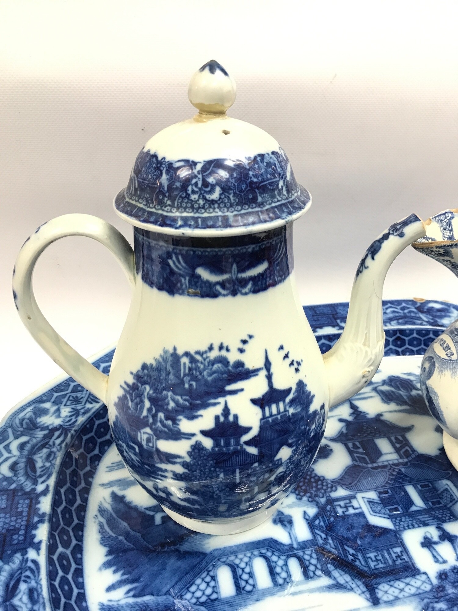 A Worcester type 18th century coffee pot and two other blue and white ceramic items