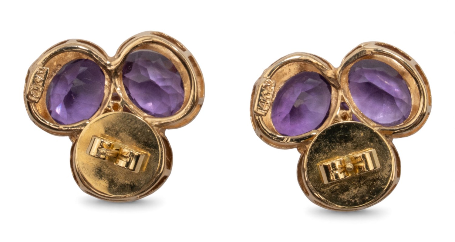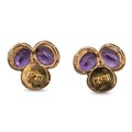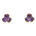 A pair of yellow gold, amethyst and diamond trefoil cluster earrings
