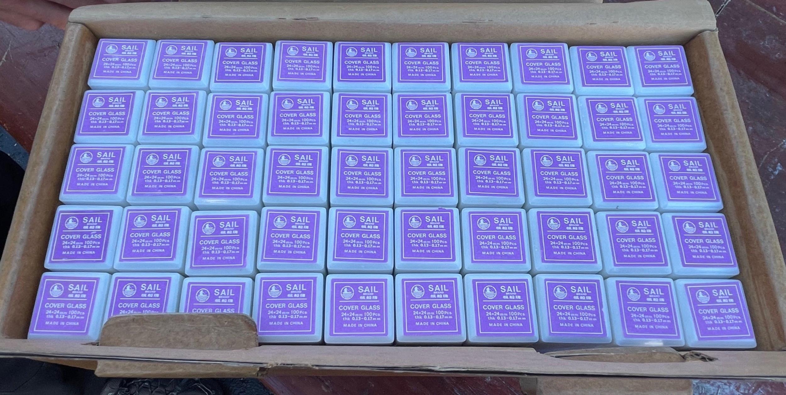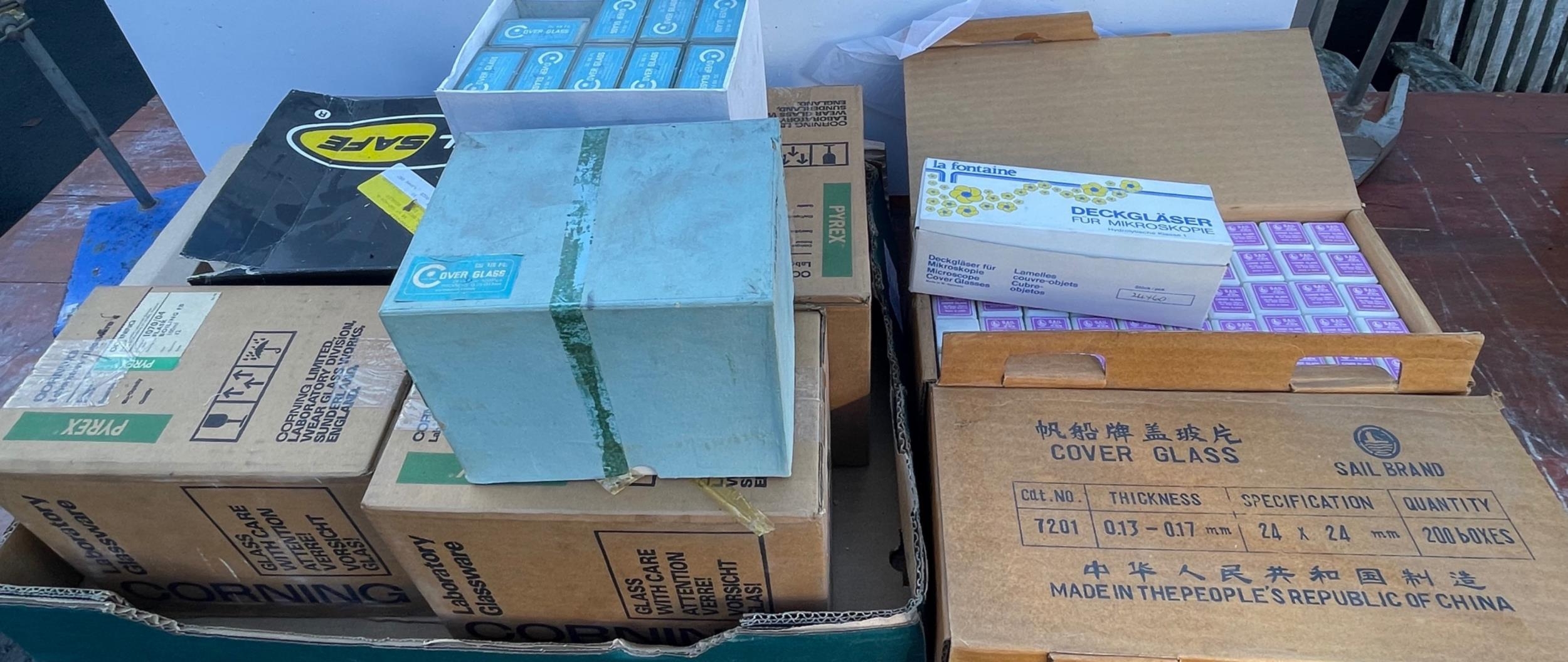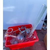 Peebles High School fund raising - A large tray to include a HUGE AMOUNT of assorted laboratory cover glass and three boxes of boiling flasks etc