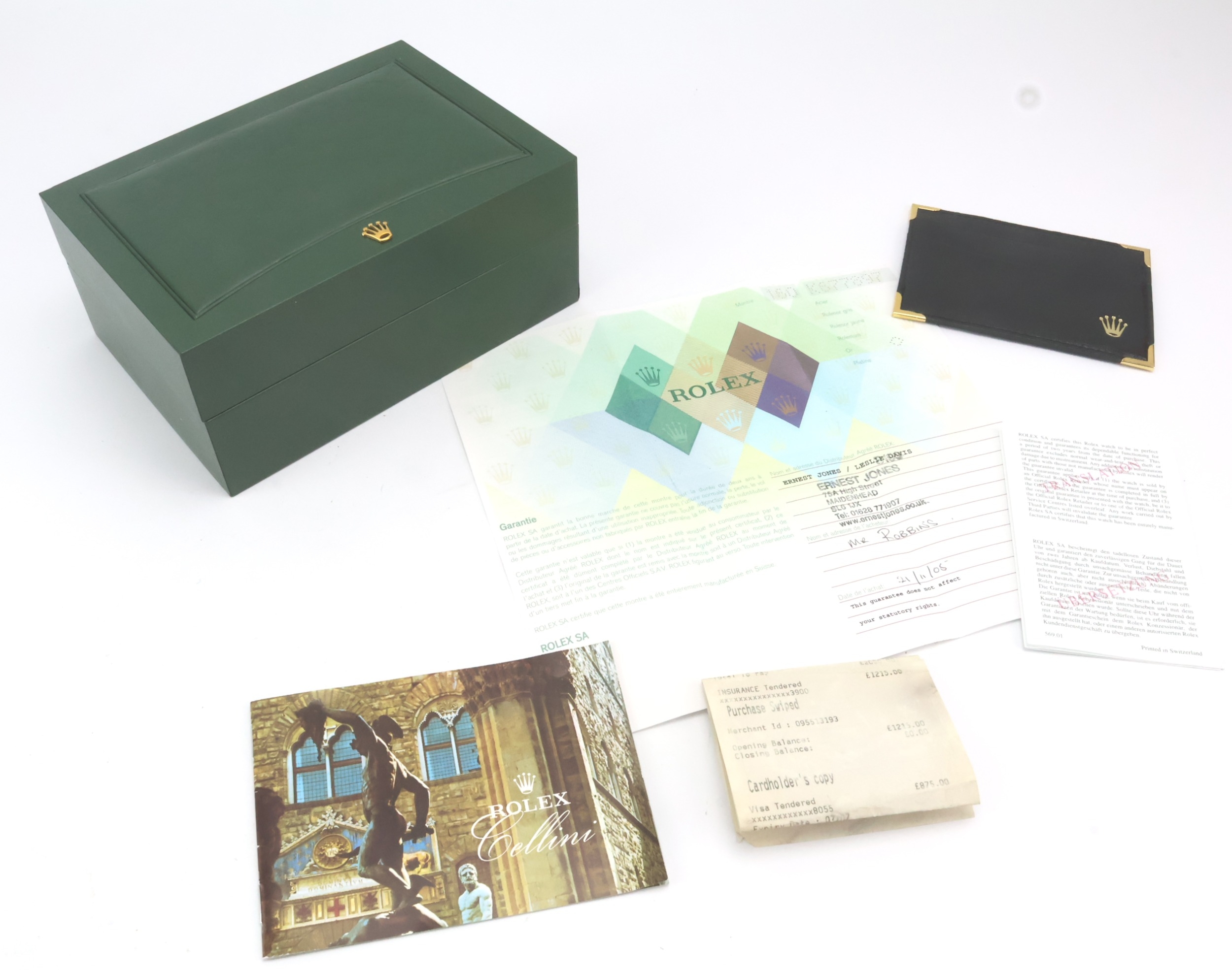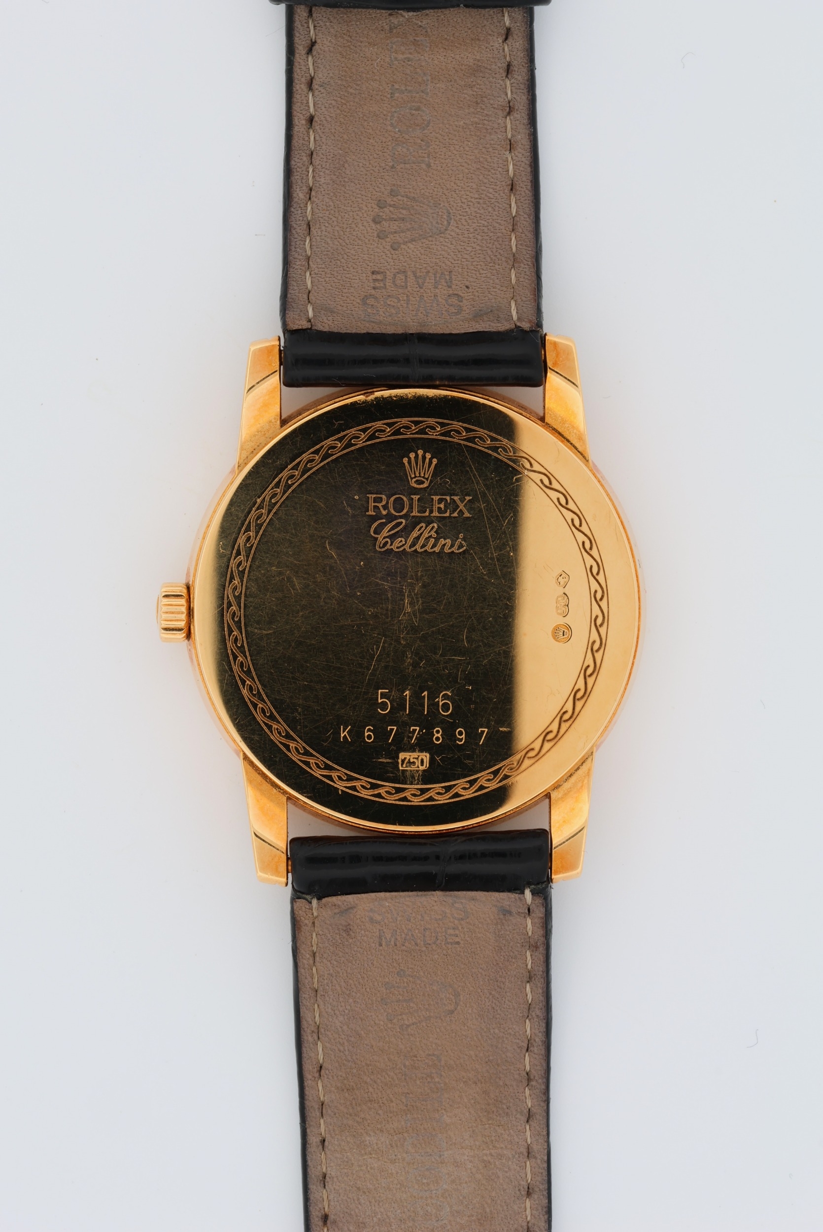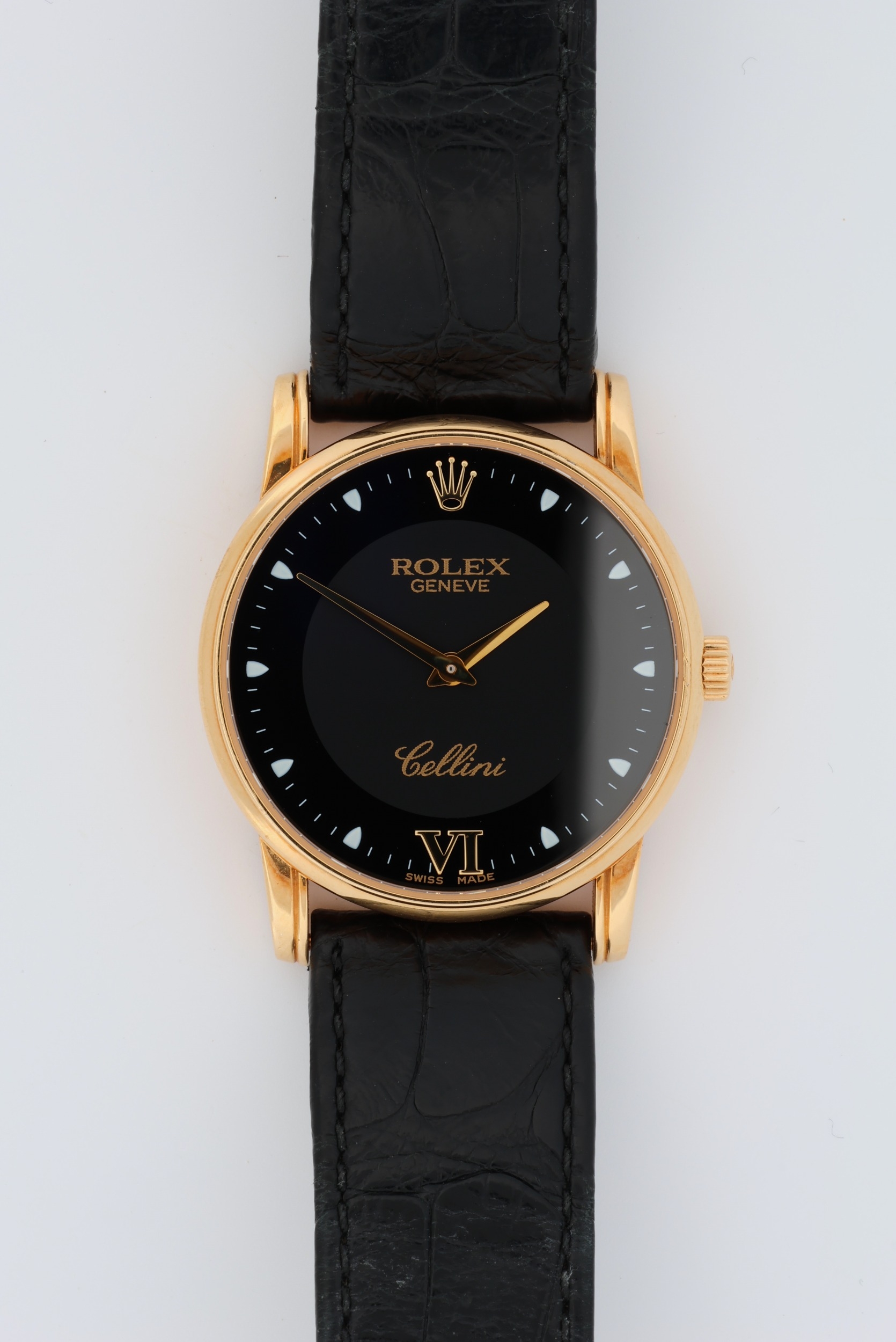 Rolex Cellini Classic, 18ct yellow gold, ref. 5116/8, K serial (purchased 2005). The black dial two tone with triangular indices, Roman numeral VI applied. Rolex manual winding cal.1602 movement, signed strap and 18ct buckle, 32mm case, complete with box and paperwork. Working when catalogued