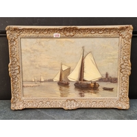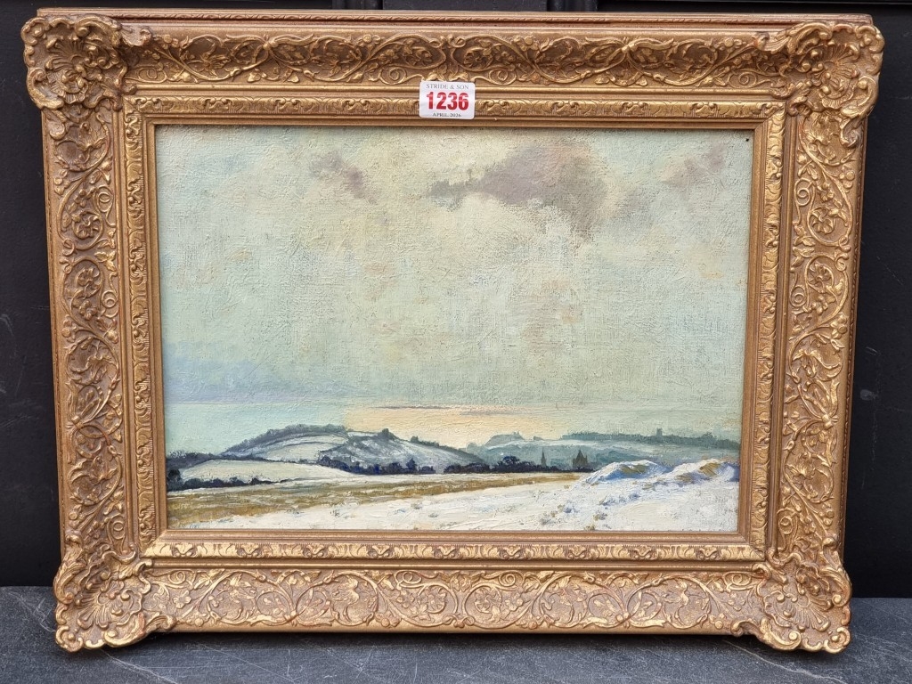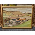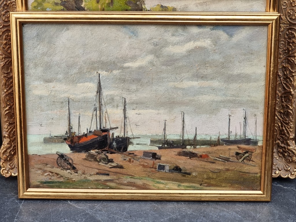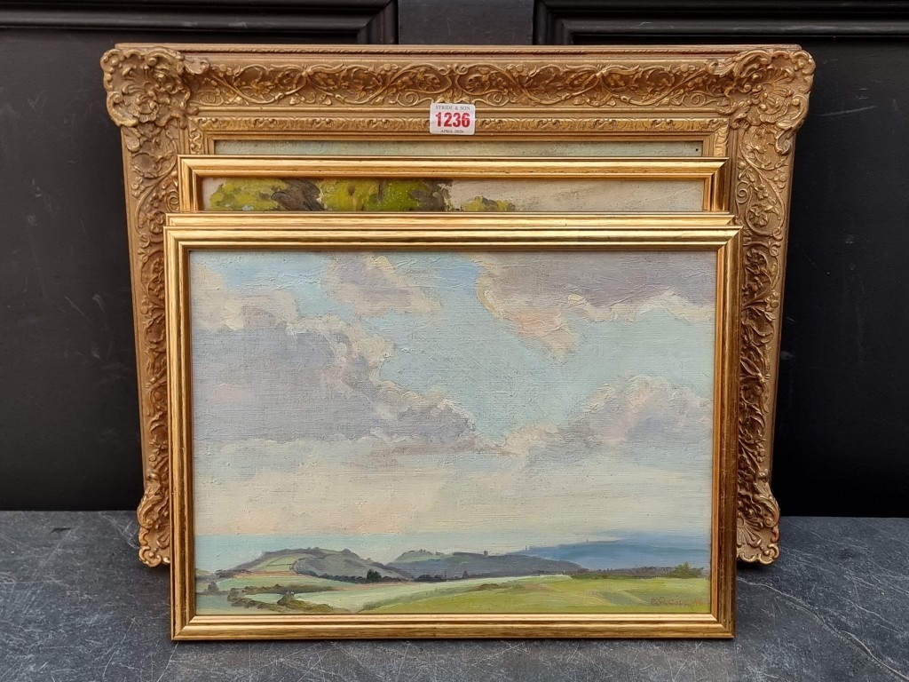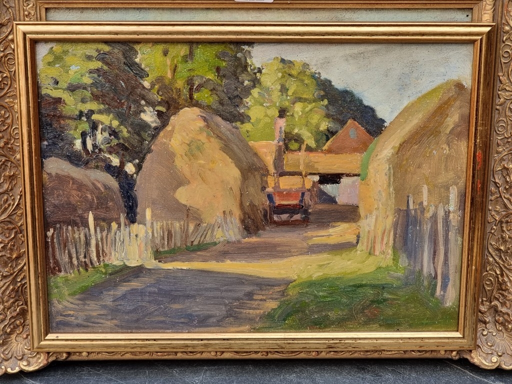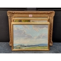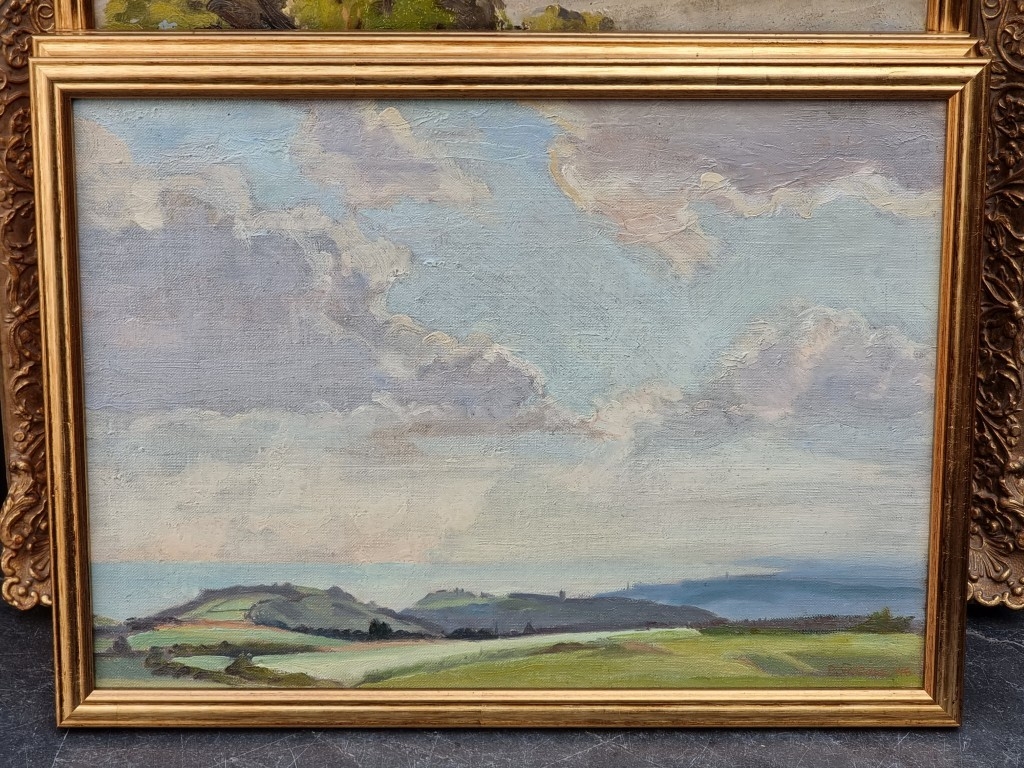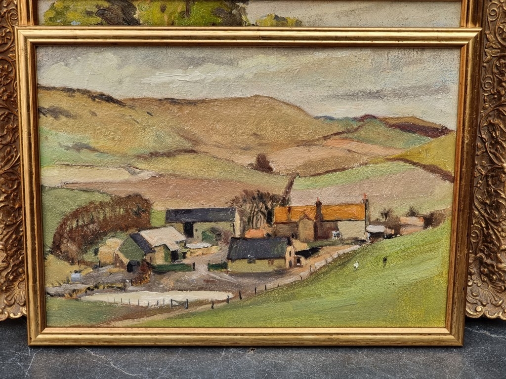 Philip W Cole, 'Hastings from Fairlight Down'; Waiting for the Tide, Hastings Harbour'; 'Sussex Downs'; 'A Sussex Stack Yard', a set of four, two signed and dated, oil on board, 24.5 x 34.5cm; together with another by the same hand, signed and dated '47, 24 x 34cm. (5)