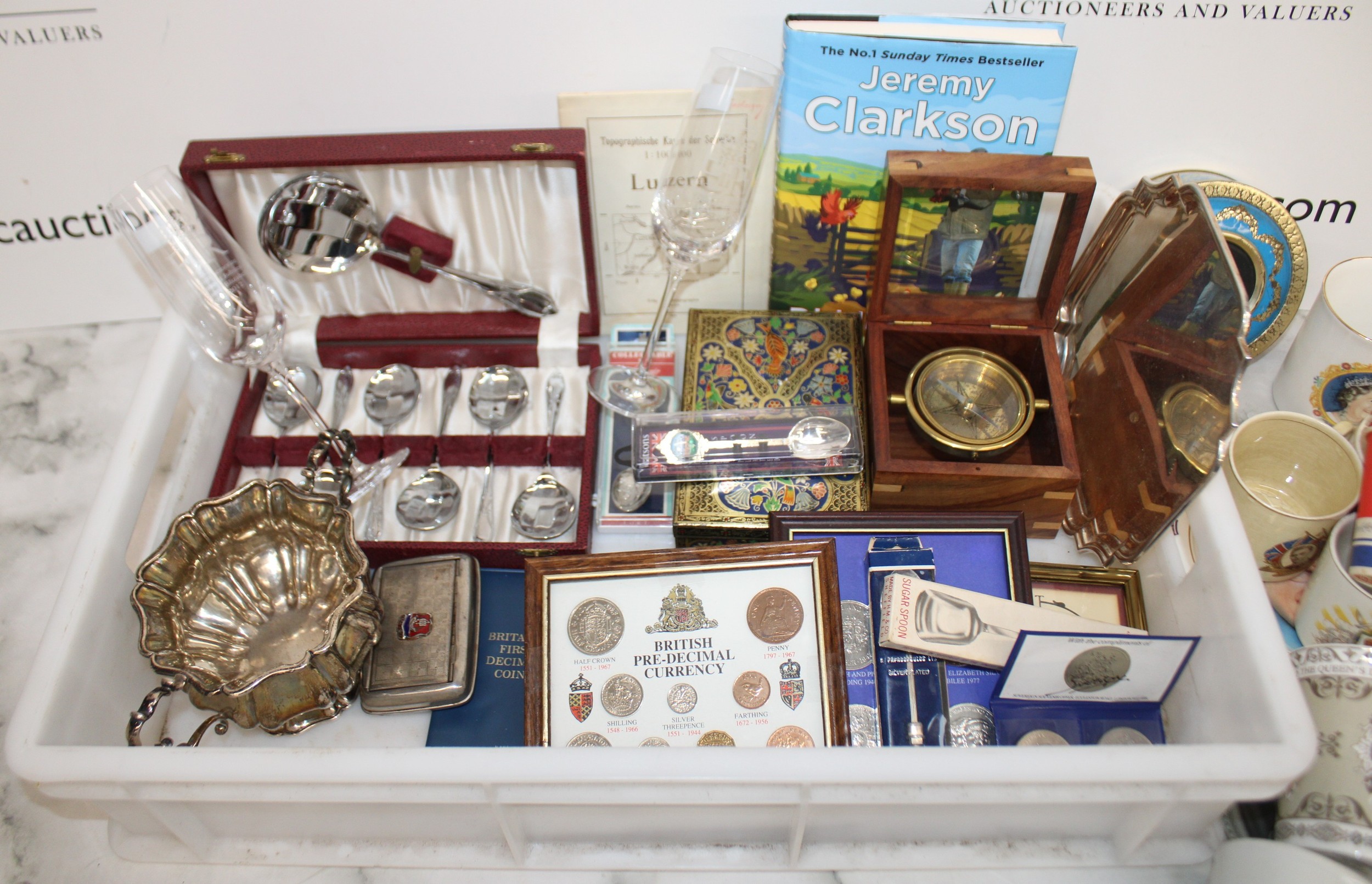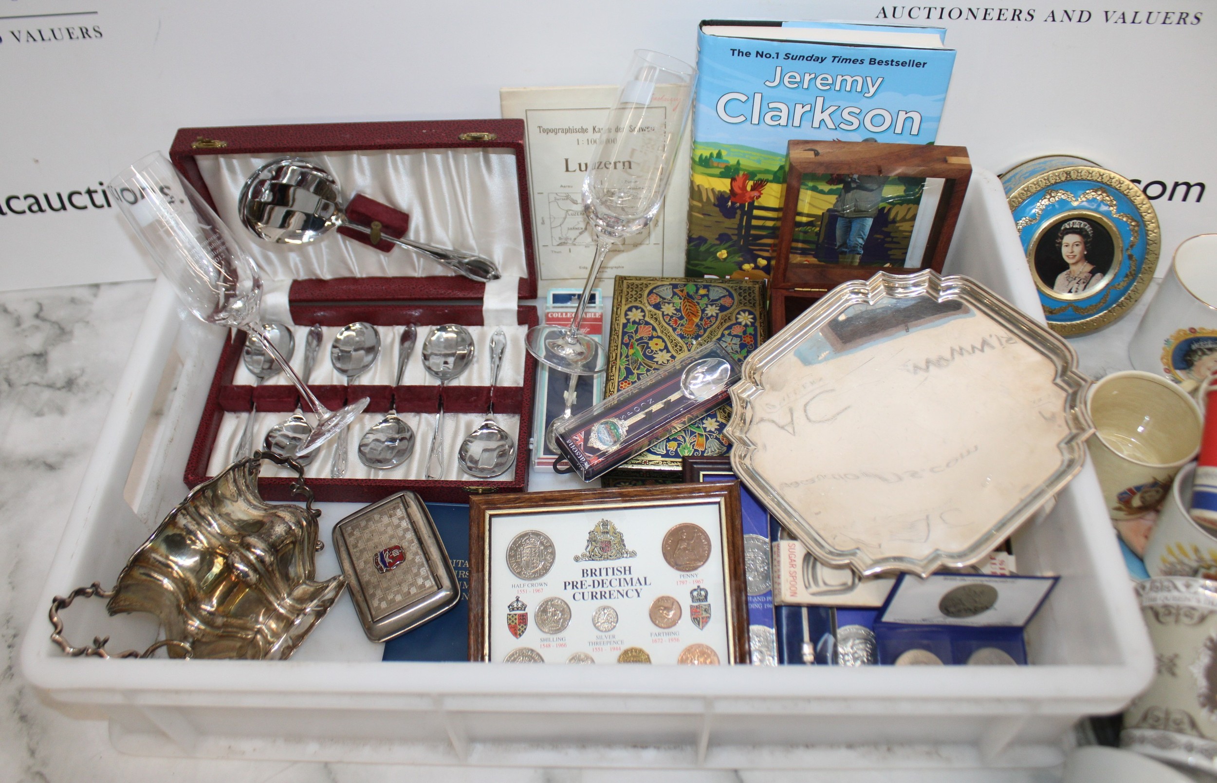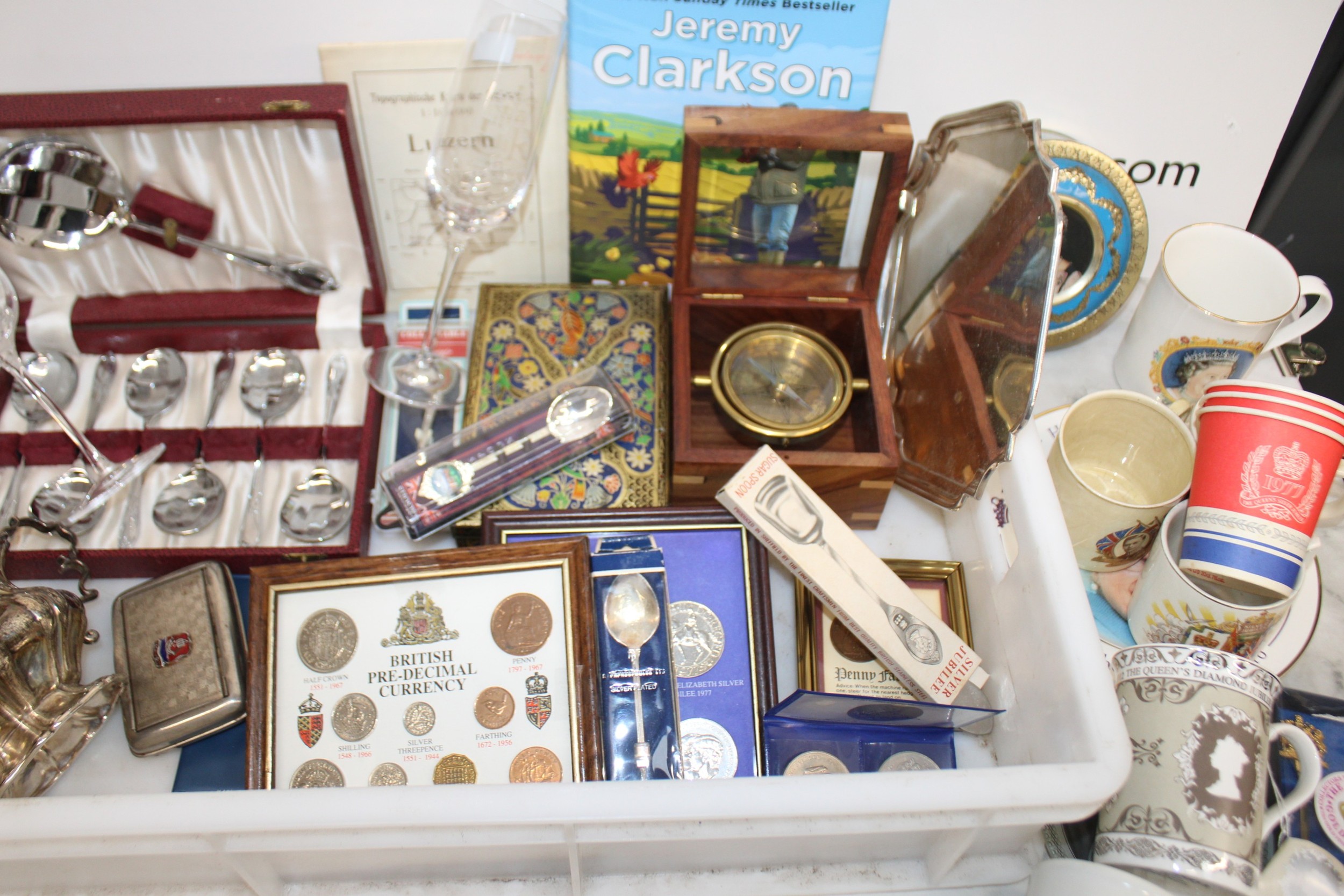 Mixed Collectable Items Inc- Silver Plate/Coins/Royalty/Tins/Etc All AS Found Tray Not IncludedCOLLECTION ONLY