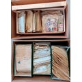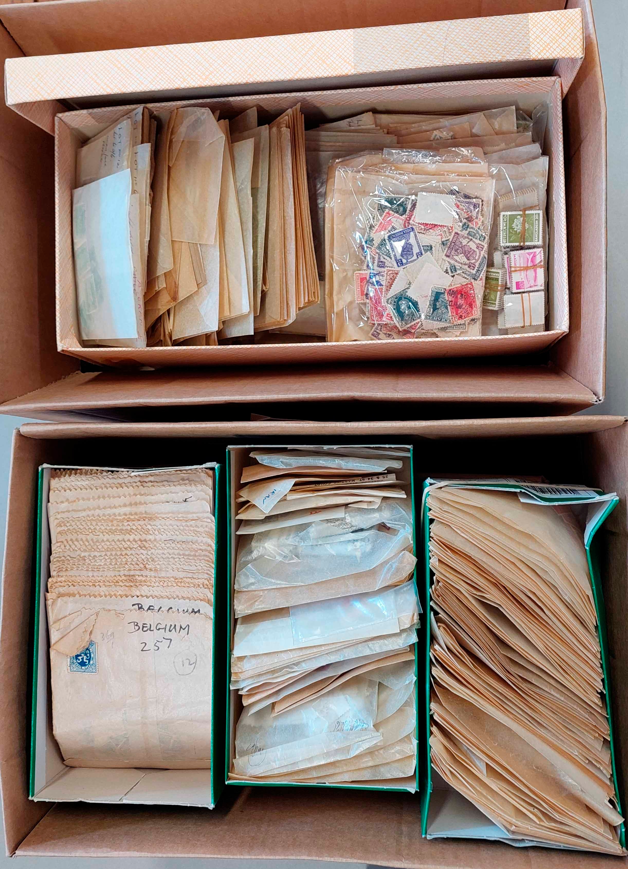FOREIGN ACCUMULATION: Two cartons housing shoeboxes containing packets of sorted stamps with much duplication; a qty of Germany & India; box of covers inc. some FDCs, a few airmails, some USA covers, some souvenir covers; etc. (Many 1000s) Cross Reference: FIRST DAY COVERS, GERMANY, INDIA, UNITED STATES OF AMERICA